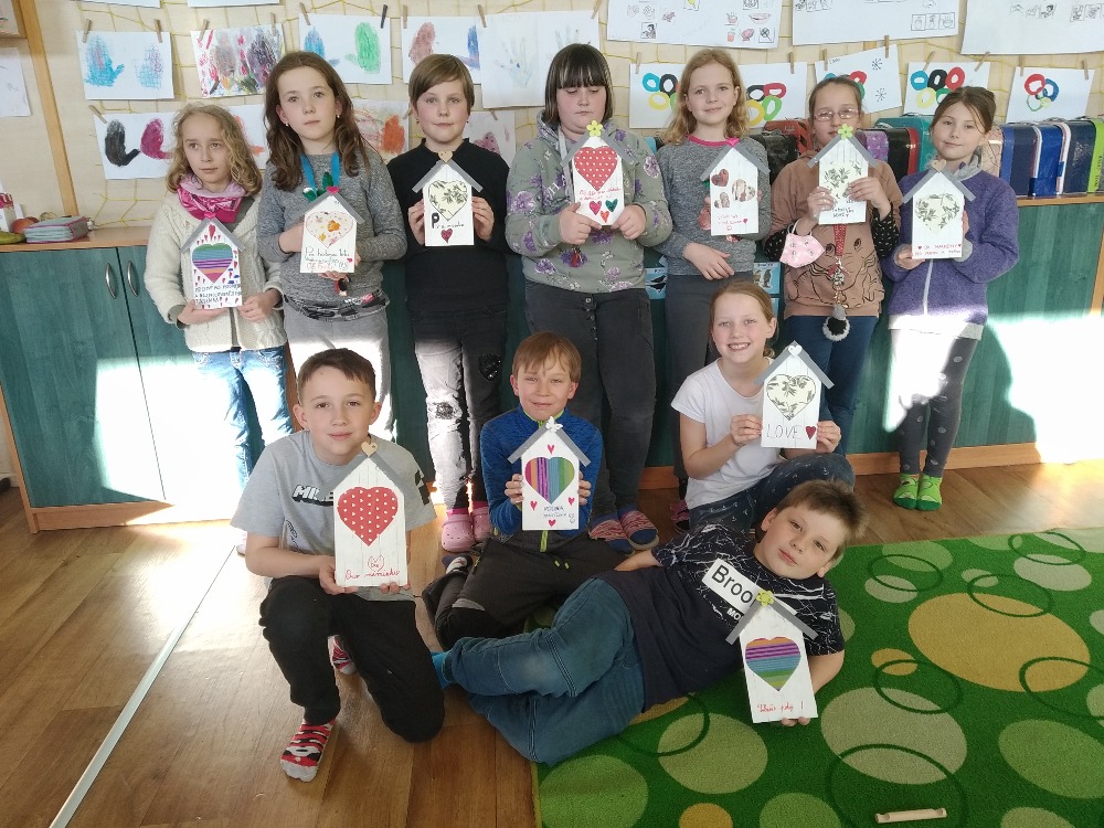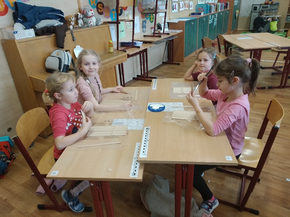 Na Tvořílku i další 3 skupiny pracovaly se stejným materiálem jako předchozí, a to s podpalovými dřívky. Jelikož se zima pomalu nachýlila ke svému konci a přiblížilo se jaro, tak se místo sněhuláků vyráběly domečky.