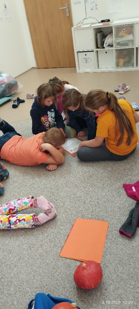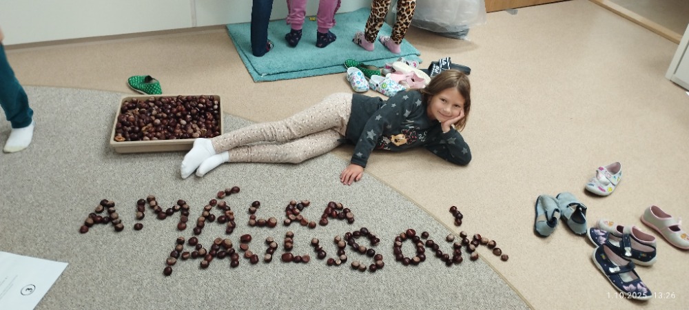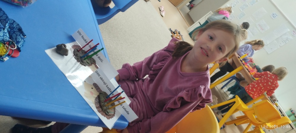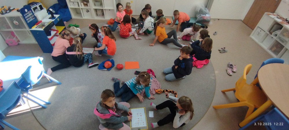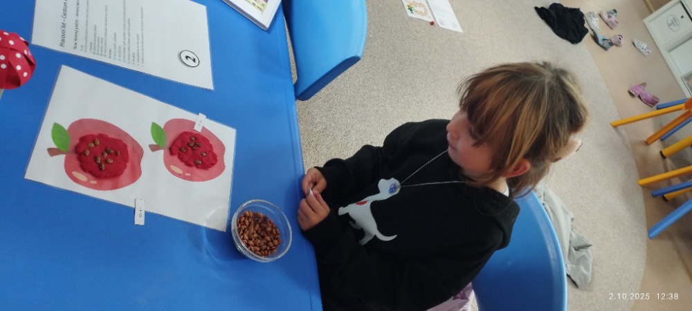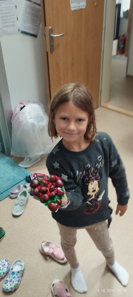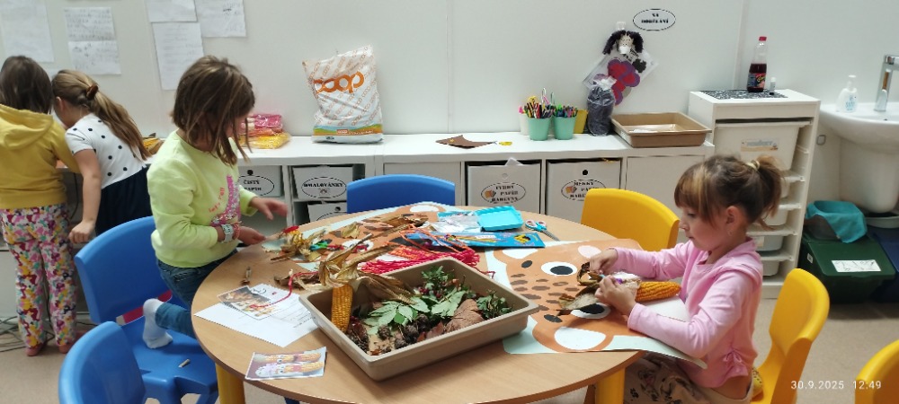 V komunitním kruhu jsme si povídali o barvách podzimu. V ateliéru jsme tvořili podzimní dekorace – kukuřičného strašáka, kaštanové srdíčko, ježečky z kaštanů, srdce z drátu a šípků a malovali jsme sádrové odlitky dýní - vždy podle barvy dne. V knihách a písmenech jsme skládali jména z kaštanů a četli podzimní texty s porozuměním – děti vyhledávaly správné věty jako odpovědi. V manipulačních hrách jsme si hráli s modelínou – děti vkládaly kukuřičná zrnka do klasu (počítání příkladů), bodlinky ježečkovi (počítání slov ve větách) a semínka do jablíčka (počítání příkladů). Děti si tím prohlubují své znalosti a nebo zdokonalují, co ještě tolik nejde a to vše pomocí hry. Nakonec jsme si zahráli hru „Odnes úrodu domů před zimou“.