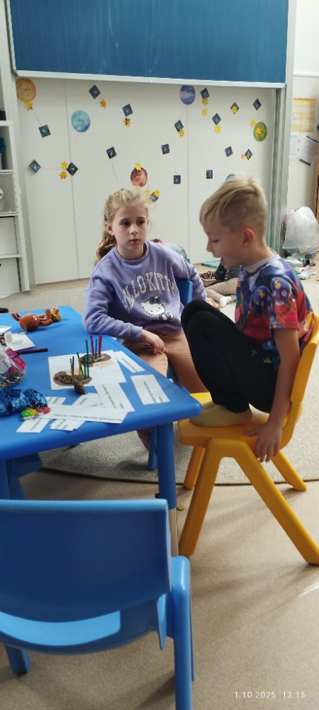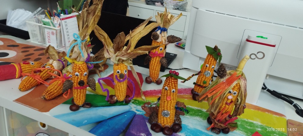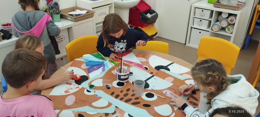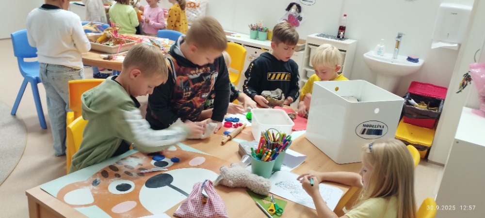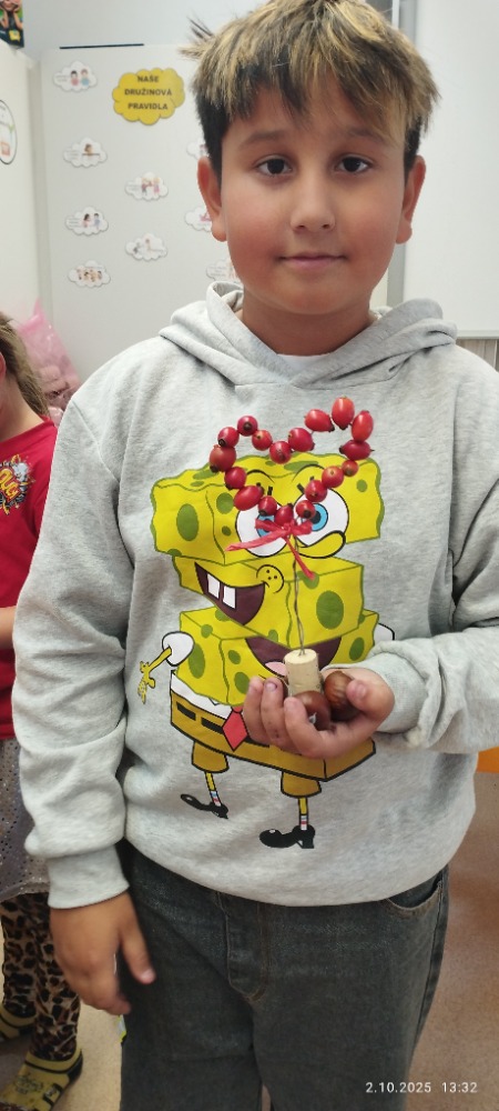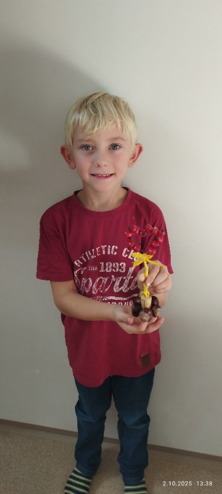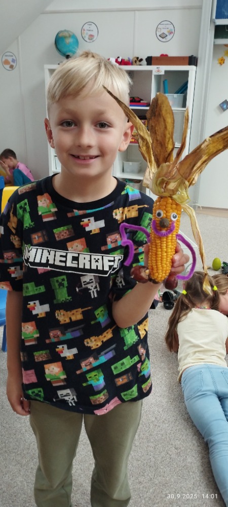 V komunitním kruhu jsme si povídali o barvách podzimu. V ateliéru jsme tvořili podzimní dekorace – kukuřičného strašáka, kaštanové srdíčko, ježečky z kaštanů, srdce z drátu a šípků a malovali jsme sádrové odlitky dýní - vždy podle barvy dne. V knihách a písmenech jsme skládali jména z kaštanů a četli podzimní texty s porozuměním – děti vyhledávaly správné věty jako odpovědi. V manipulačních hrách jsme si hráli s modelínou – děti vkládaly kukuřičná zrnka do klasu (počítání příkladů), bodlinky ježečkovi (počítání slov ve větách) a semínka do jablíčka (počítání příkladů). Děti si tím prohlubují své znalosti a nebo zdokonalují, co ještě tolik nejde a to vše pomocí hry. Nakonec jsme si zahráli hru „Odnes úrodu domů před zimou“.
