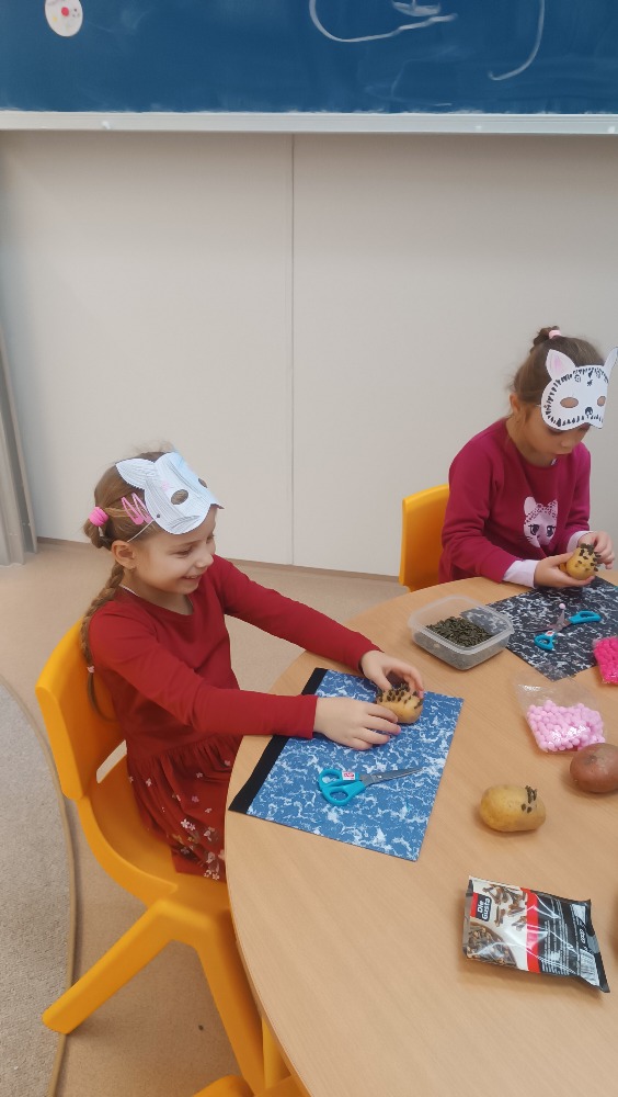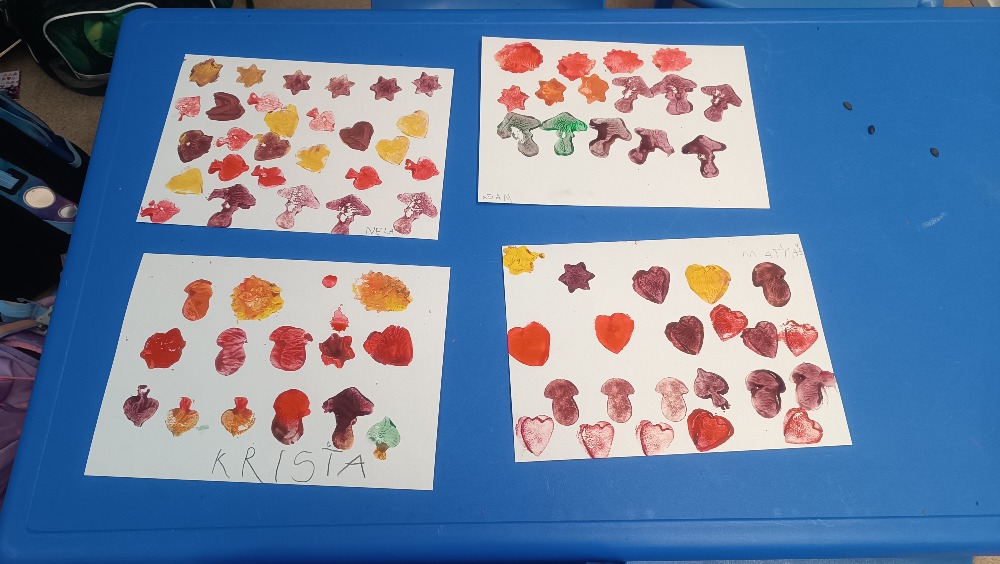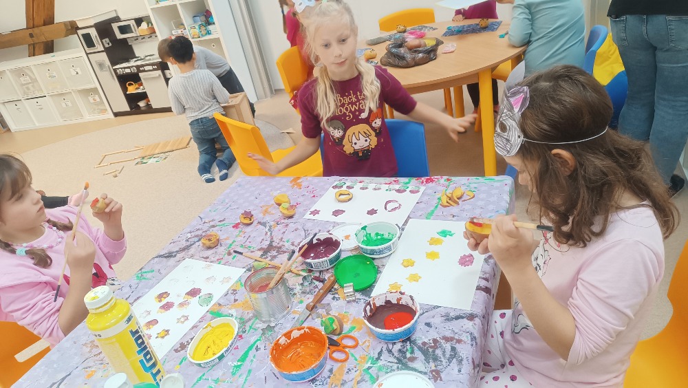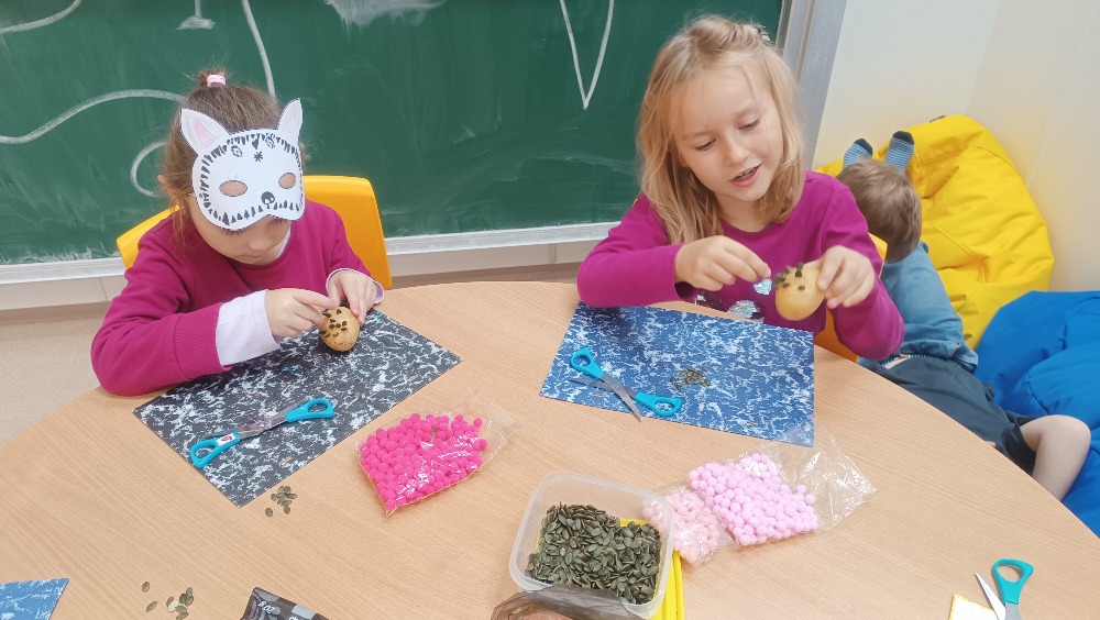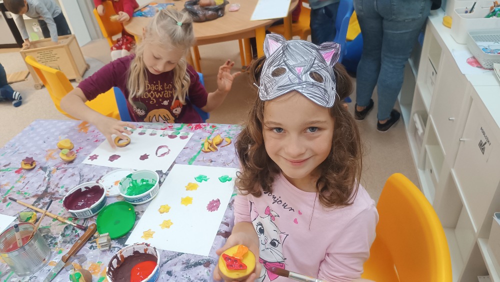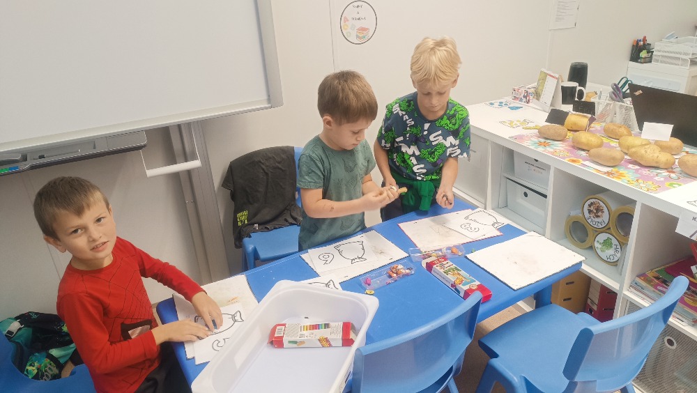 Ateliér – vyráběly ježka z brambory a tykvových semínek, dělaly bramborová tiskátka