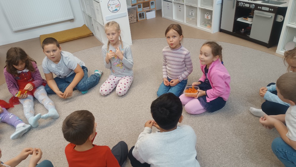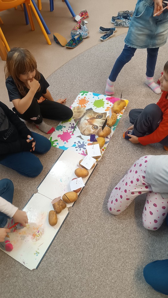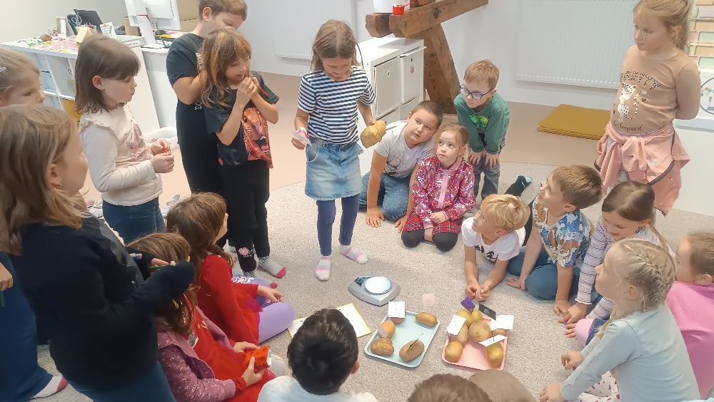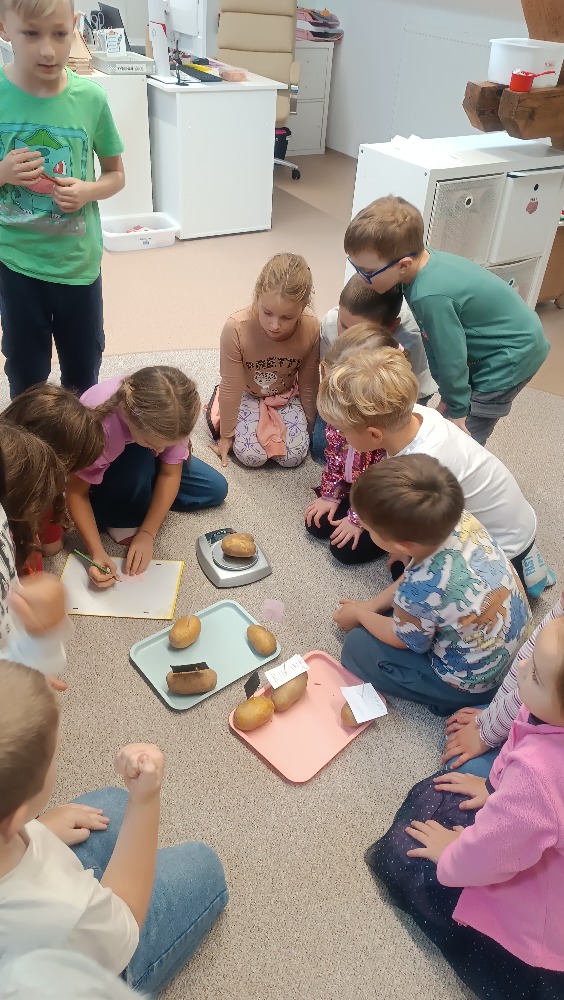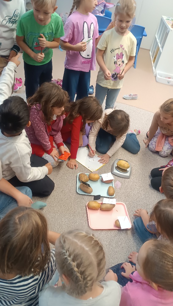 Minulý týden se naše družina nesla v duchu Bramboriády. Zadání týdenního úkolu bylo přinést co největší bramboru – a děti se opravdu snažily! V pátek jsme poprosili o pomoc sousedy - starší kamarády z vedlejší družiny, kteří už dobře znají vyšší čísla, a společně jsme brambory zvážili. Největší brambora vážila téměř půl kilogramu!