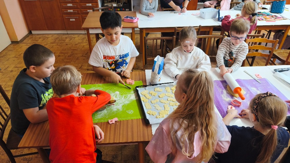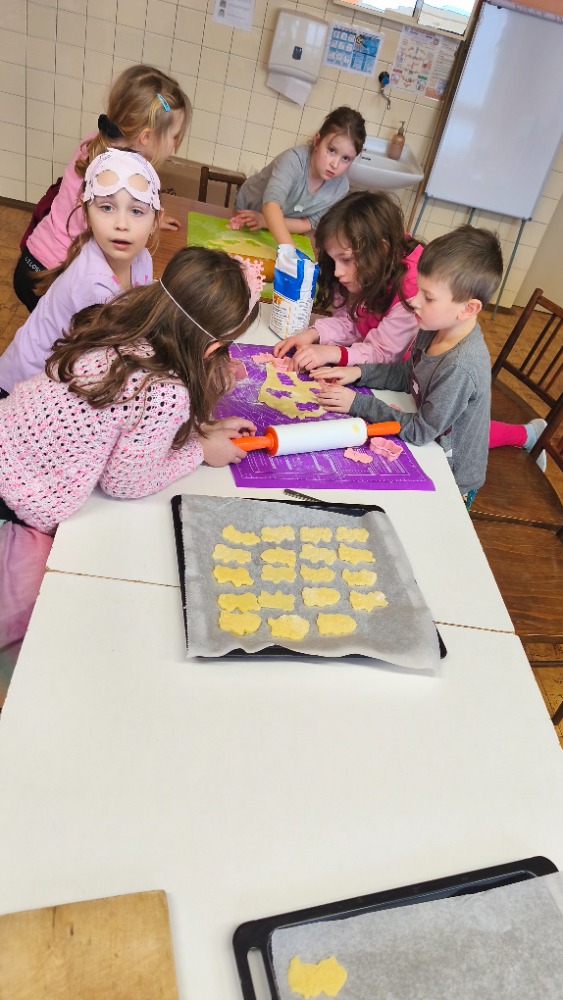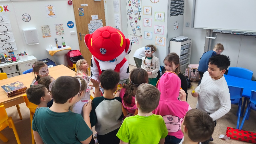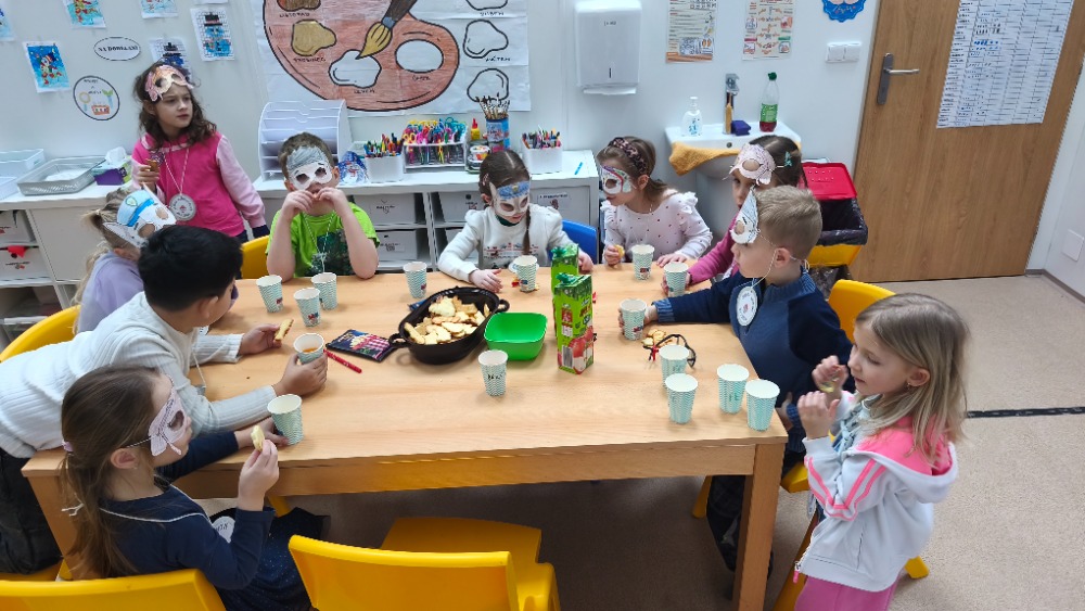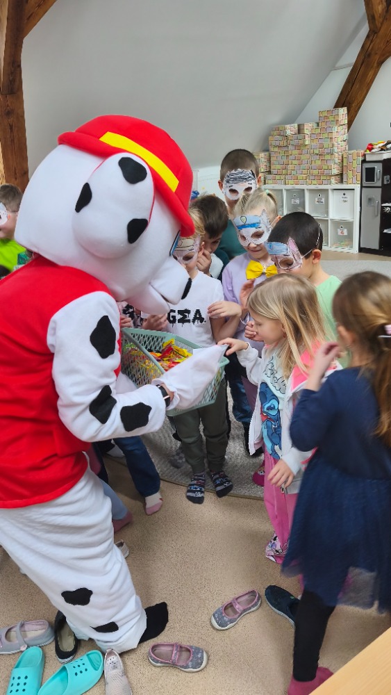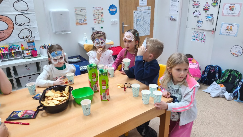 Den rozdávání prvního vysvědčení jsme si i ve družině udělali slavnostní. Už den předem jsme se na něj společně připravovali. V kuchyňce jsme pekli máslové sušenky pro ohlášenou návštěvu – věděli jsme, že k nám někdo přijde, ale kdo to bude, zůstávalo tajemstvím. Jedna skupina dětí se věnovala pečení sušenek, druhá mezitím vyráběla masky, aby bylo vše na slavnostní den připravené. V den "D" jsme si udělali malou oslavu – pochutnali jsme si na sušenkách, připravili si popcorn, zapíjeli ho jablečným džusem a užívali si společný čas. Největším překvapením ale byla návštěva Marshalla, který k nám přišel, zhodnotil náš uplynulý půlrok v družině a popřál dětem mnoho dalších krásných dnů. Celé odpoledne se tak neslo v radostné a slavnostní atmosféře a bylo kráskou tečkou za prvním školním pololetím.