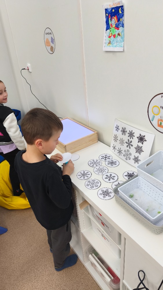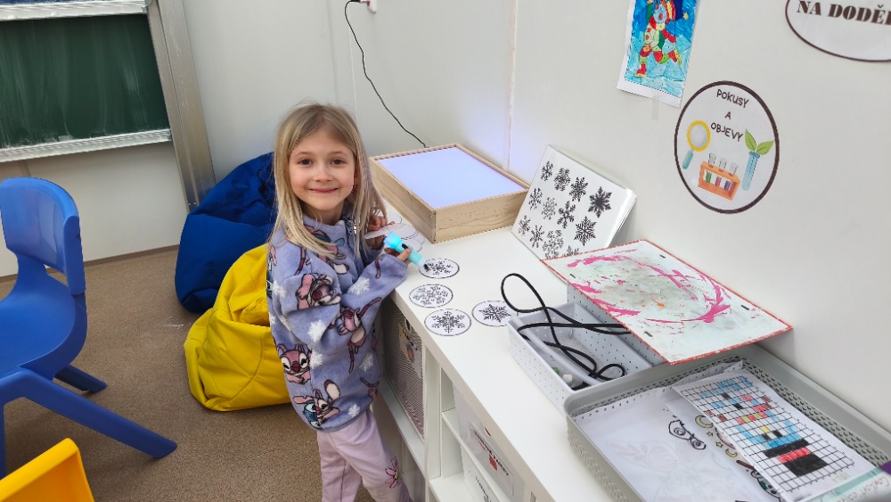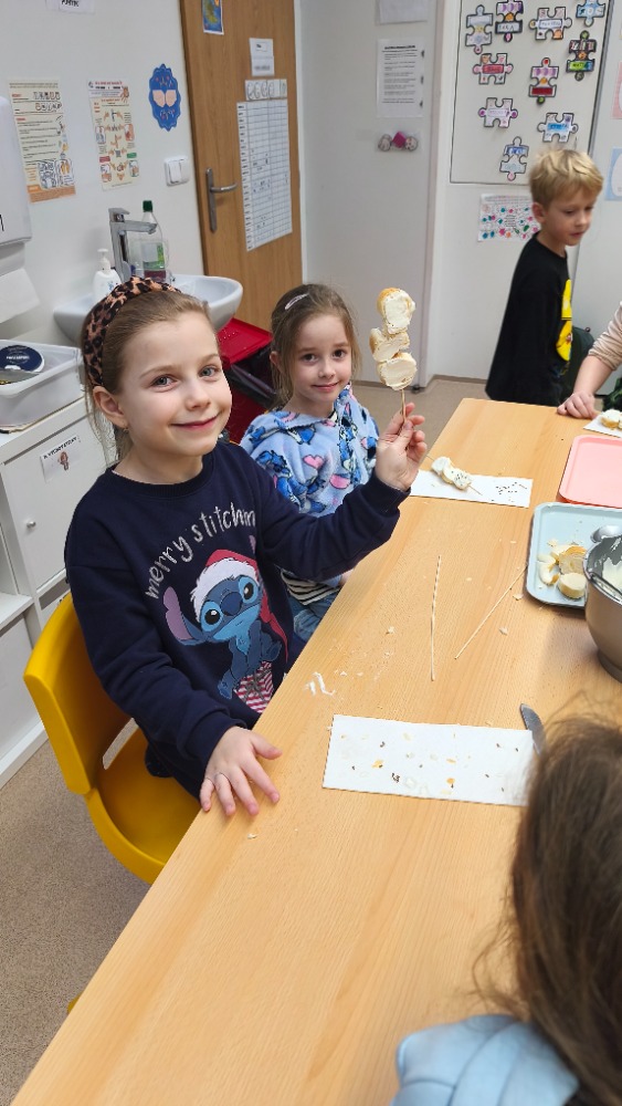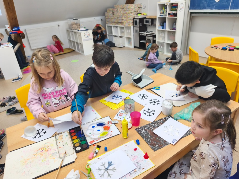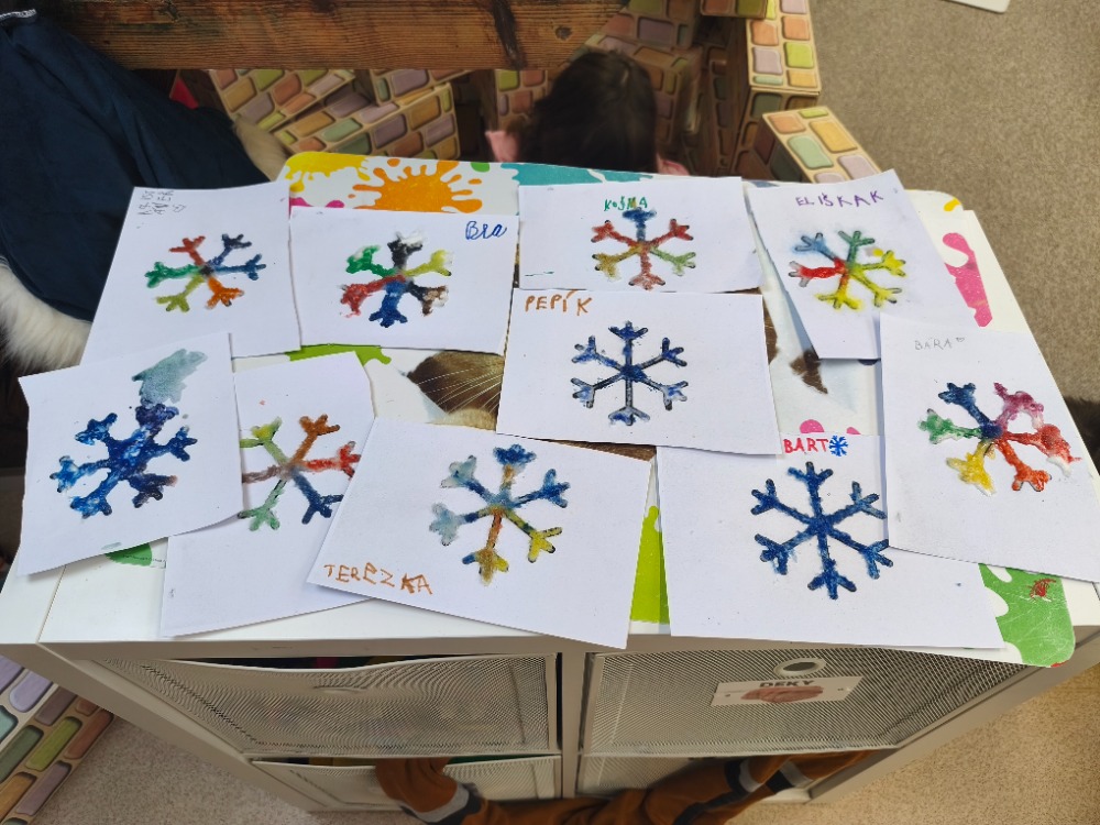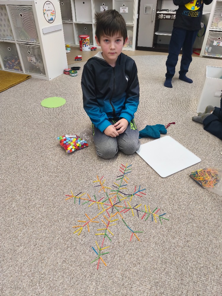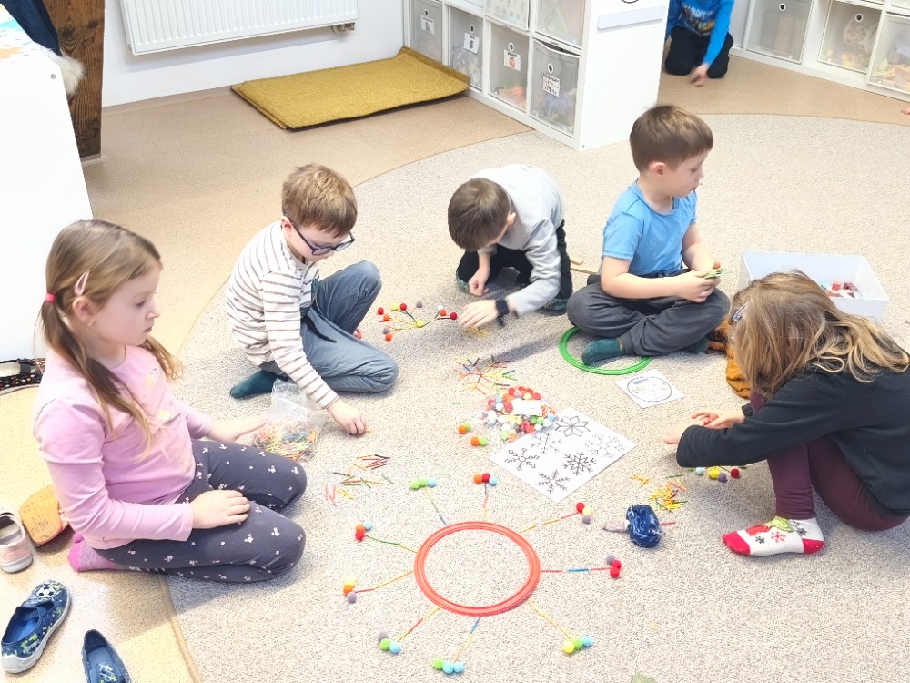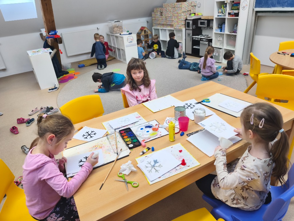 Jedním z aktuálních a zároveň velmi obsáhlých témat bylo Sníh a sněhuláci, kterému jsme v družině věnovali dva týdny. Společně jsme si povídali o zimě, jejích znacích a proměnách a četli jsme poučný příběh o vločce Bělince. Děti se zapojily do celé řady tvořivých i objevovacích aktivit. Vyráběly 3D obrázky sněhuláků, malovaly vločky lepidlem a solí, do kterých poté zapouštěly barvy, stavěly sněhové vločky z dřívek, kostek a bambulek. Novou zkušeností byla práce se zvukovými tlačítky, podle jejichž hlasových pokynů děti dokreslovaly obrázky. Vyráběly také 3D vločky z polystyrenu, párátek a trubiček, skládaly hexagon a odhalovaly vločky pomocí světelného panelu nebo baterky. Nechyběl ani sníh v reálném prostředí – alespoň na pár dní jsme si ho mohli užít venku. Celé téma jsme zakončili výrobou sněhové pomazánky a přípravou sněhuláka z jednohubek, na kterém si děti hned pochutnaly.