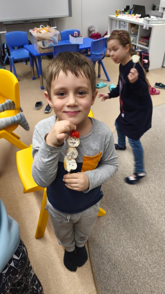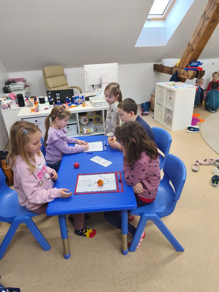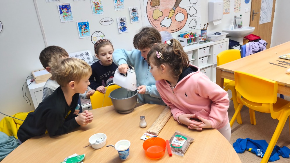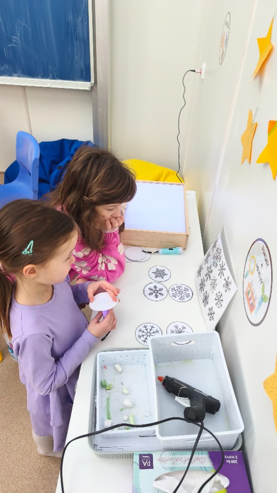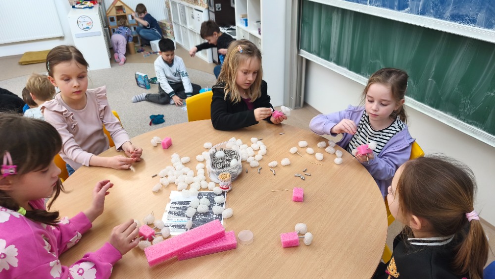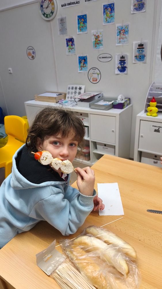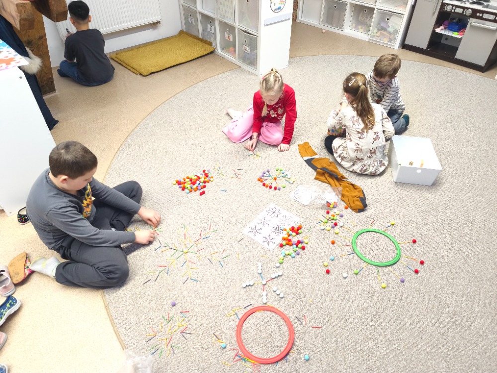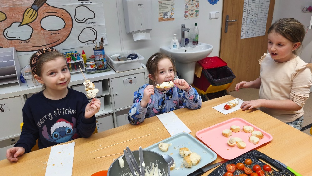 Jedním z aktuálních a zároveň velmi obsáhlých témat bylo Sníh a sněhuláci, kterému jsme v družině věnovali dva týdny. Společně jsme si povídali o zimě, jejích znacích a proměnách a četli jsme poučný příběh o vločce Bělince. Děti se zapojily do celé řady tvořivých i objevovacích aktivit. Vyráběly 3D obrázky sněhuláků, malovaly vločky lepidlem a solí, do kterých poté zapouštěly barvy, stavěly sněhové vločky z dřívek, kostek a bambulek. Novou zkušeností byla práce se zvukovými tlačítky, podle jejichž hlasových pokynů děti dokreslovaly obrázky. Vyráběly také 3D vločky z polystyrenu, párátek a trubiček, skládaly hexagon a odhalovaly vločky pomocí světelného panelu nebo baterky. Nechyběl ani sníh v reálném prostředí – alespoň na pár dní jsme si ho mohli užít venku. Celé téma jsme zakončili výrobou sněhové pomazánky a přípravou sněhuláka z jednohubek, na kterém si děti hned pochutnaly.