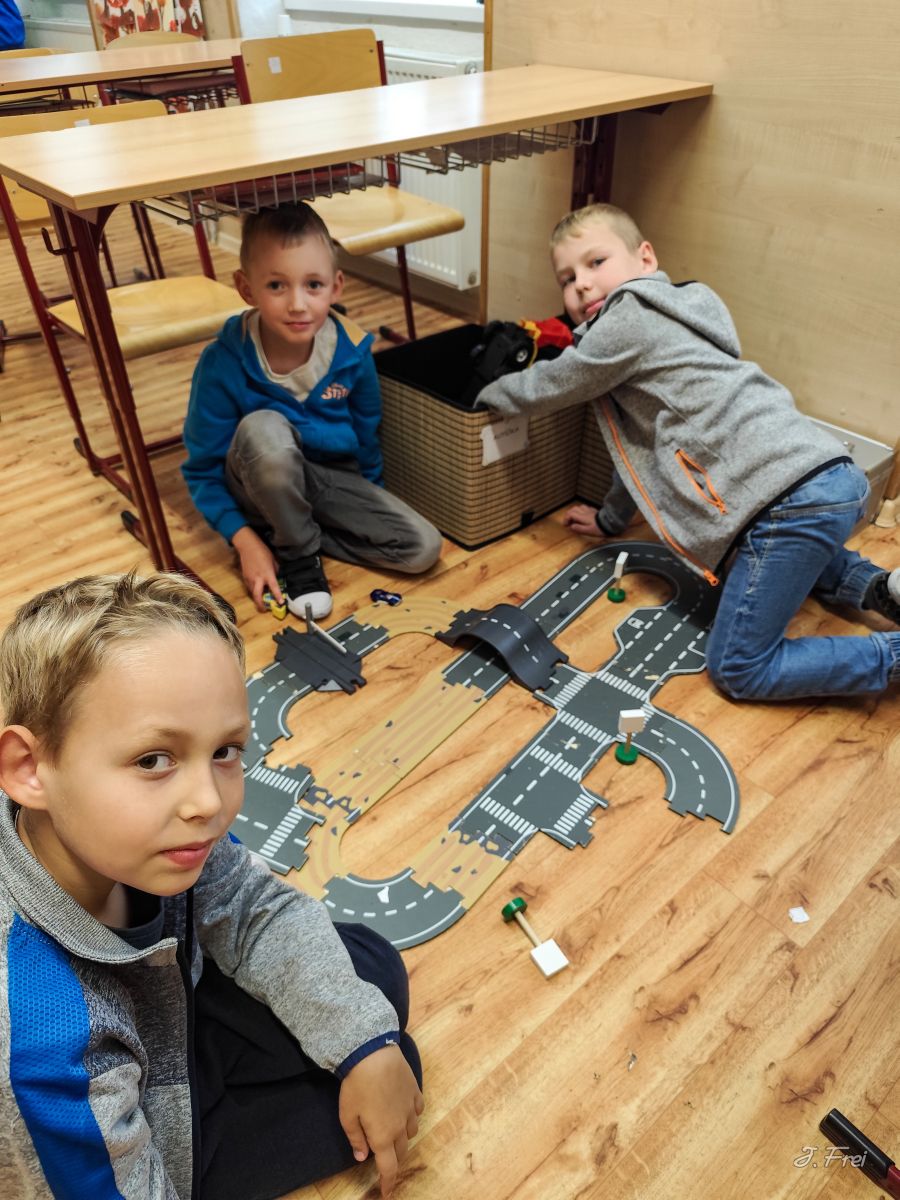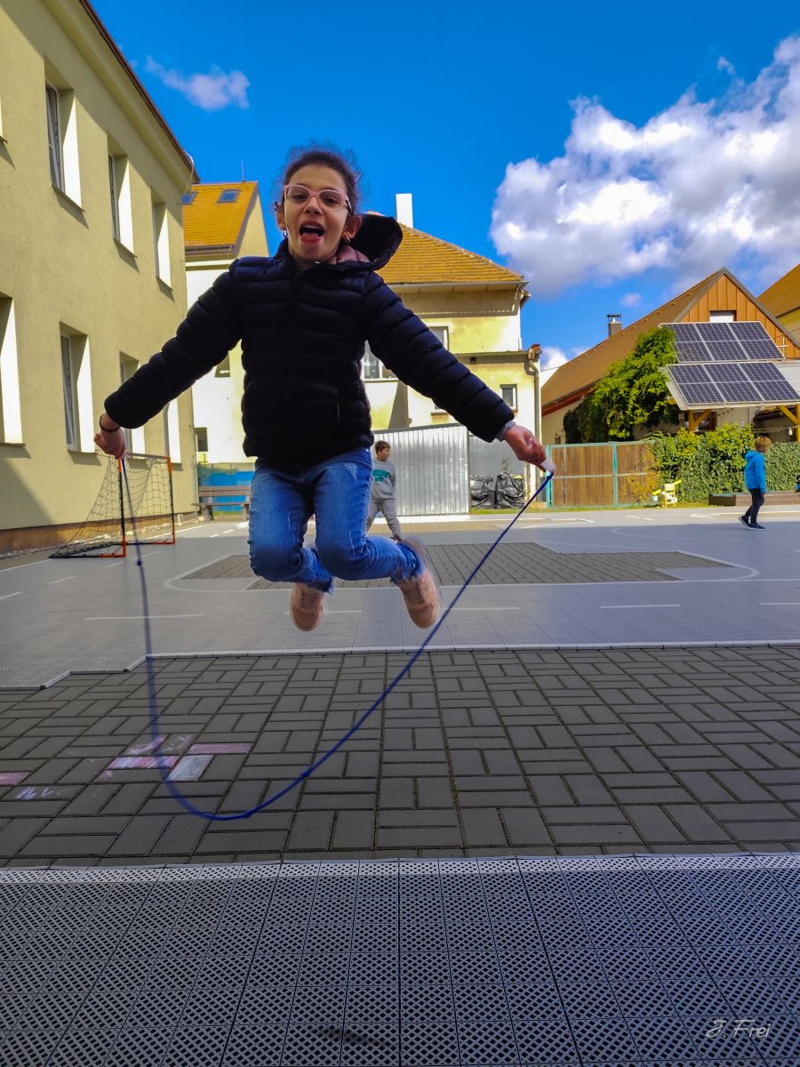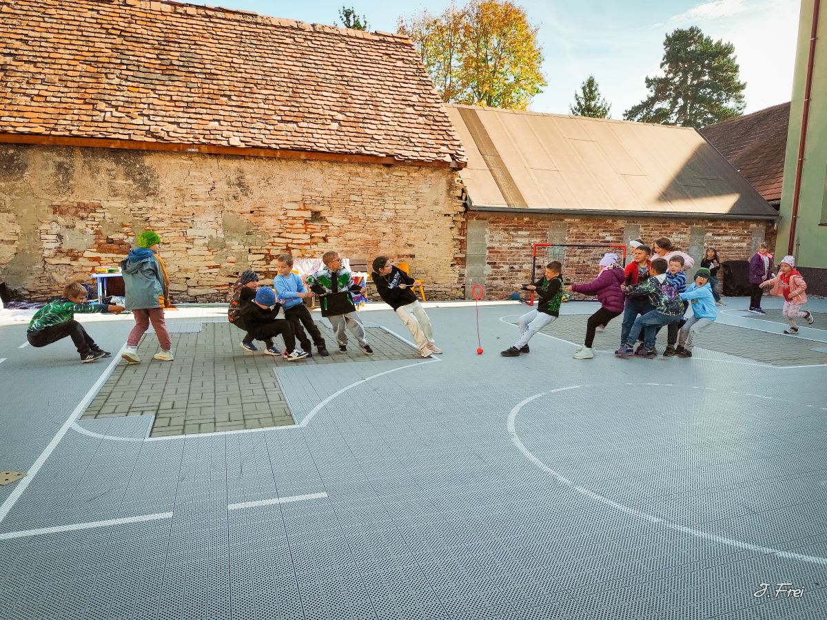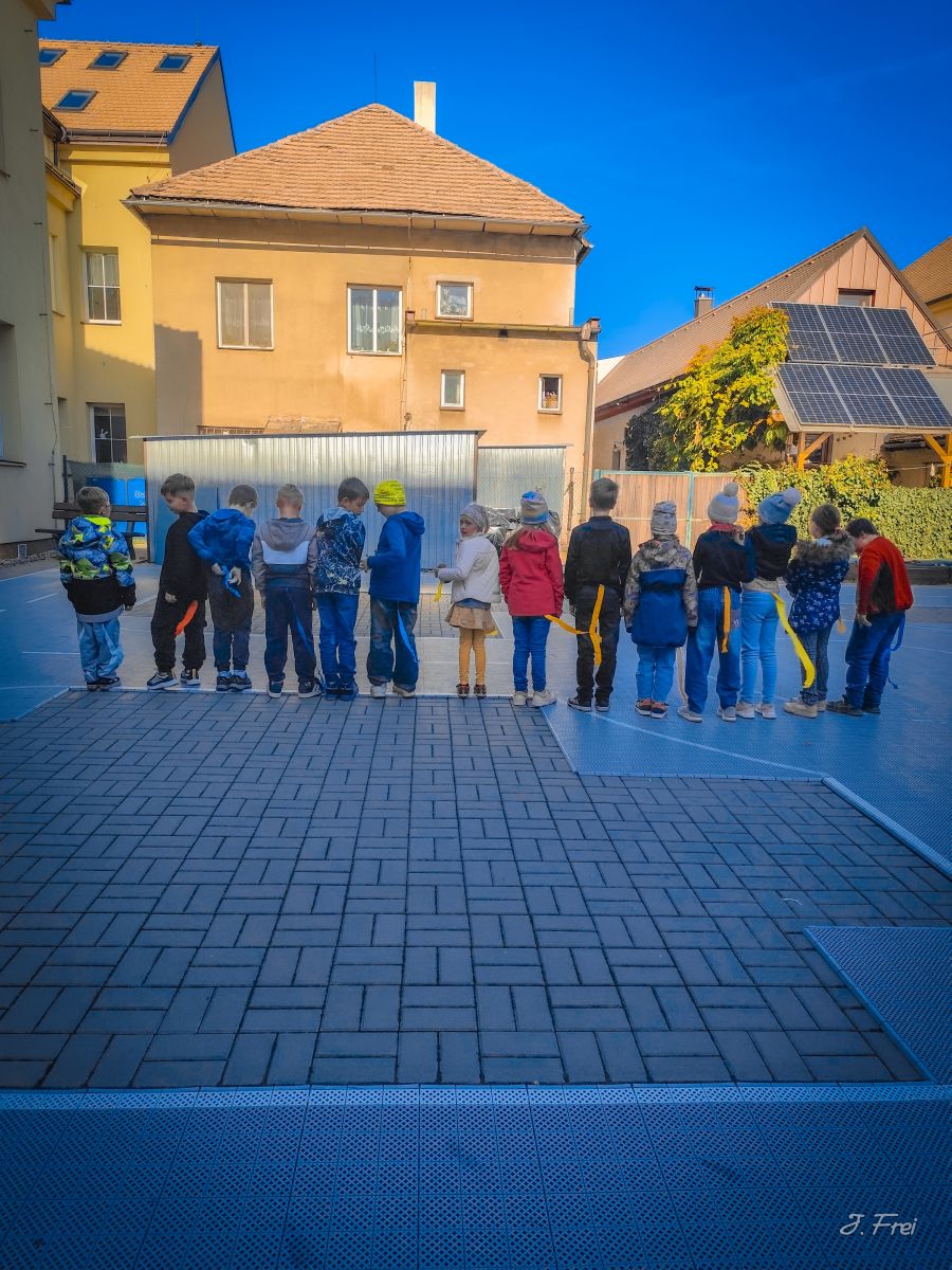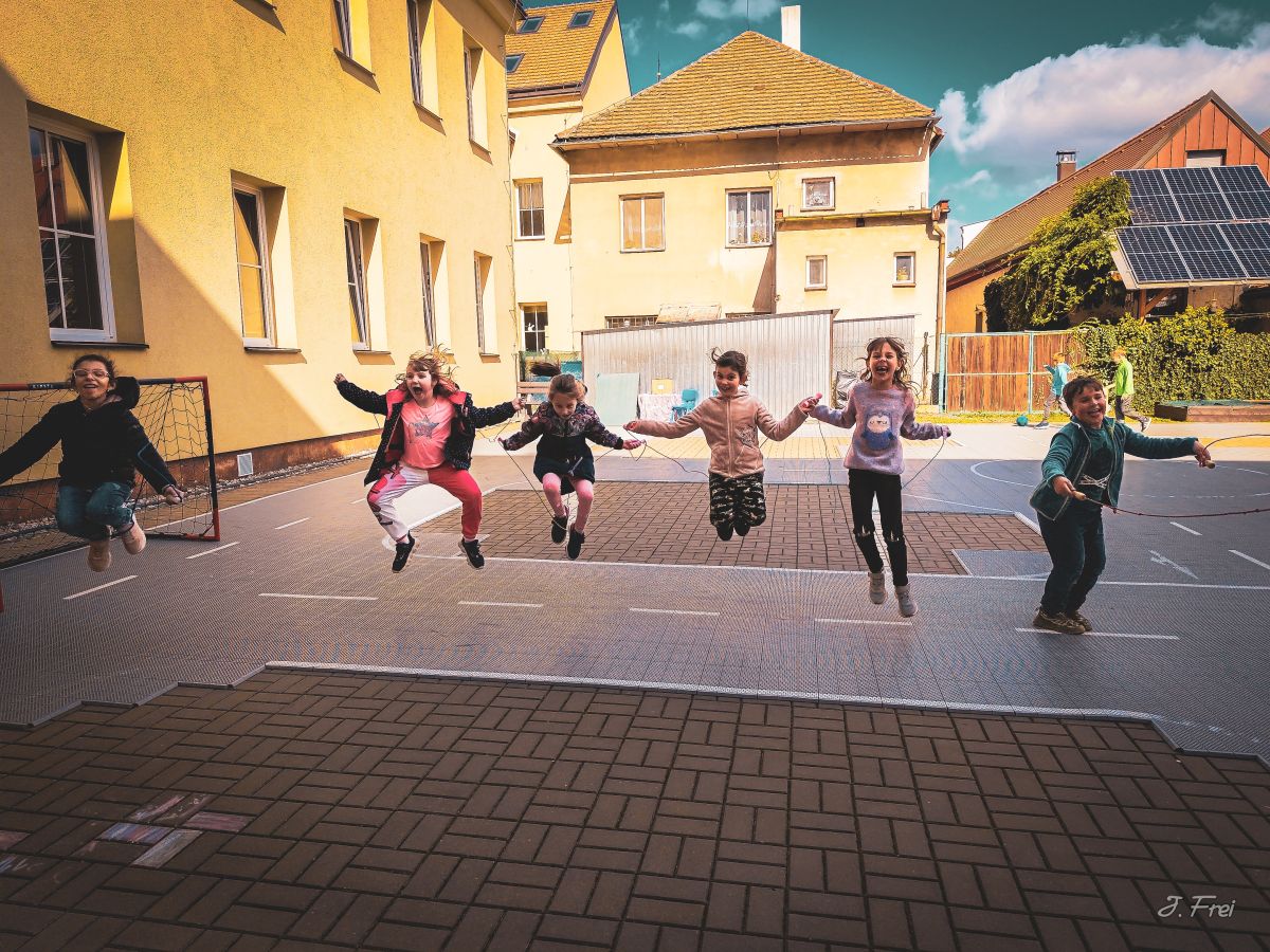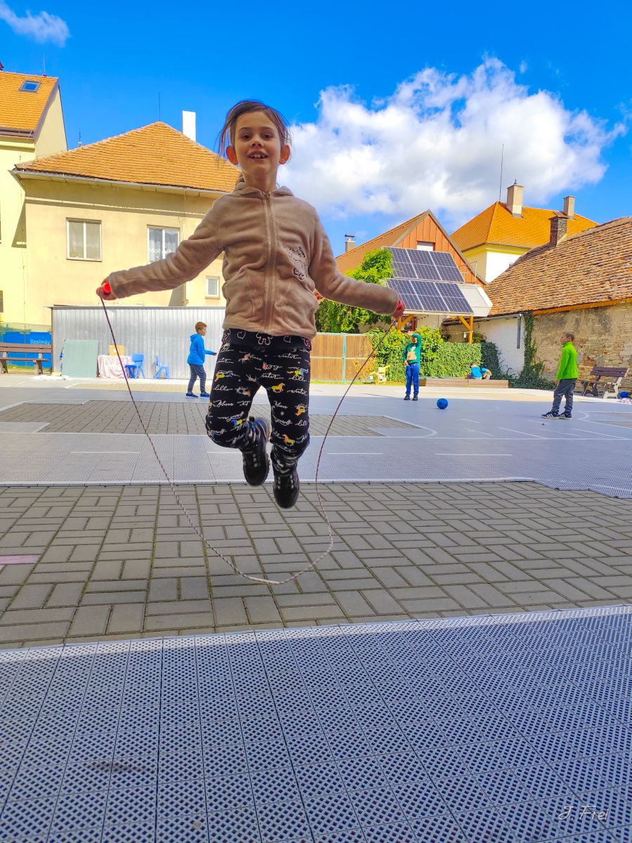 Letos má naše družina maskota, kterého si děti samy vybraly a je to lev, takže jsme družina lvíčat. Lvíčat, kteří milují fotbal. Proto chodíme ven, jak jen nám počasí dovolí. Kluci jsou nadšení, když můžou hrát fotbal, holky se předhání, která nejvíc naskáče přes švihadlo, staví domečky, hrají si v pískových kuchyňkách. Velké oblibě se těší také pískoviště, kde se budují nejrůznější stavby - někdy podle tématu, jindy dle vlastní fantazie.