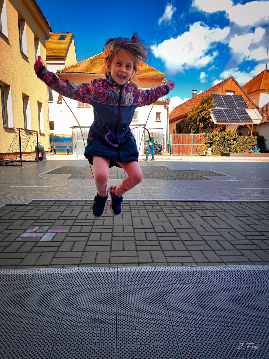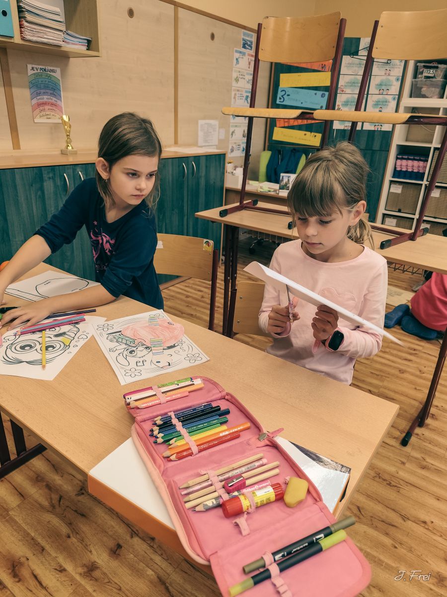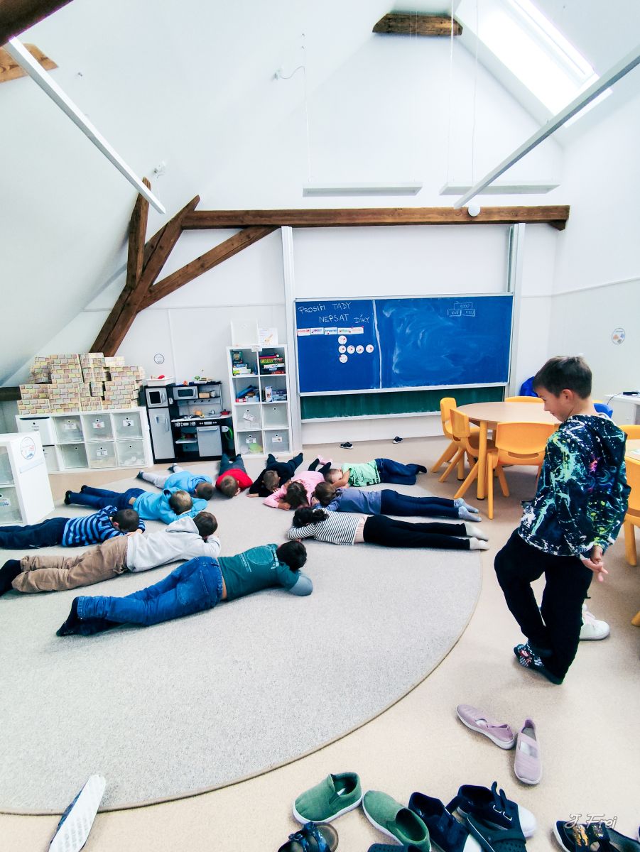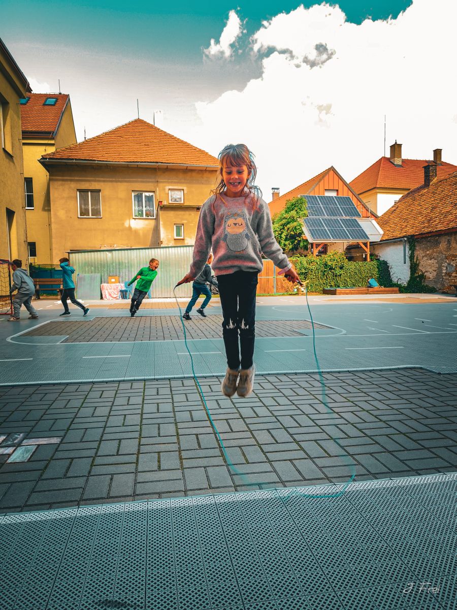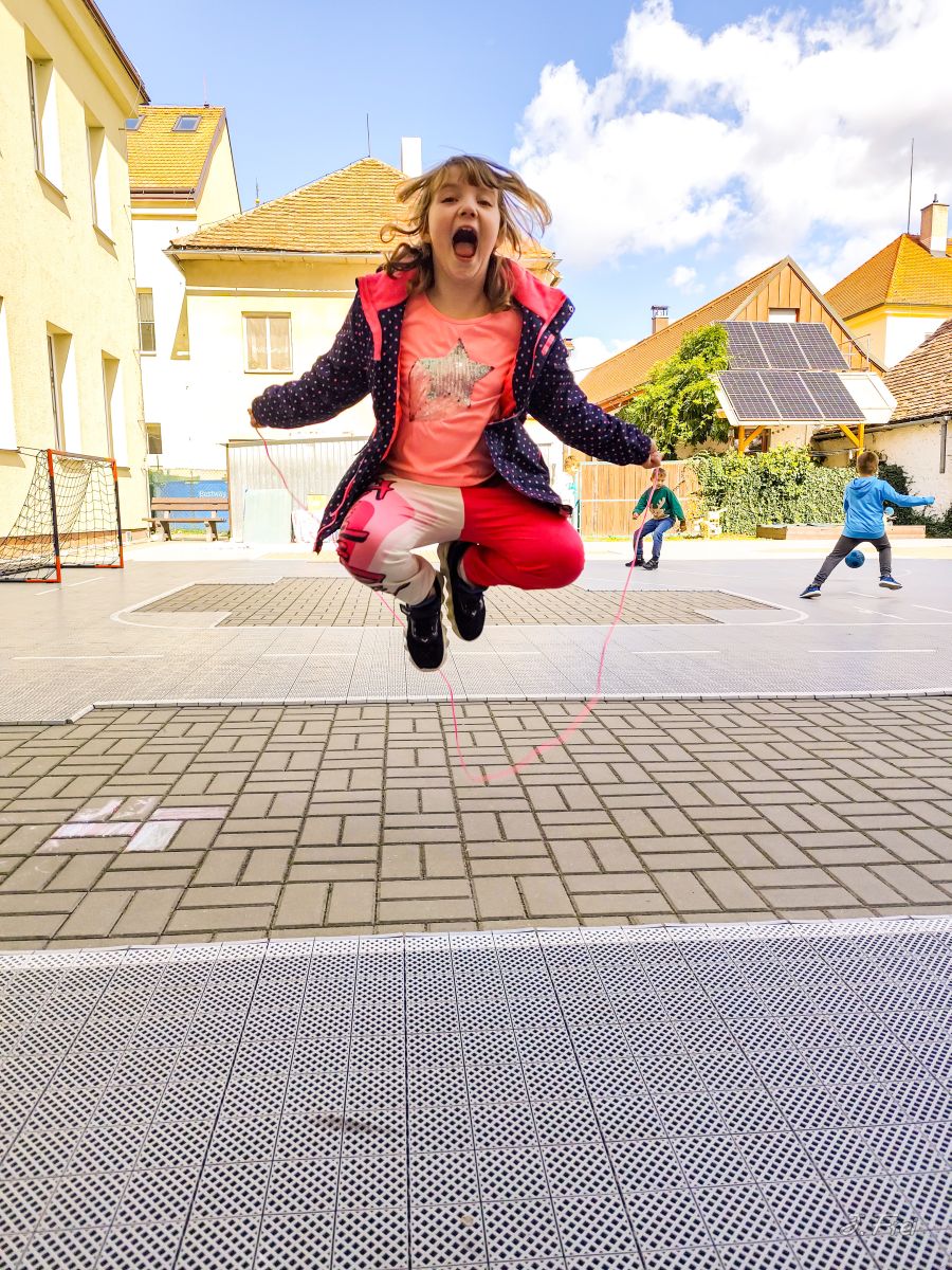 Letos má naše družina maskota, kterého si děti samy vybraly a je to lev, takže jsme družina lvíčat. Lvíčat, kteří milují fotbal. Proto chodíme ven, jak jen nám počasí dovolí. Kluci jsou nadšení, když můžou hrát fotbal, holky se předhání, která nejvíc naskáče přes švihadlo, staví domečky, hrají si v pískových kuchyňkách. Velké oblibě se těší také pískoviště, kde se budují nejrůznější stavby - někdy podle tématu, jindy dle vlastní fantazie.