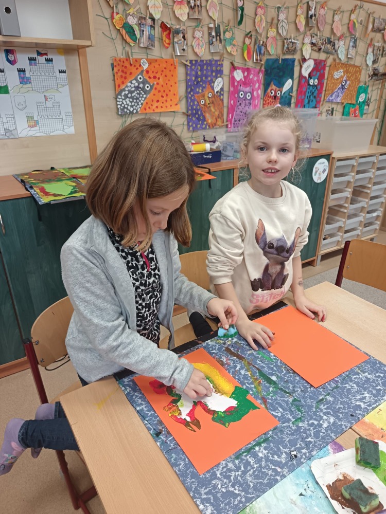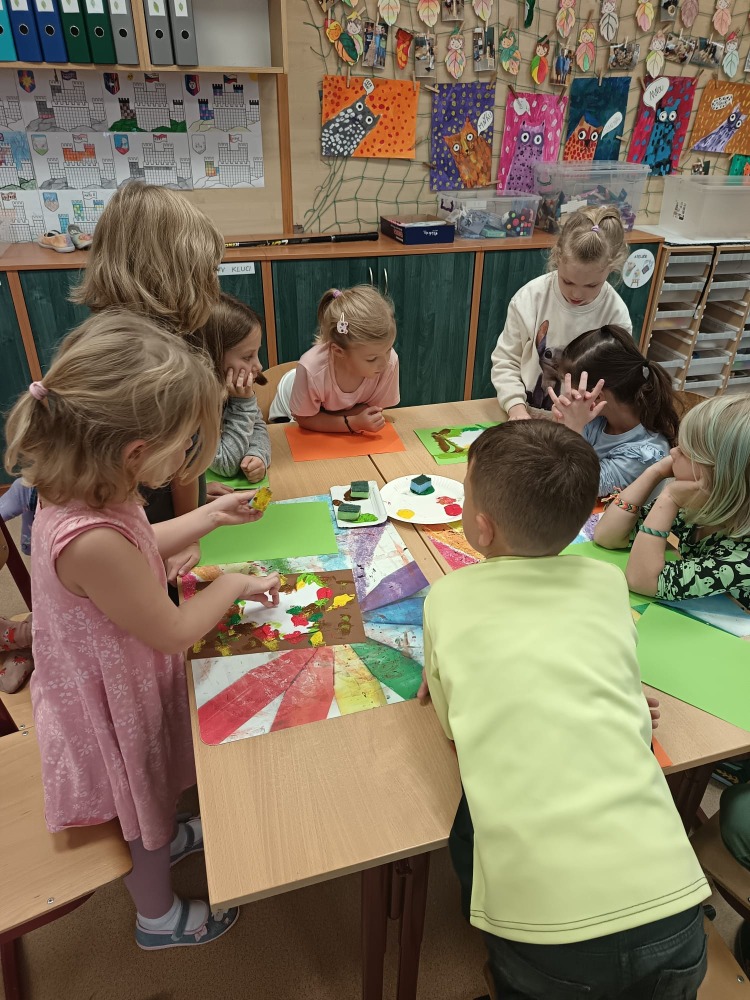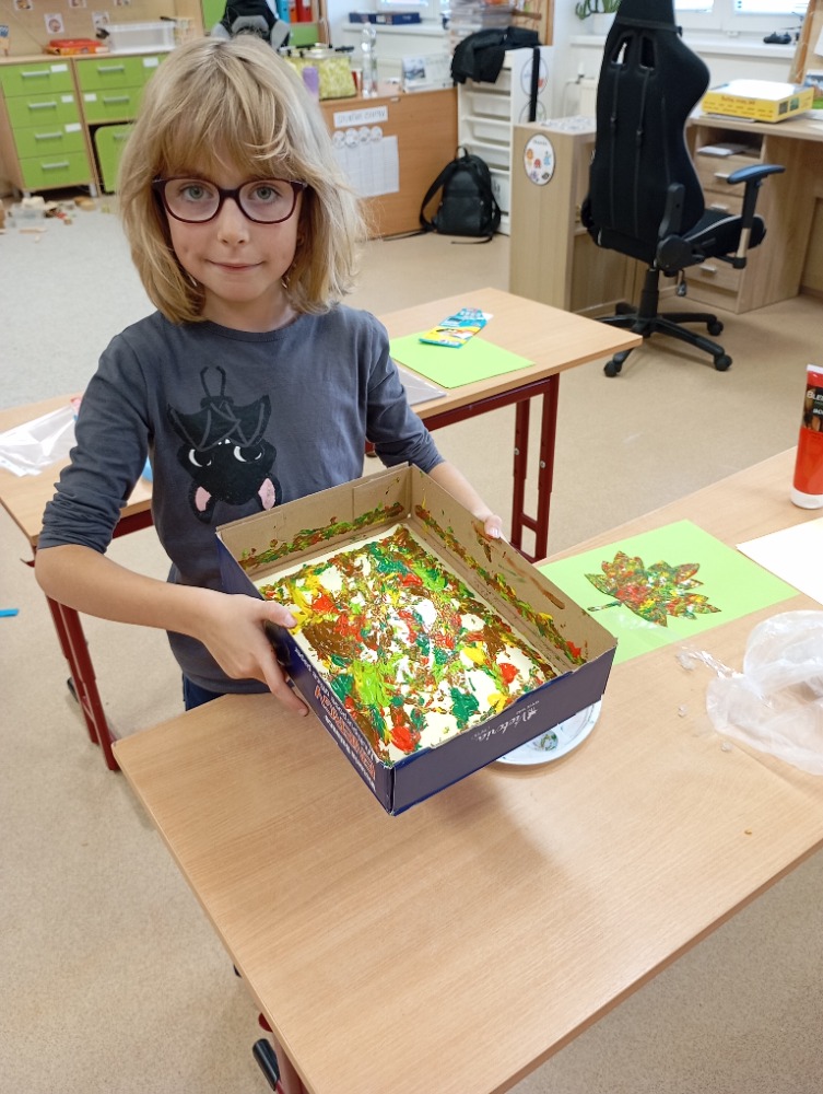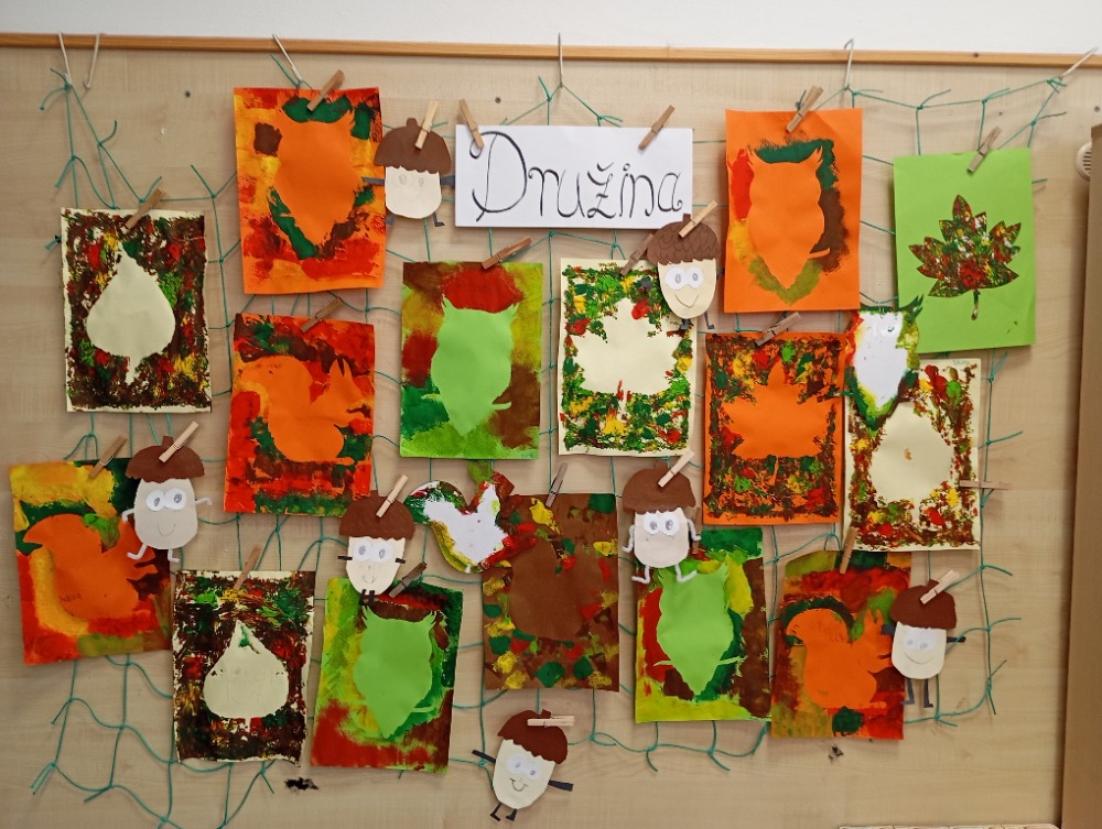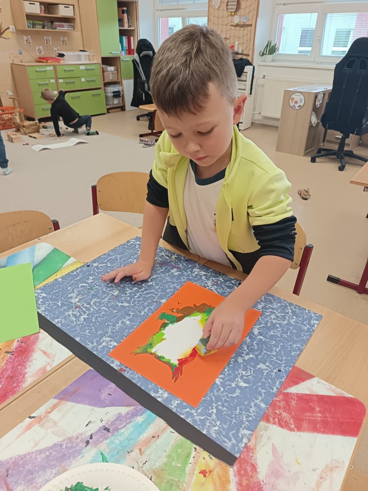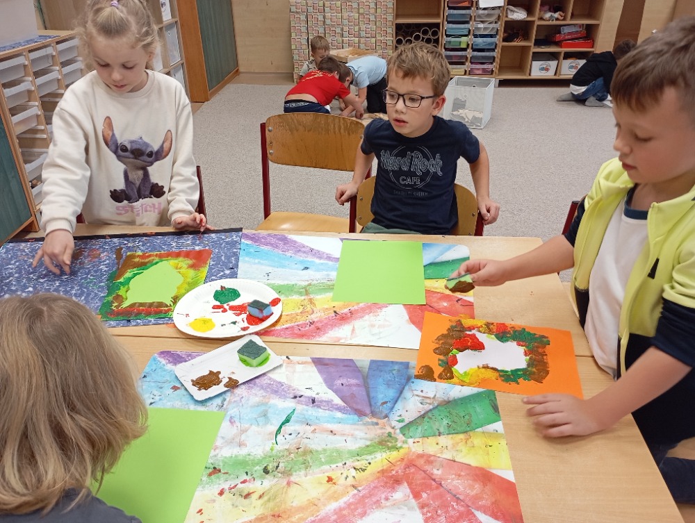 Děti si v týdnu inspirovaném barevným podzimem vyzkoušely netradiční výtvarné techniky – pomocí houbiček na nádobí vytvářely otisky zvířátek a kutálením vlašských oříšků tvořily originální listy stromů. Práce je bavila a vznikly krásné podzimní obrázky plné fantazie.