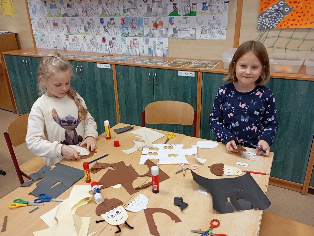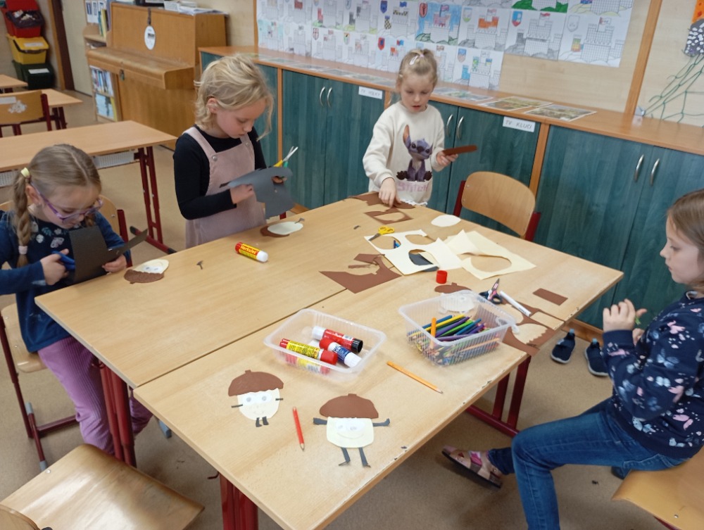 V jiný den se pustily do tvoření „Dubínků“ – postaviček z papíru a chlupatých drátků, které se staly ozdobou naší podzimní výstavky.