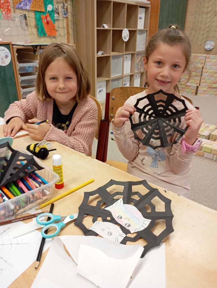 V centru Ateliér se pilně tvořilo. Děti vystřihovaly pavučiny z papíru, na které pak umisťovaly své namalované pavoučky. Někdo vyzkoušel i metodu tisku obyčejnou ruličkou od toaletního papíru. Při práci rozvíjely fantazii, trpělivost i jemnou motoriku.