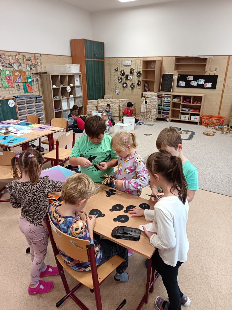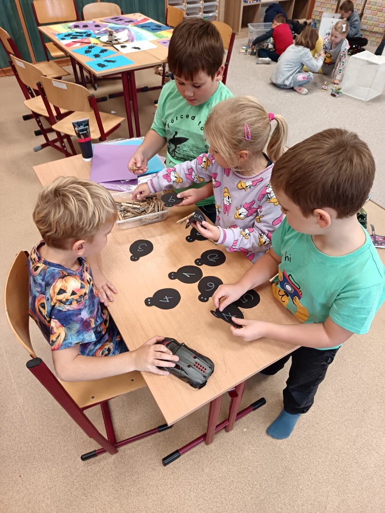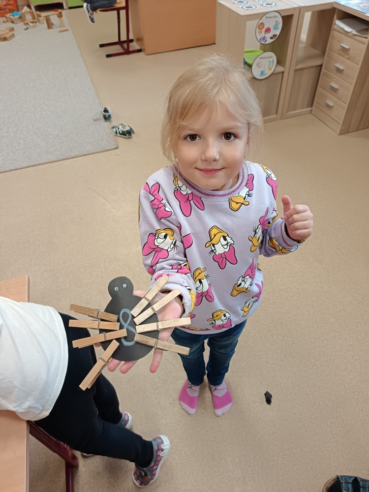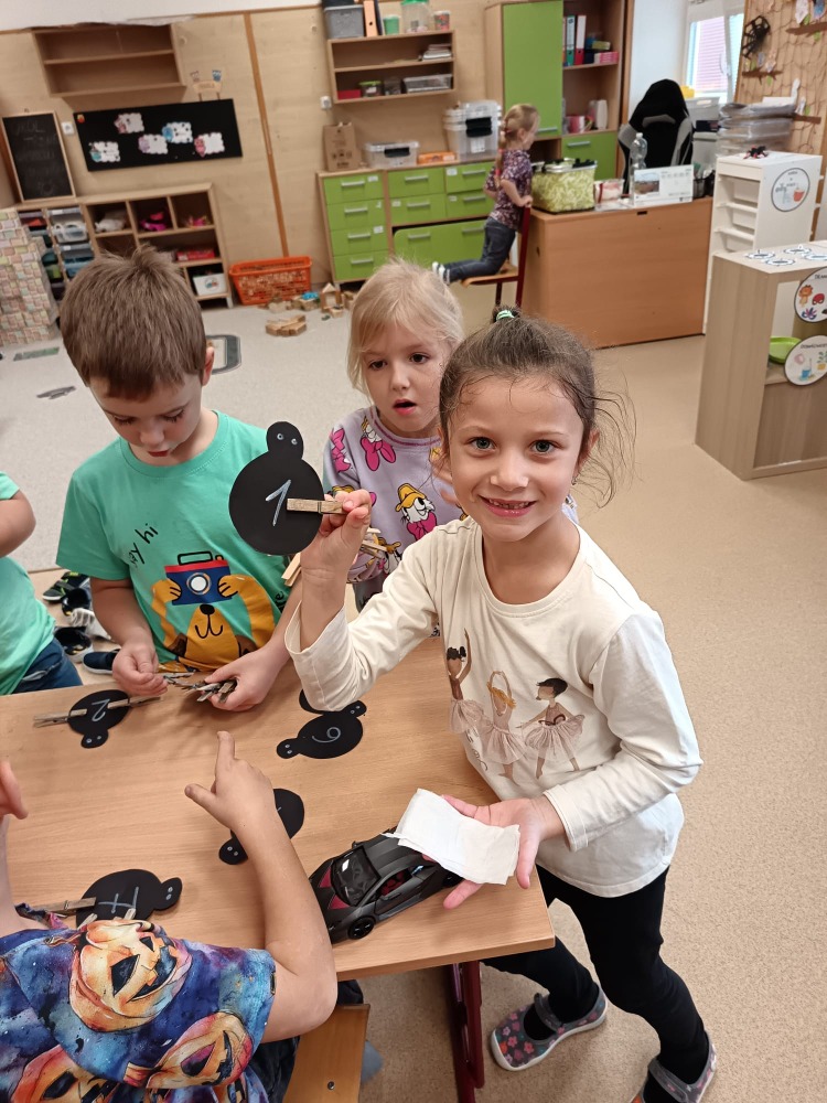 V rámci „pavoučího" týdne si také procvičovaly počítání. Pavoučkům přidělovaly kolíčky podle čísel, která měla napsaná na tělíčku, a pečlivě kontrolovaly, zda mají správný počet nožiček.