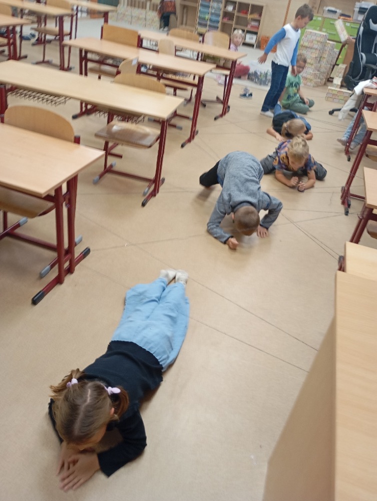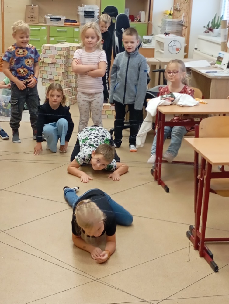 Děti si vyzkoušely pavoučí labyrint, kde musely s opatrností a obratností prolézat mezi „pavučinovými“ provázky, aniž by se jich dotkly. Trénovaly tak rovnováhu, koordinaci pohybů i s soustředění.