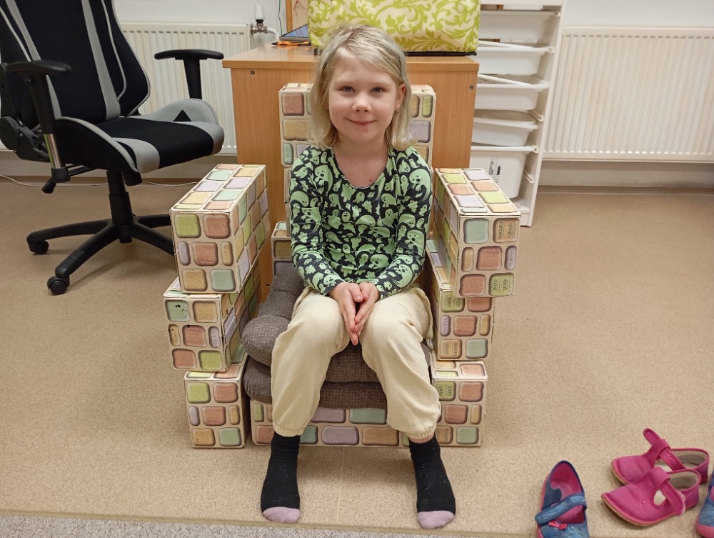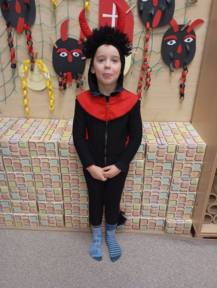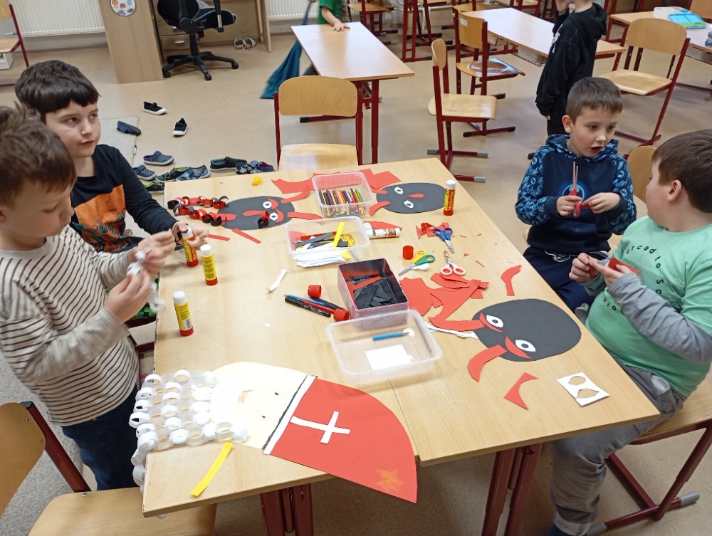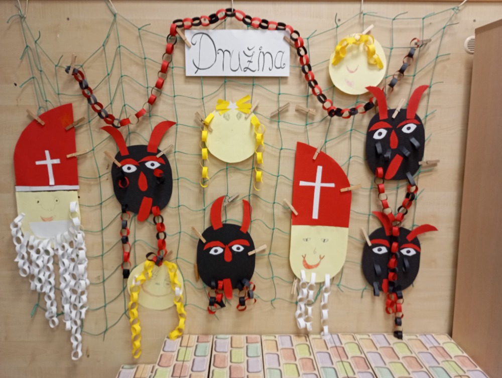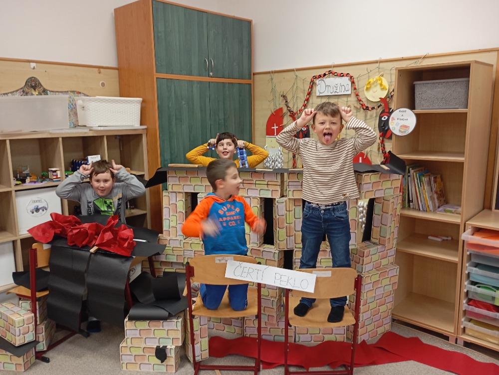 Na Mikuláše si děti užily plno legrace. U tabule se vžily do role role andílků i čertů. Moc se jim povedlo vyrábění v ateliéru, s využitím řetězů z papíru tvořily čerty, Mikuláše i anděly. Nechyběly ani stavby pekla v centru kostek.