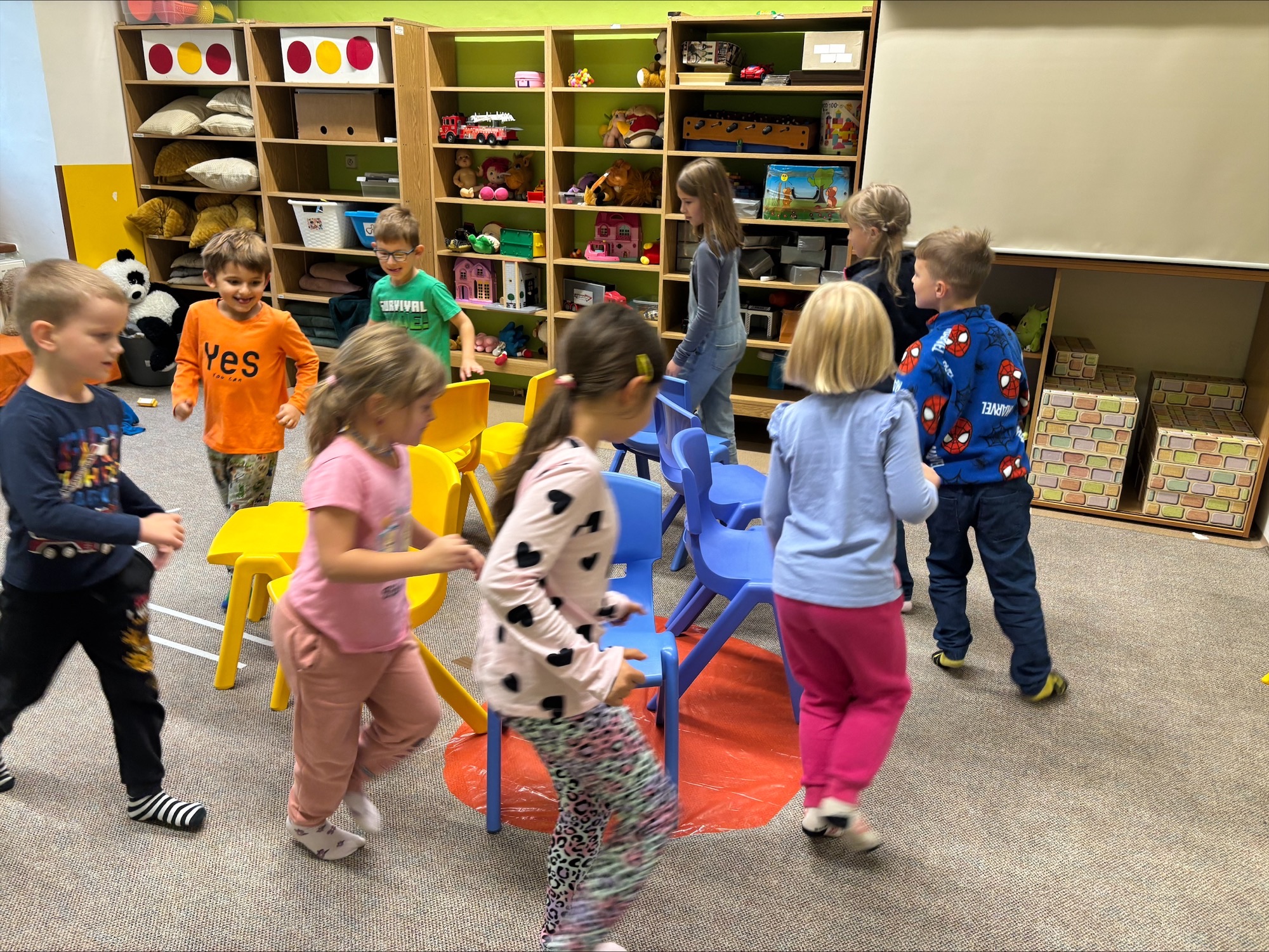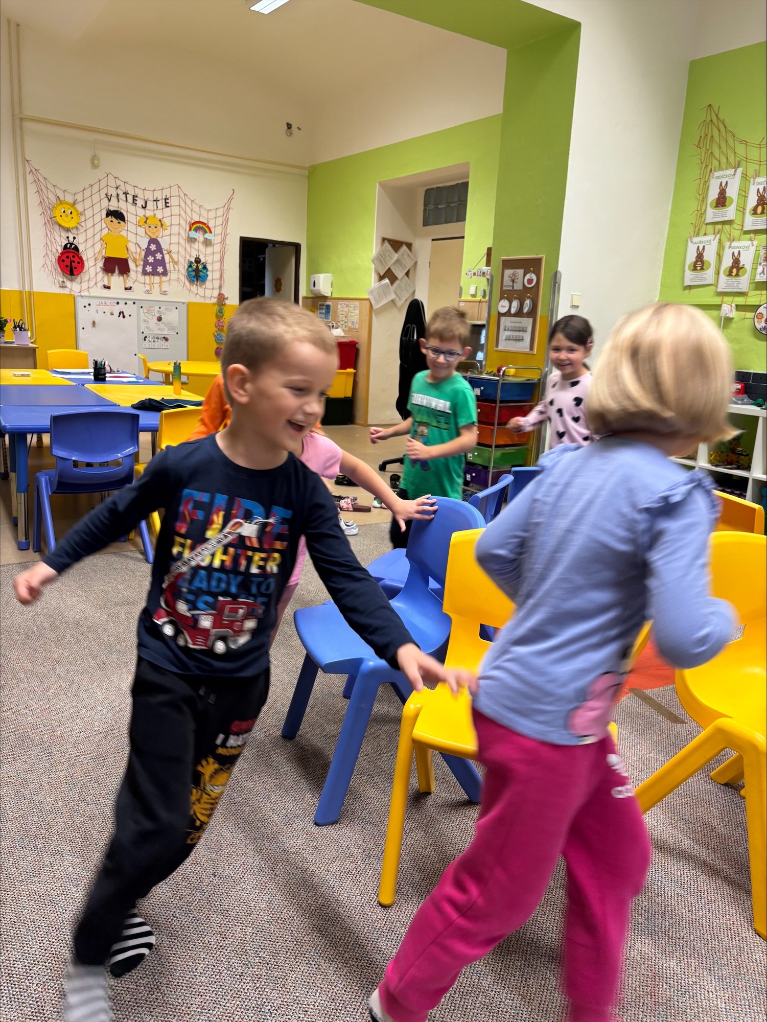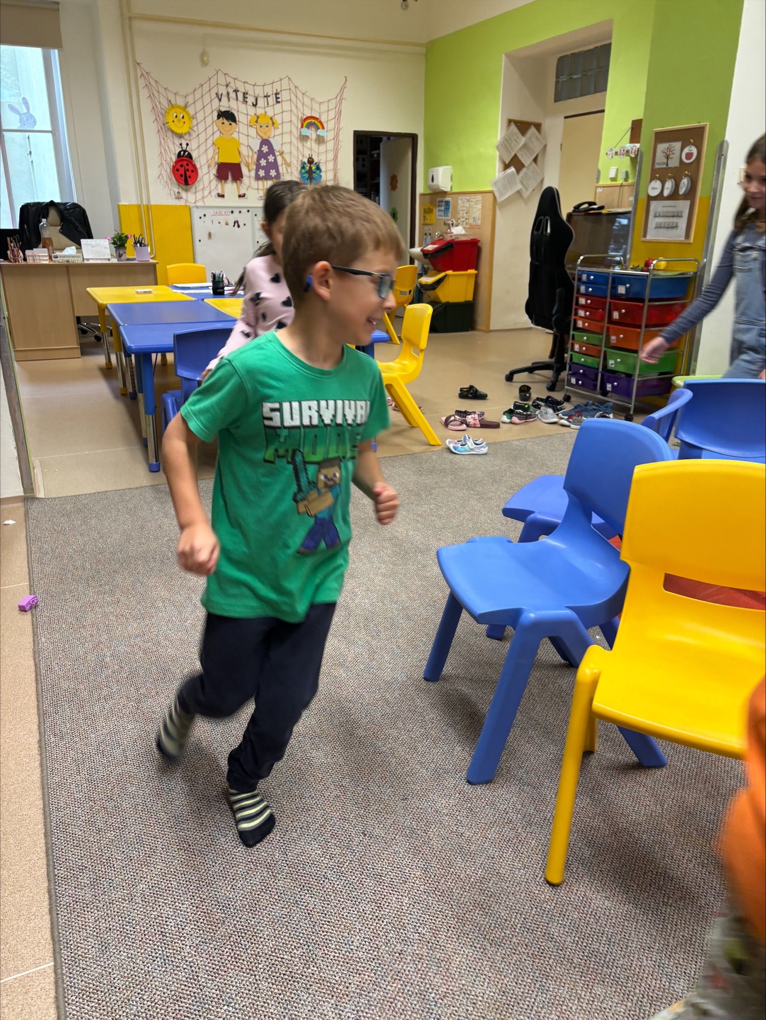 Vyzdobili jsme také naši podzimní nástěnku barevnými výkresy a užili si spoustu legrace při pohybových hrách, jako jsou sochy nebo židličkovaná.