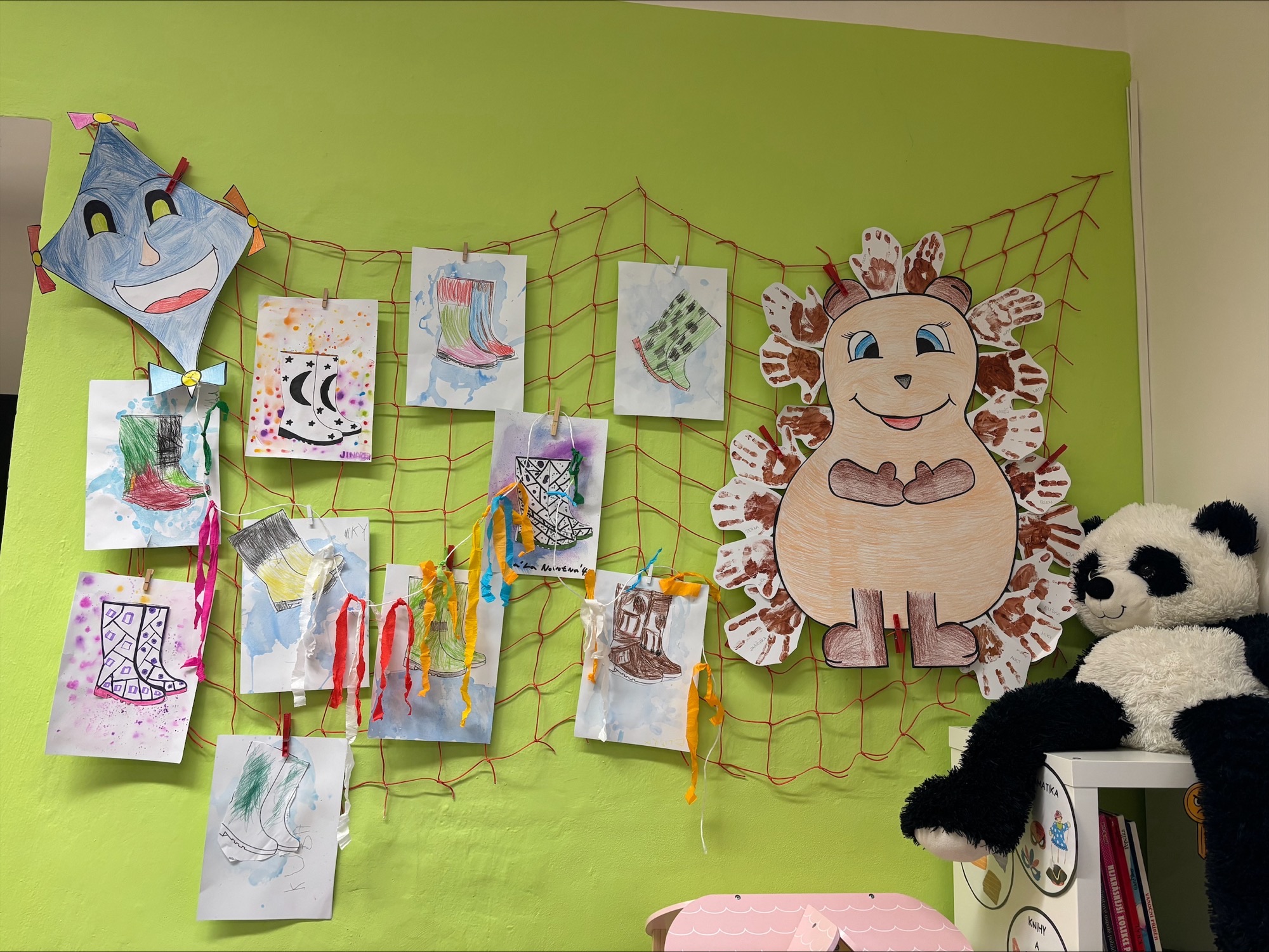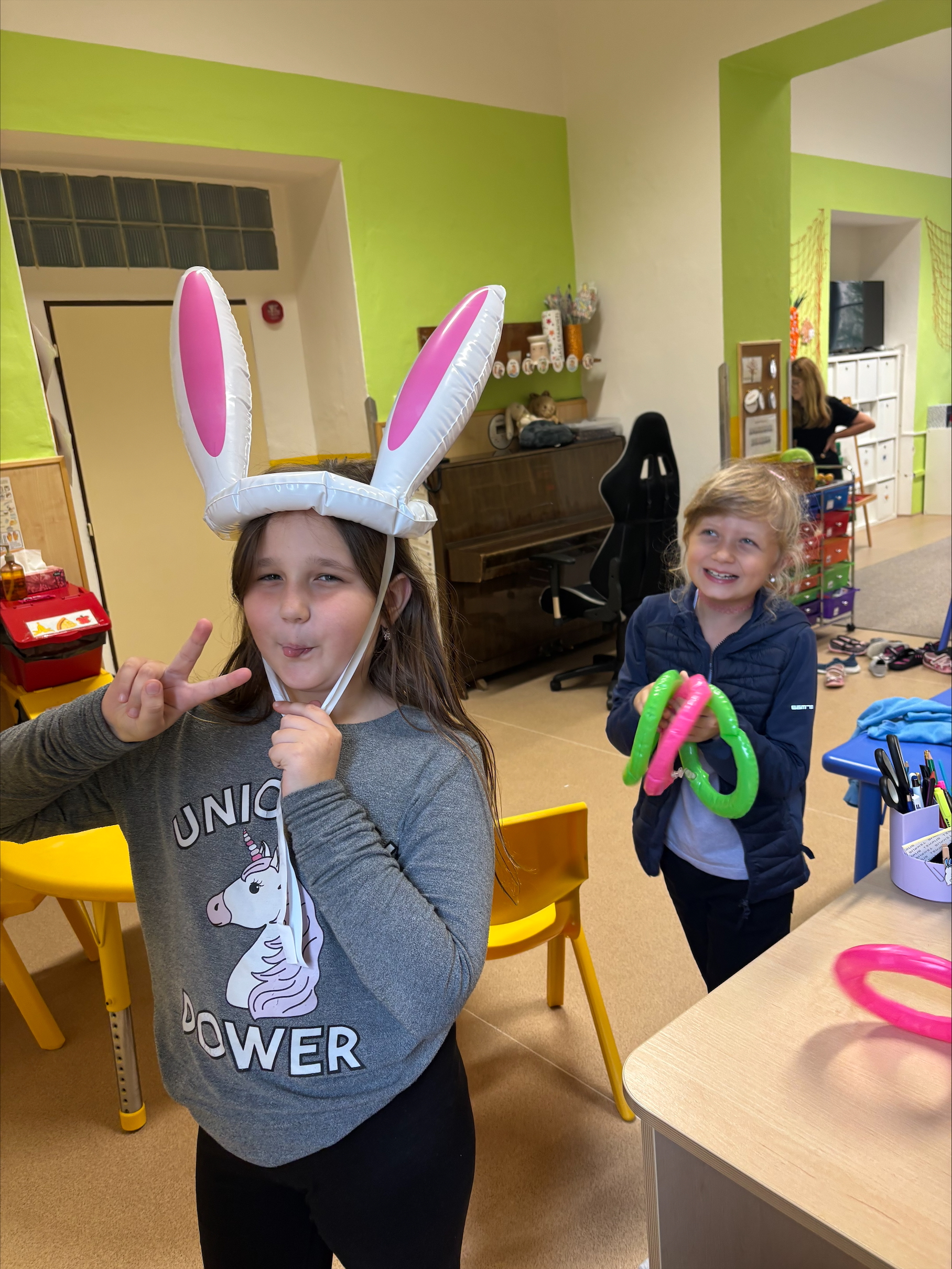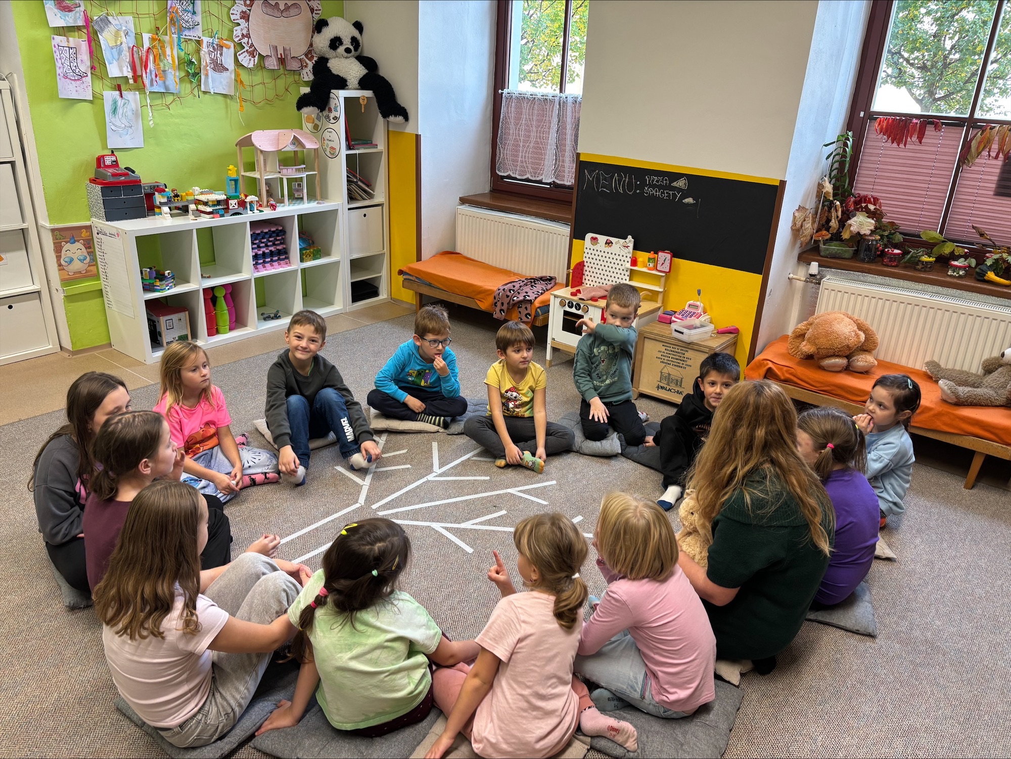 Vyzdobili jsme také naši podzimní nástěnku barevnými výkresy a užili si spoustu legrace při pohybových hrách, jako jsou sochy nebo židličkovaná.