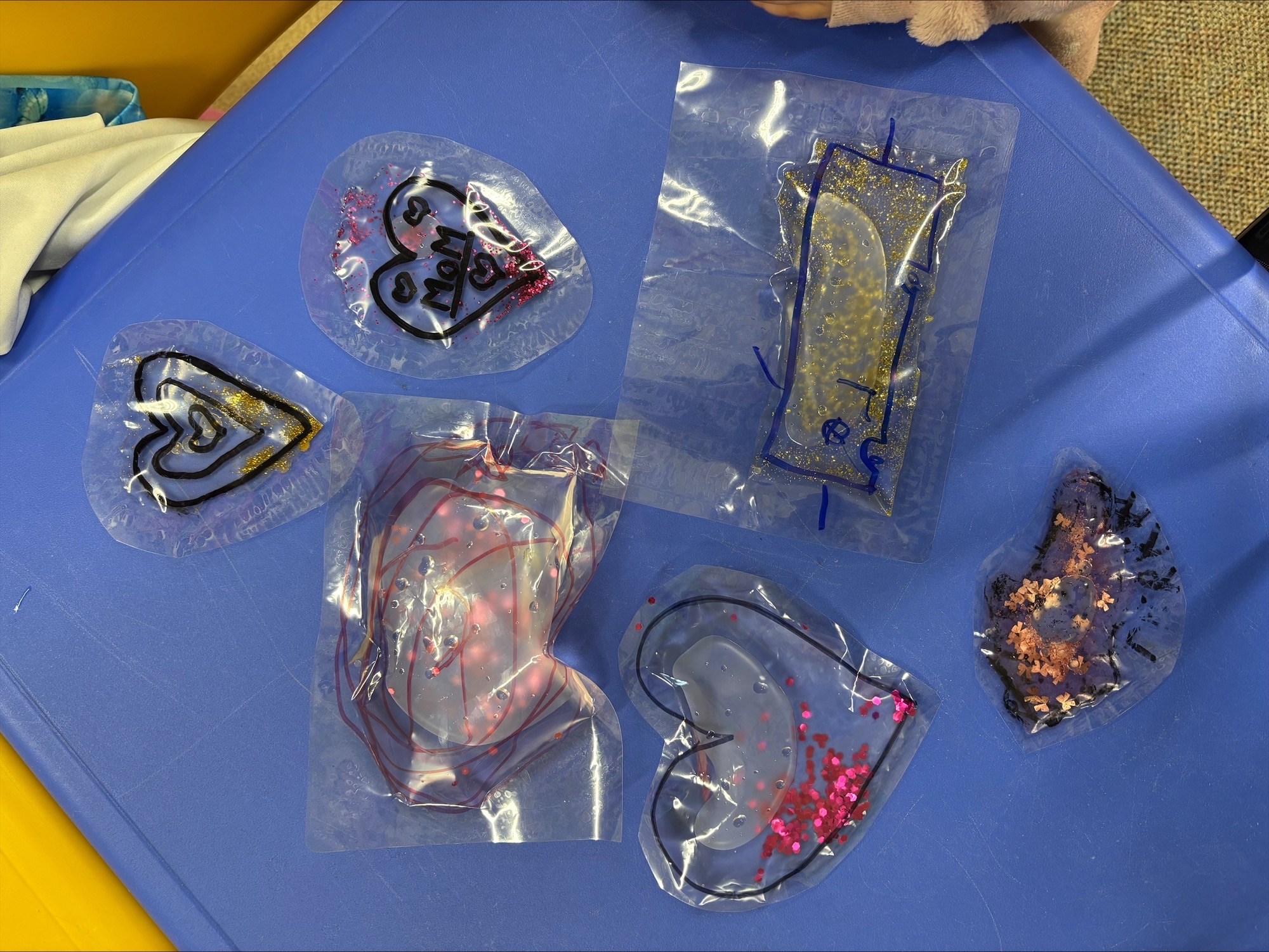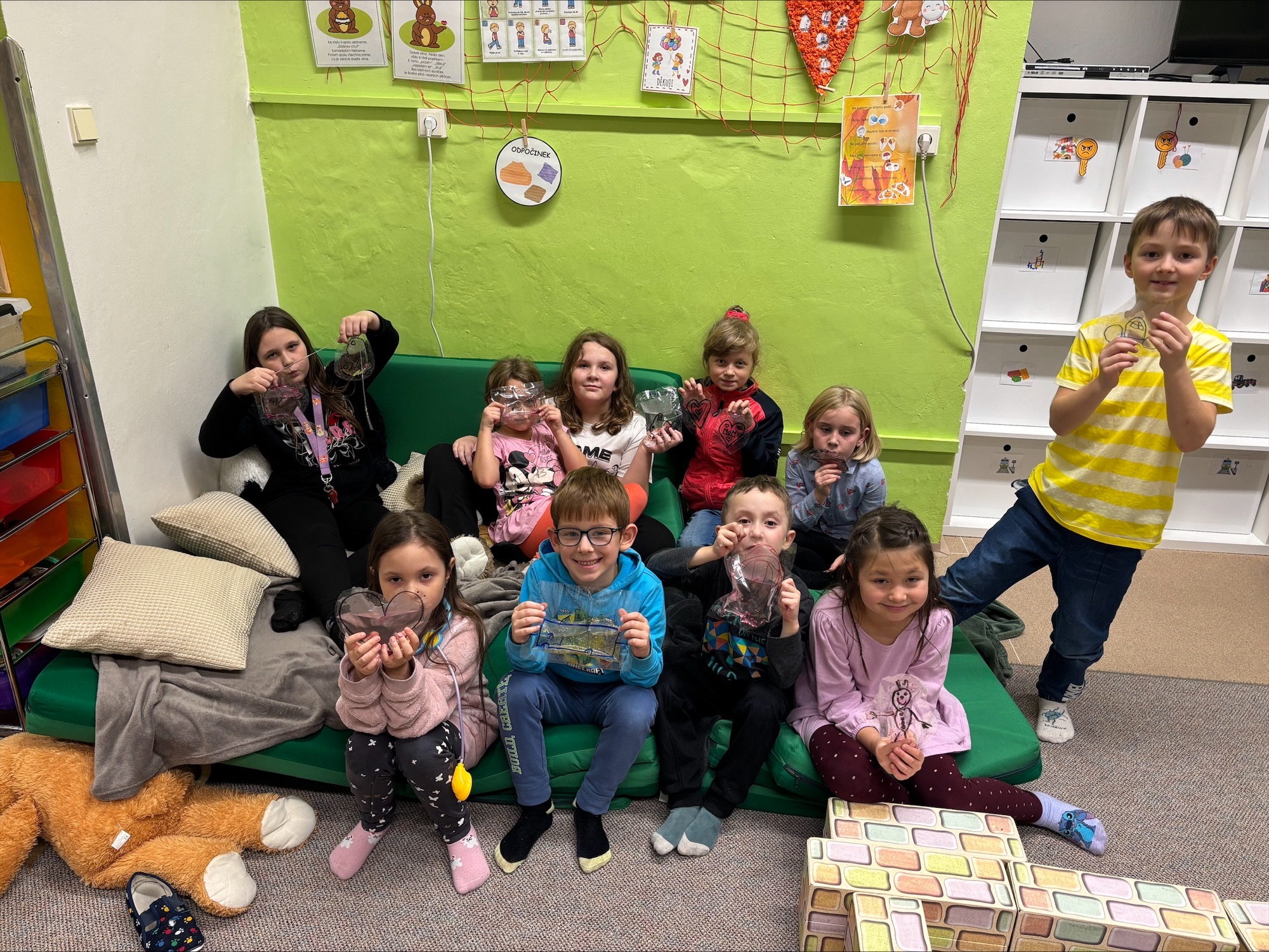 Vyráběli jsme vlastní antistresové hračky z laminovací fólie, vody a třpytek. Děti si tvoření moc užily.