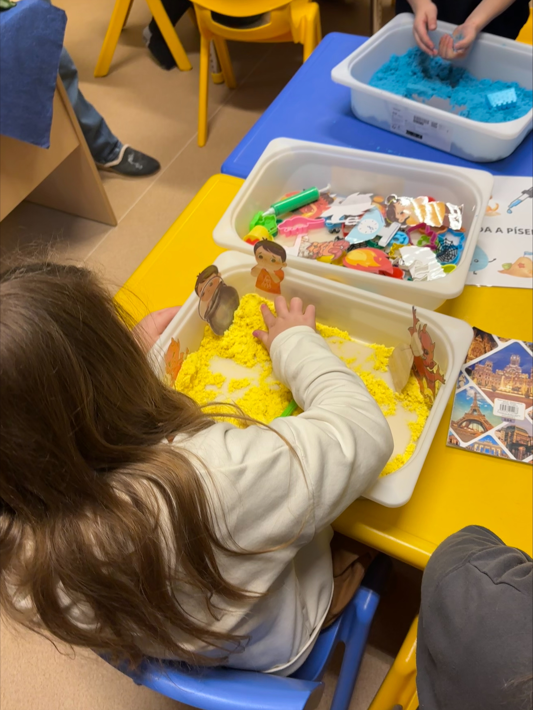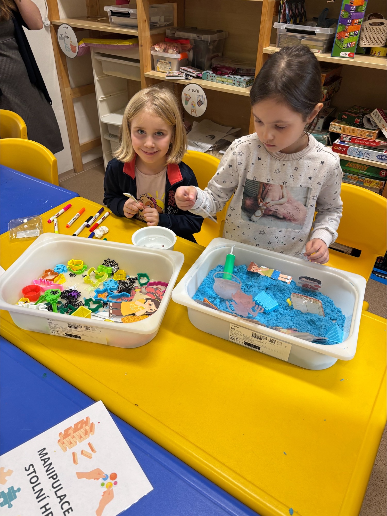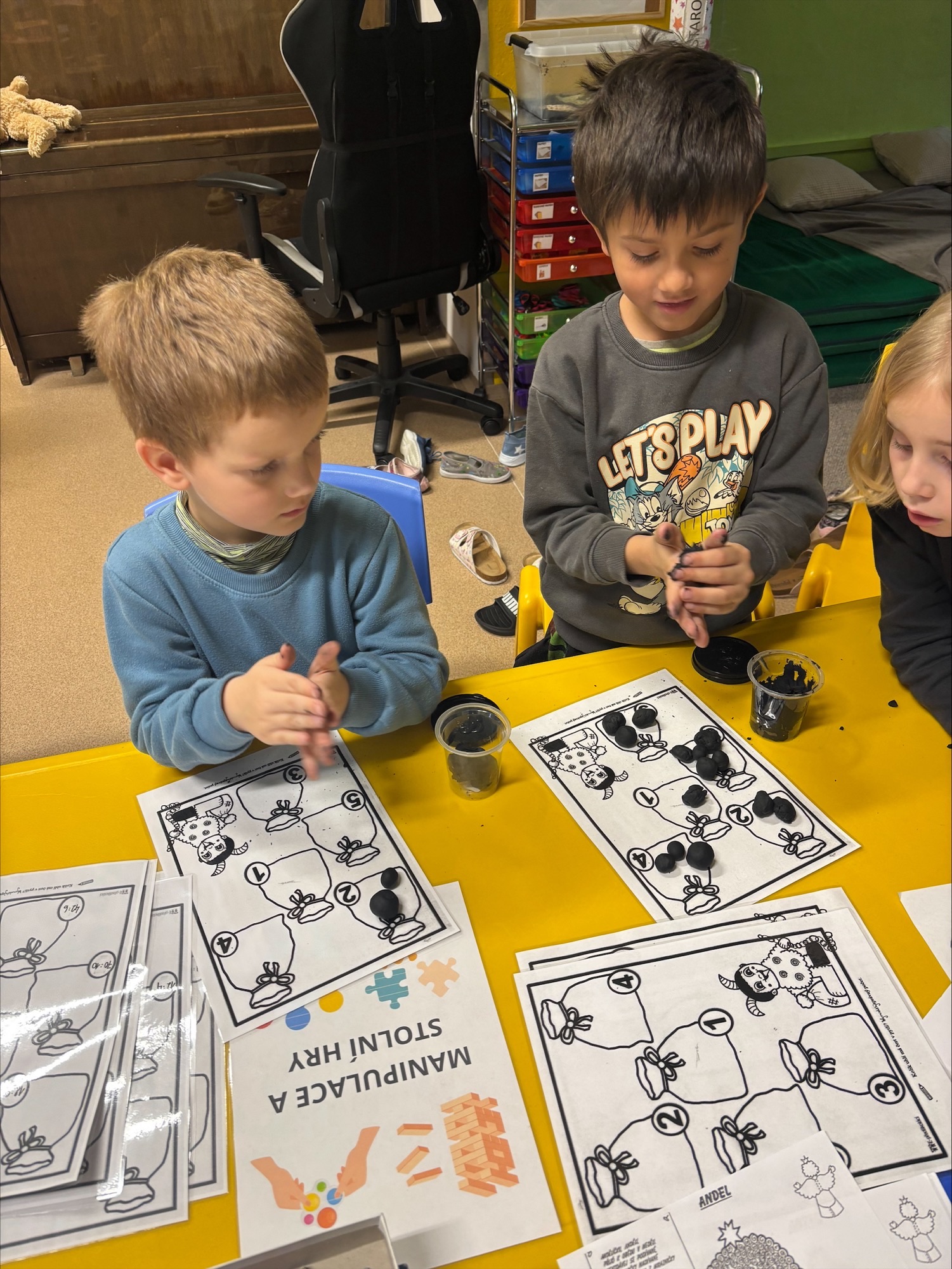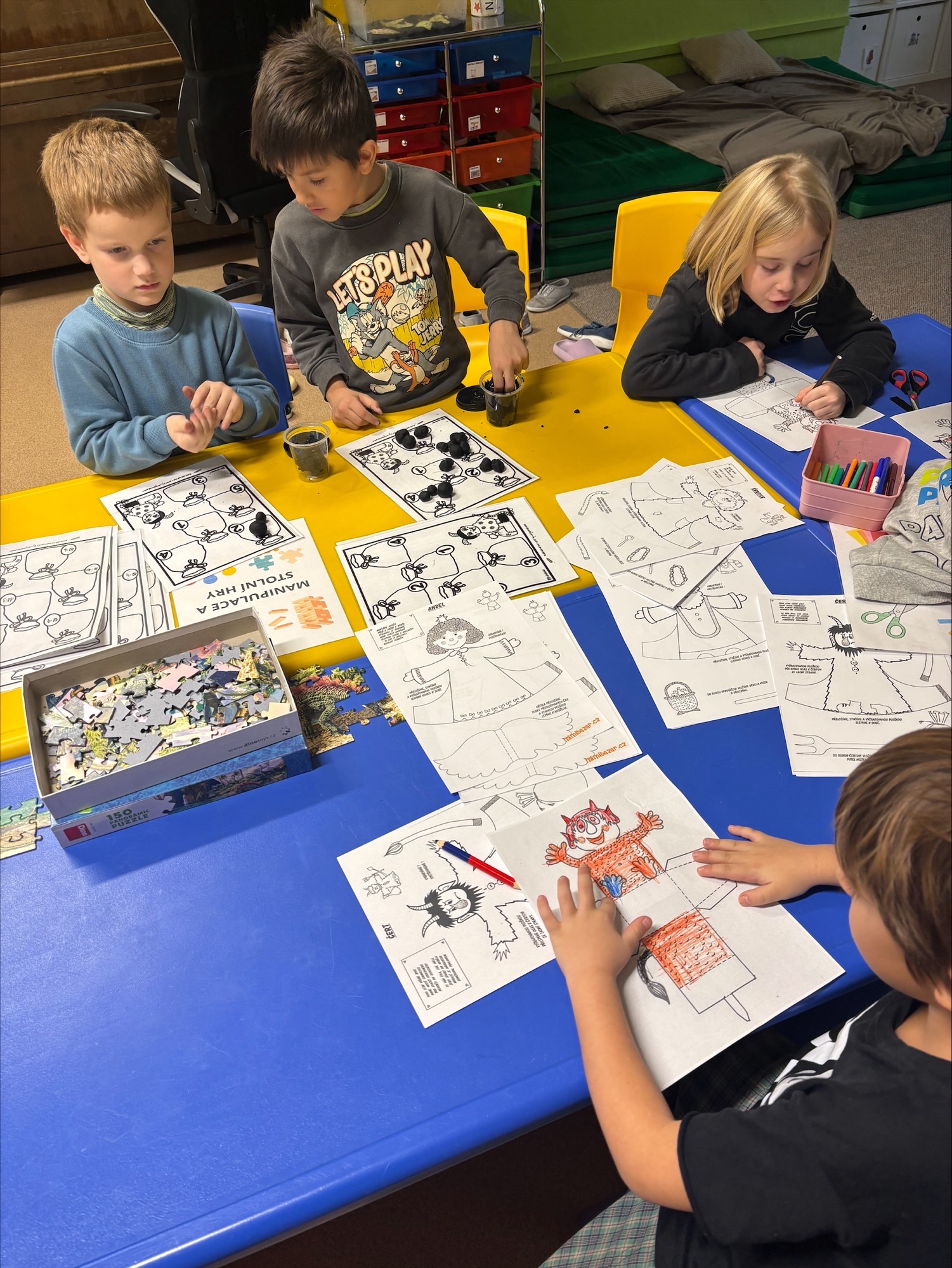 Na čertovskou návštěvu jsme se připravovali už dopředu v centrech aktivit – modelovali jsme správný počet uhlíků do čertovského pytle, vyráběli krabičky na odměny, stavěli peklo z kostek i z písku a plnili mnoho dalších tvořivých úkolů. Celá družina se tak naladila na pravou čertovskou atmosféru.