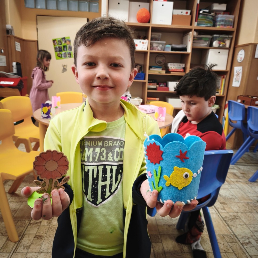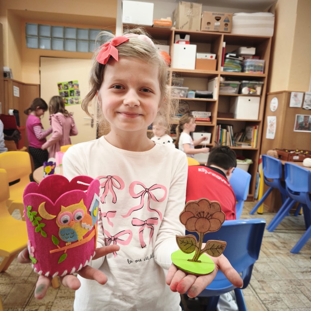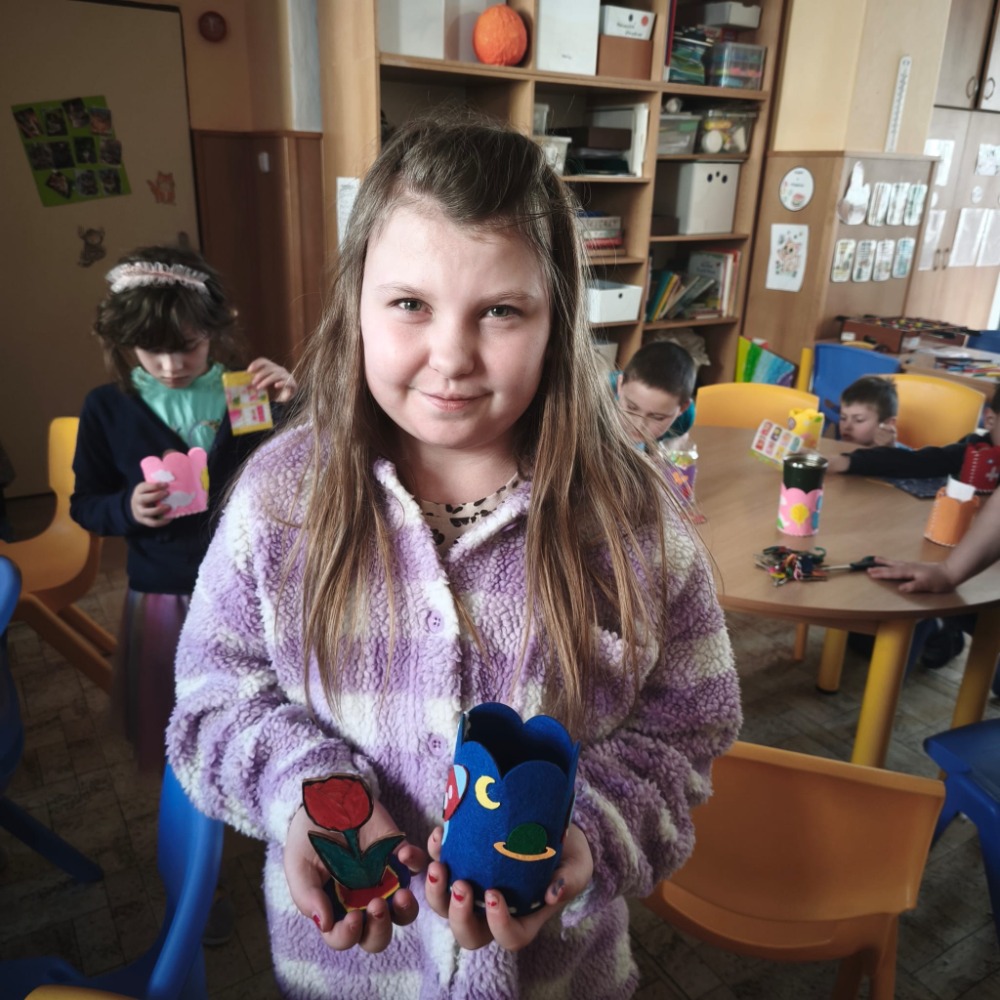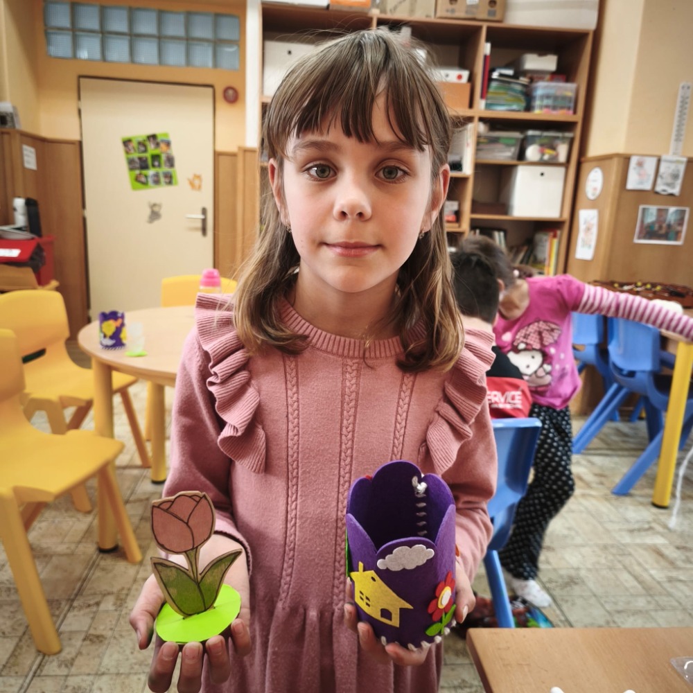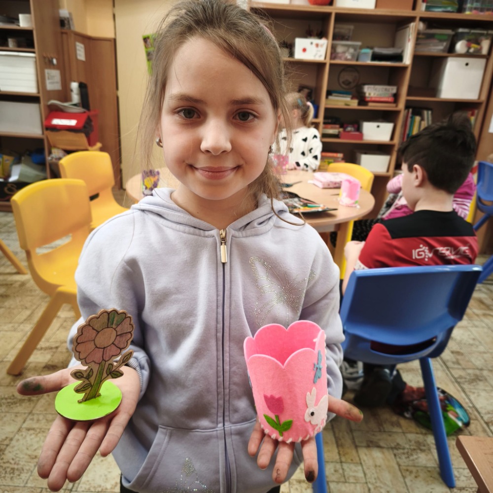 Kromě toho děti také vybarvovaly dřevěnou jarní kytičku, která krásně doplnila jejich tvoření.