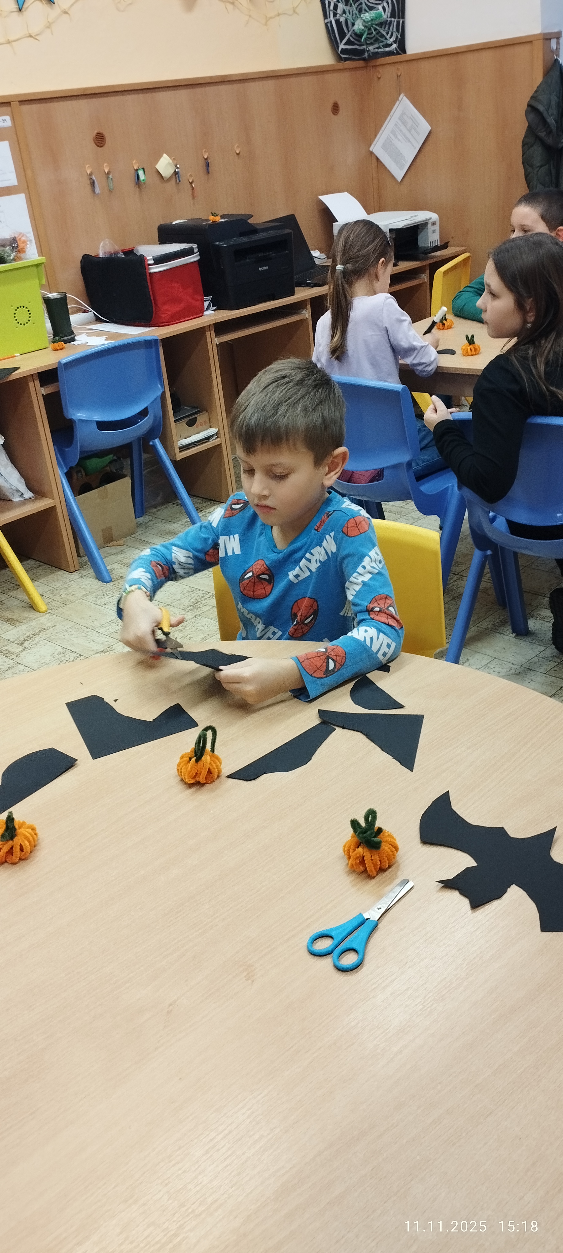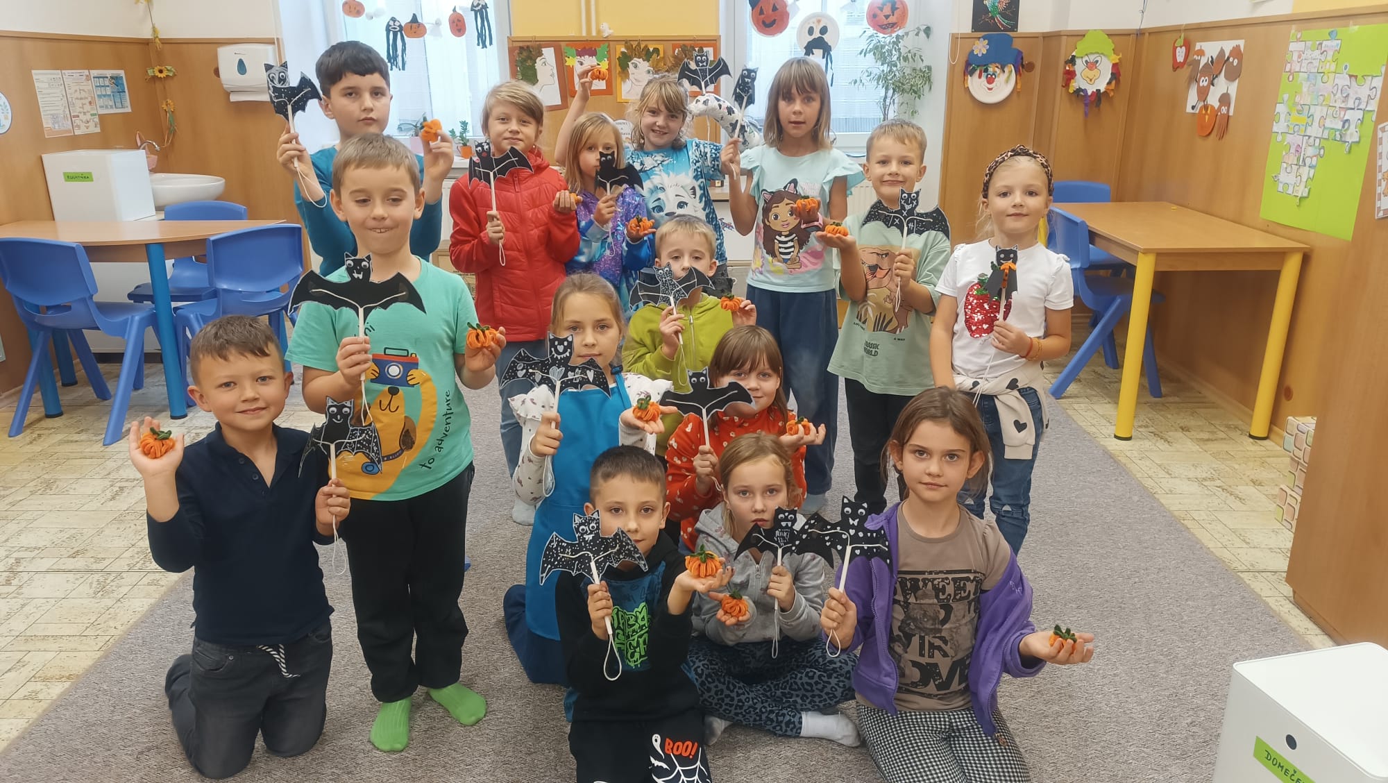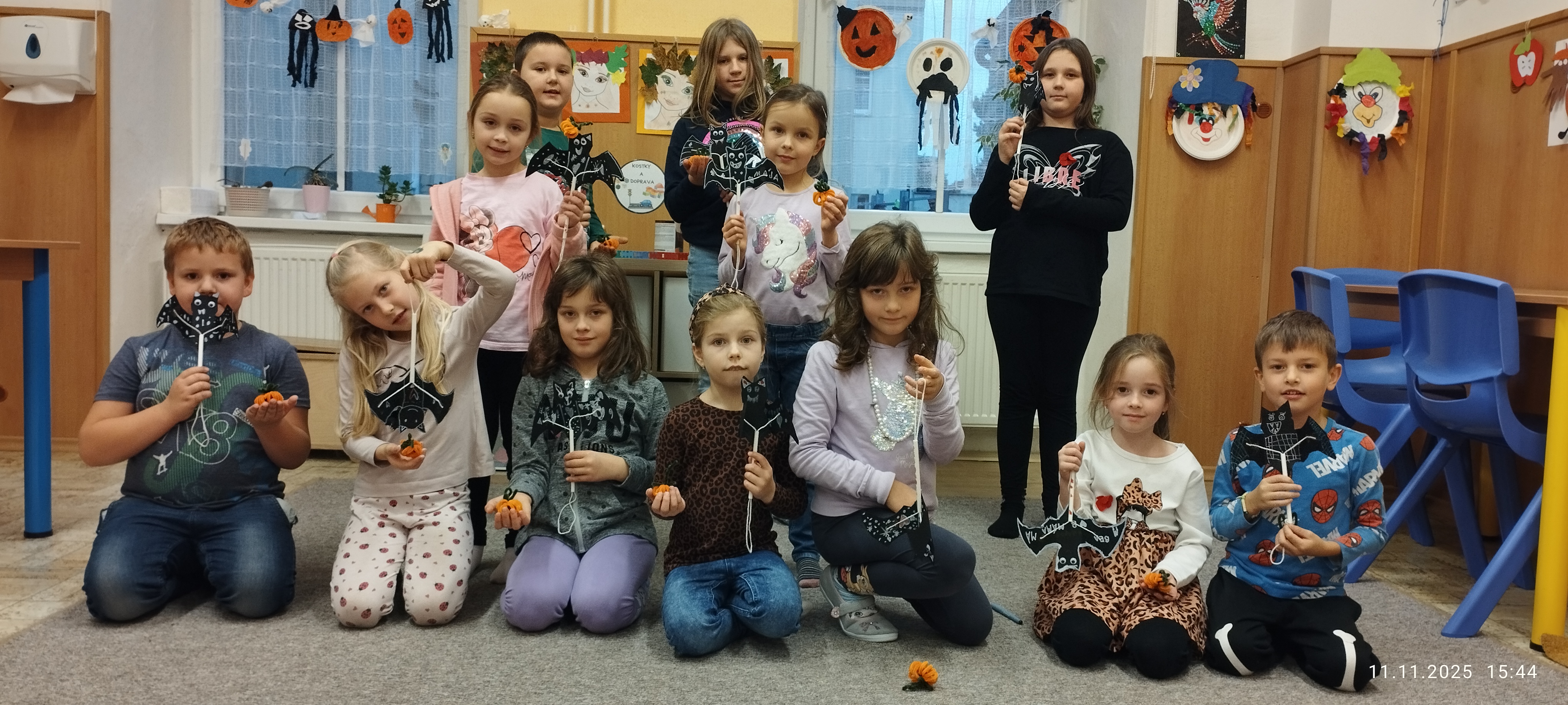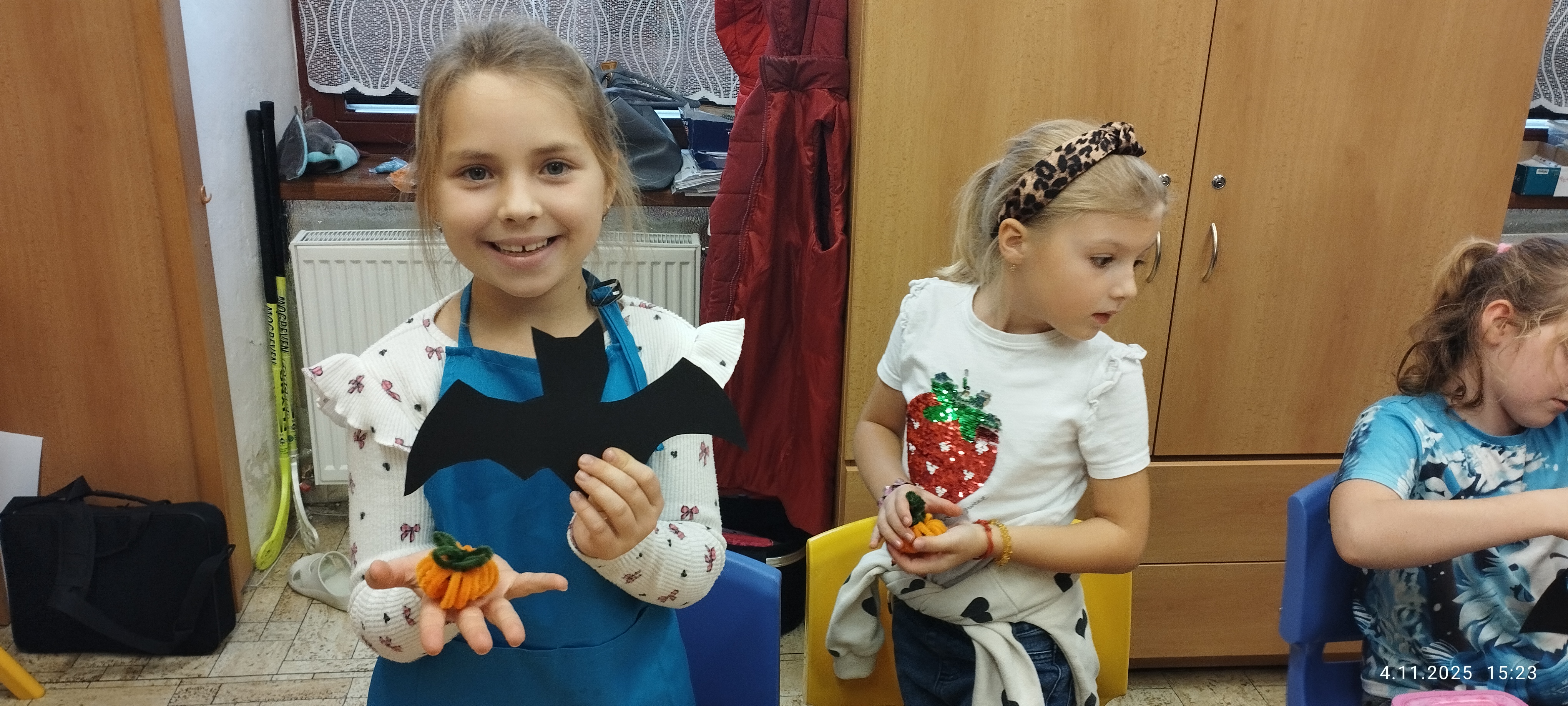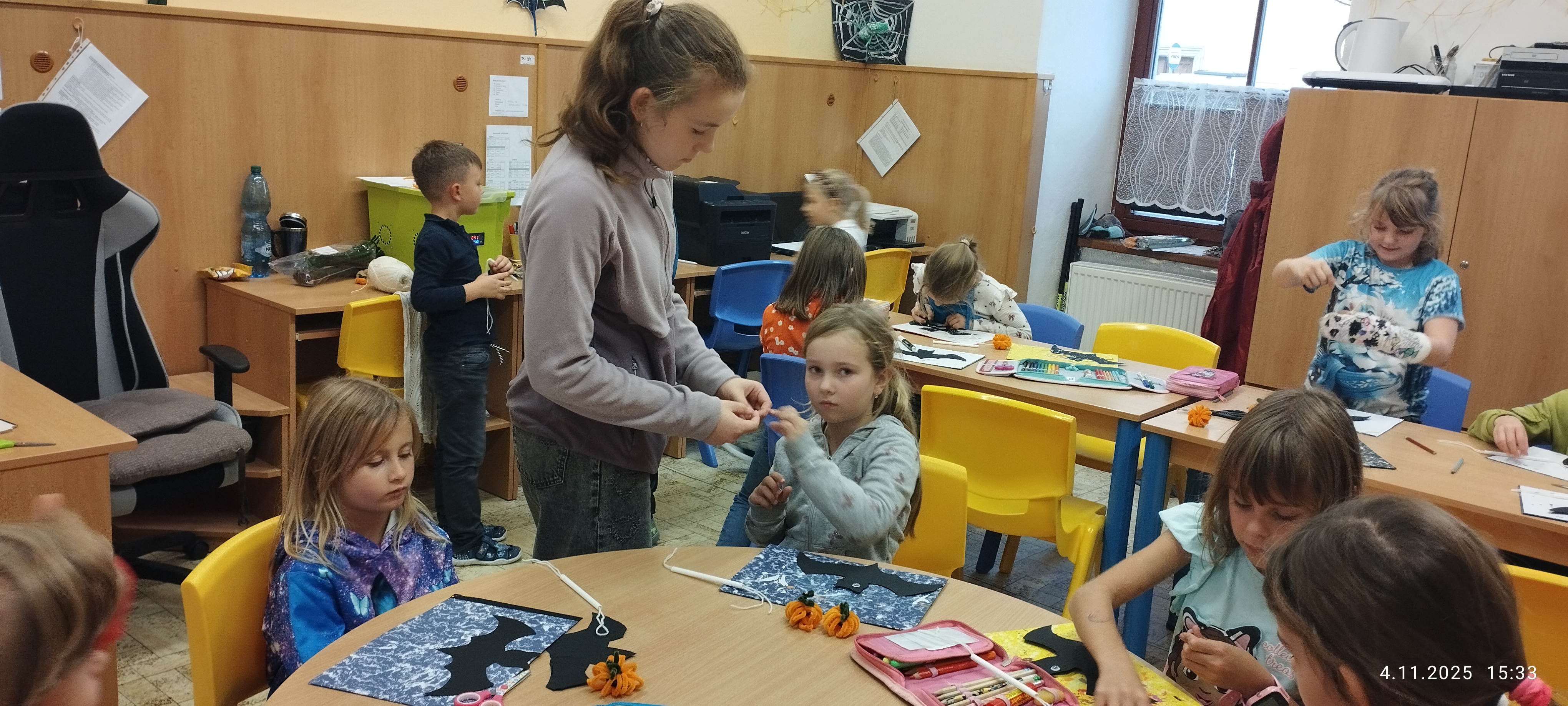 Tentokrát jsme si práci rozdělili do dvou skupin. Nejprve děti pod vedením paní vychovatelky vyráběly dýni z chlupatého drátku. Poté si vzala slovo Ema, která nám chodí pomáhat jako bývalá účastnice kroužku. Společně s ní si děti vytvořily papírového netopýra s pohyblivými křídly. Protože nám na konci kroužku ještě zbyla chvilka, užili jsme si i zábavu pomocí her.