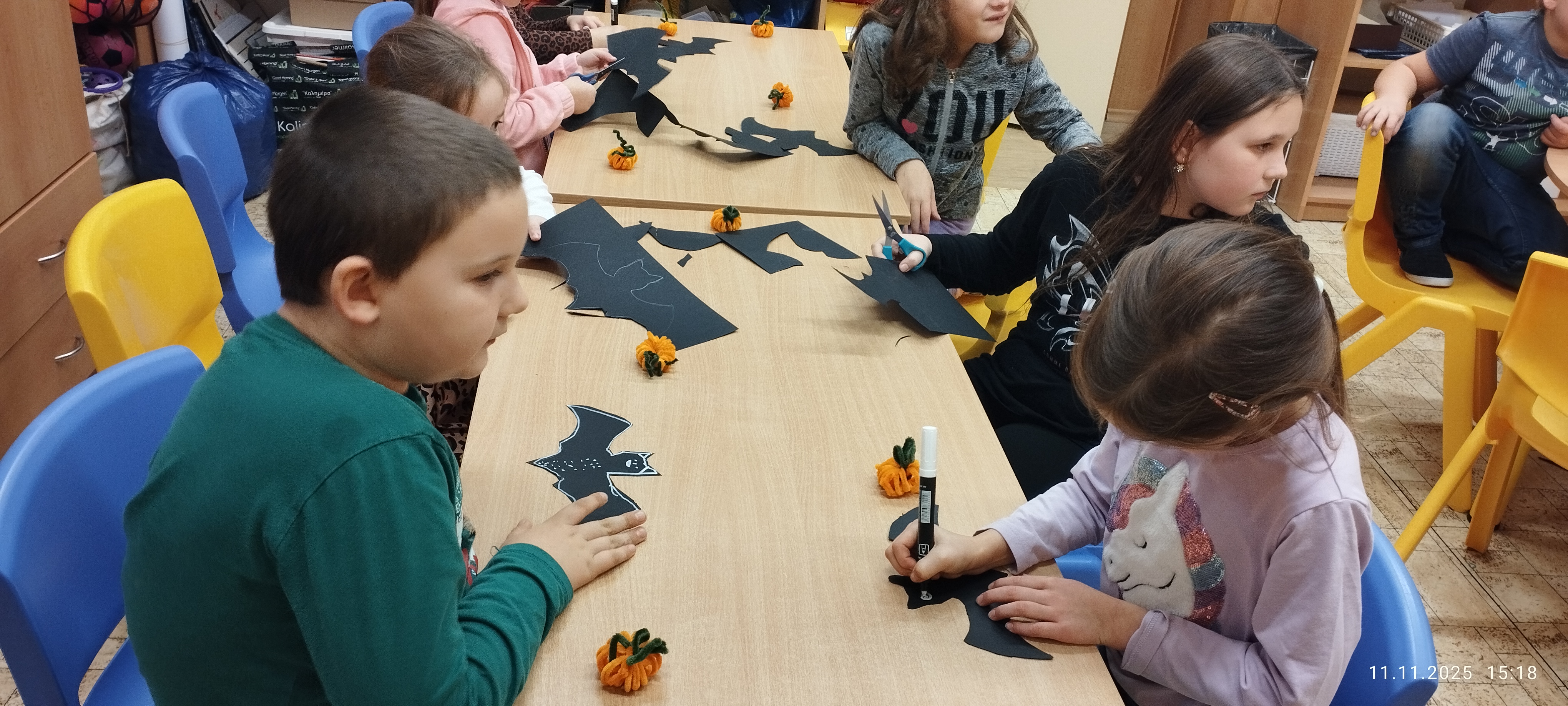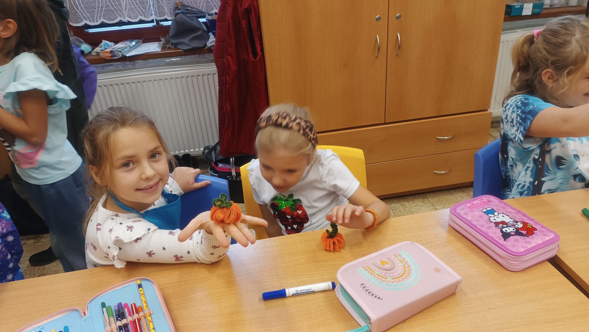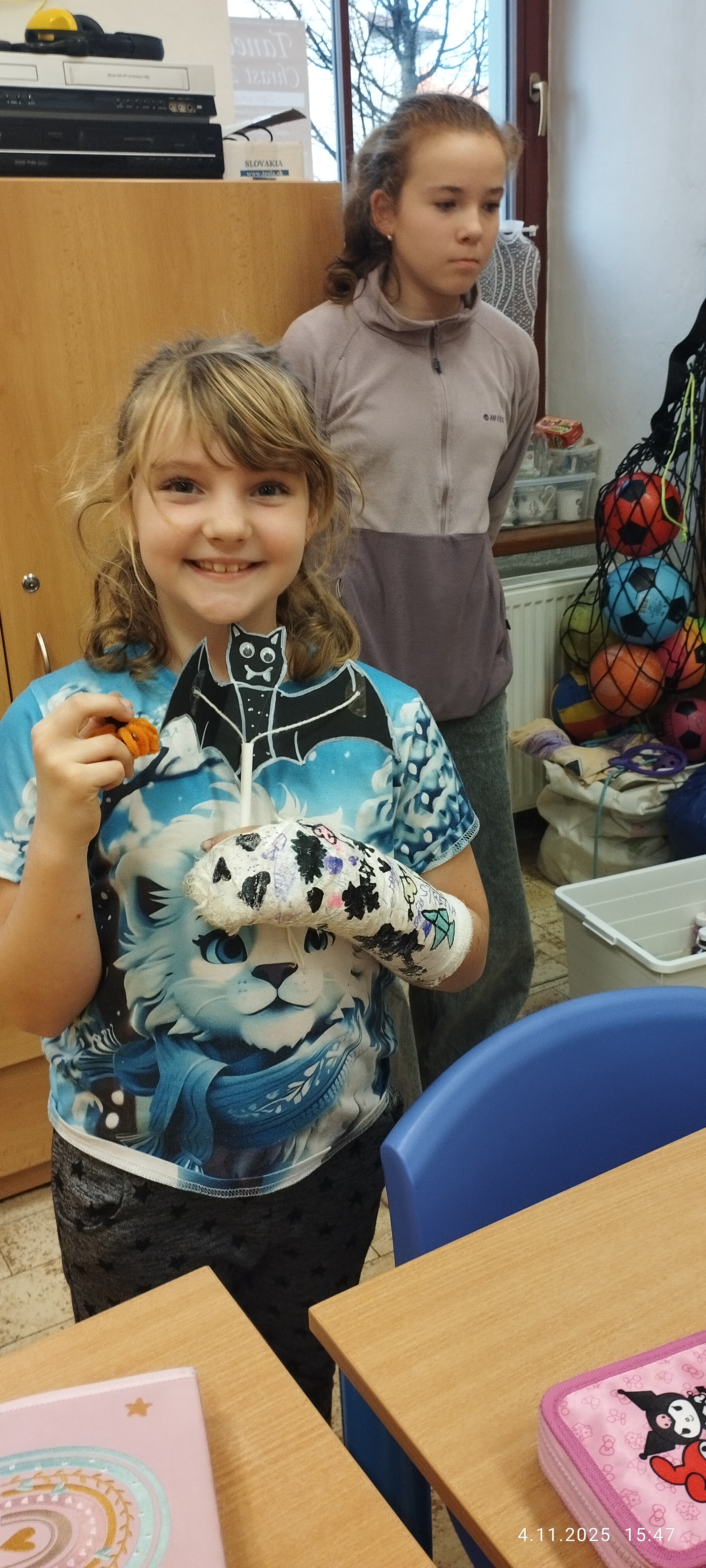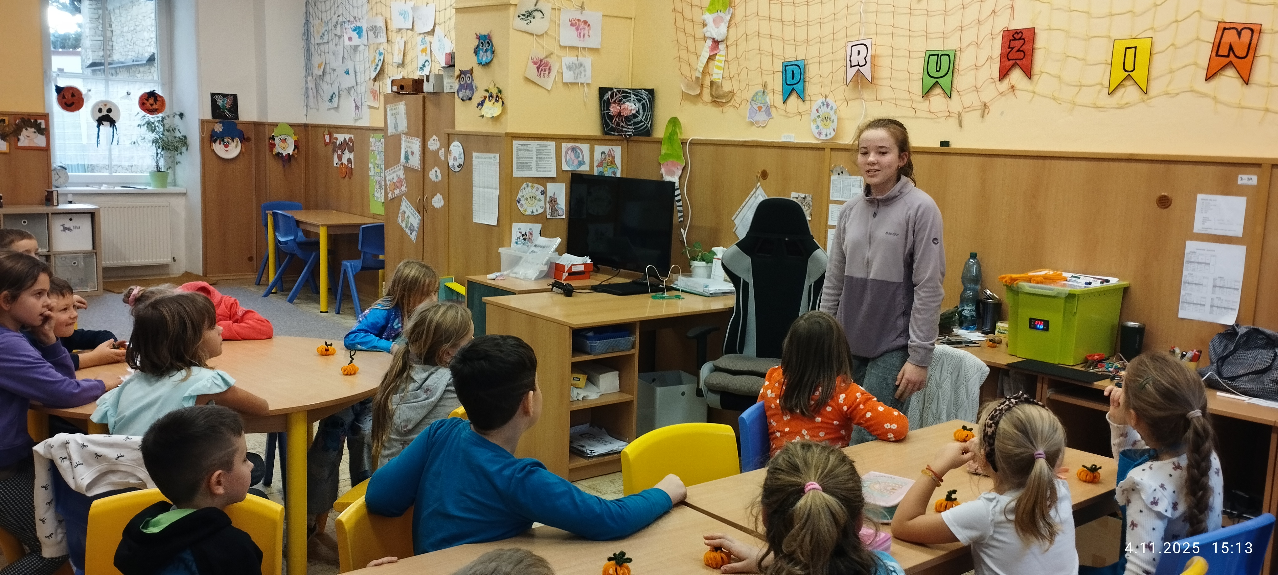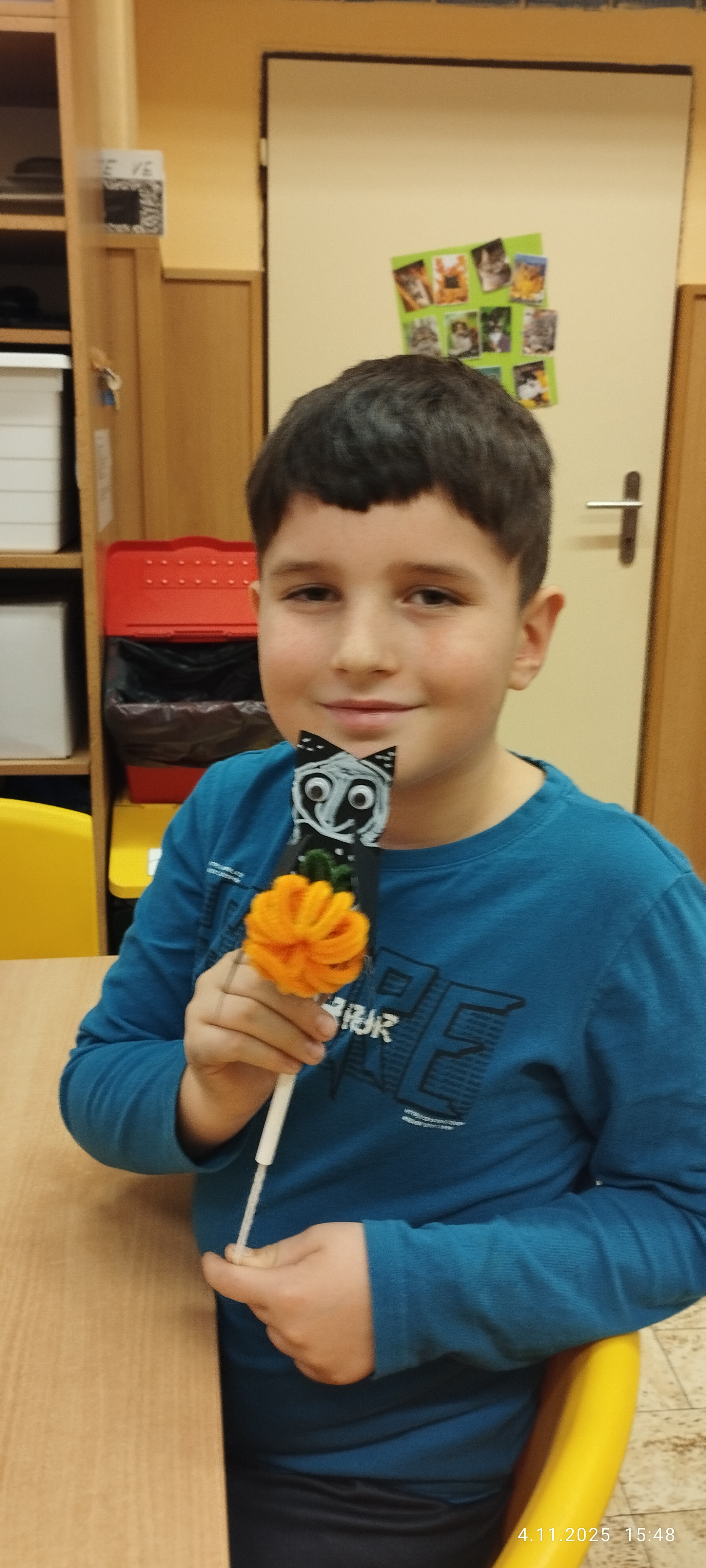 Tentokrát jsme si práci rozdělili do dvou skupin. Nejprve děti pod vedením paní vychovatelky vyráběly dýni z chlupatého drátku. Poté si vzala slovo Ema, která nám chodí pomáhat jako bývalá účastnice kroužku. Společně s ní si děti vytvořily papírového netopýra s pohyblivými křídly. Protože nám na konci kroužku ještě zbyla chvilka, užili jsme si i zábavu pomocí her.