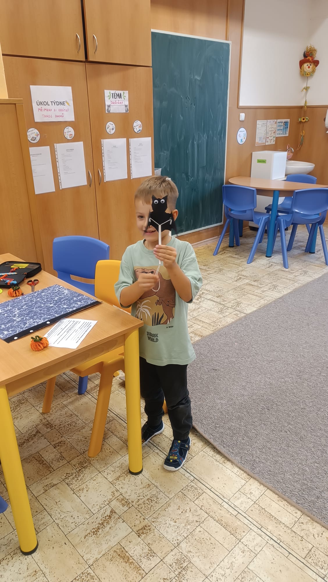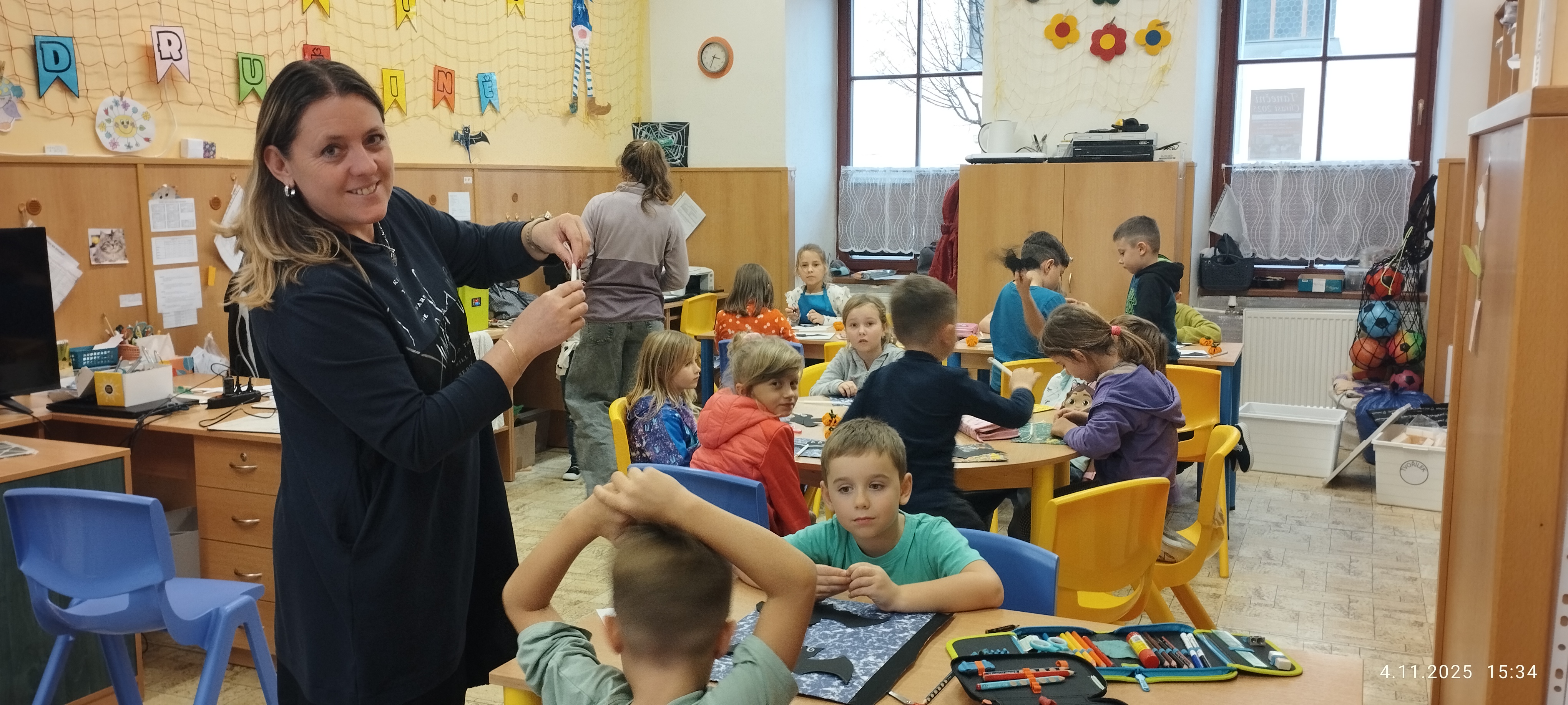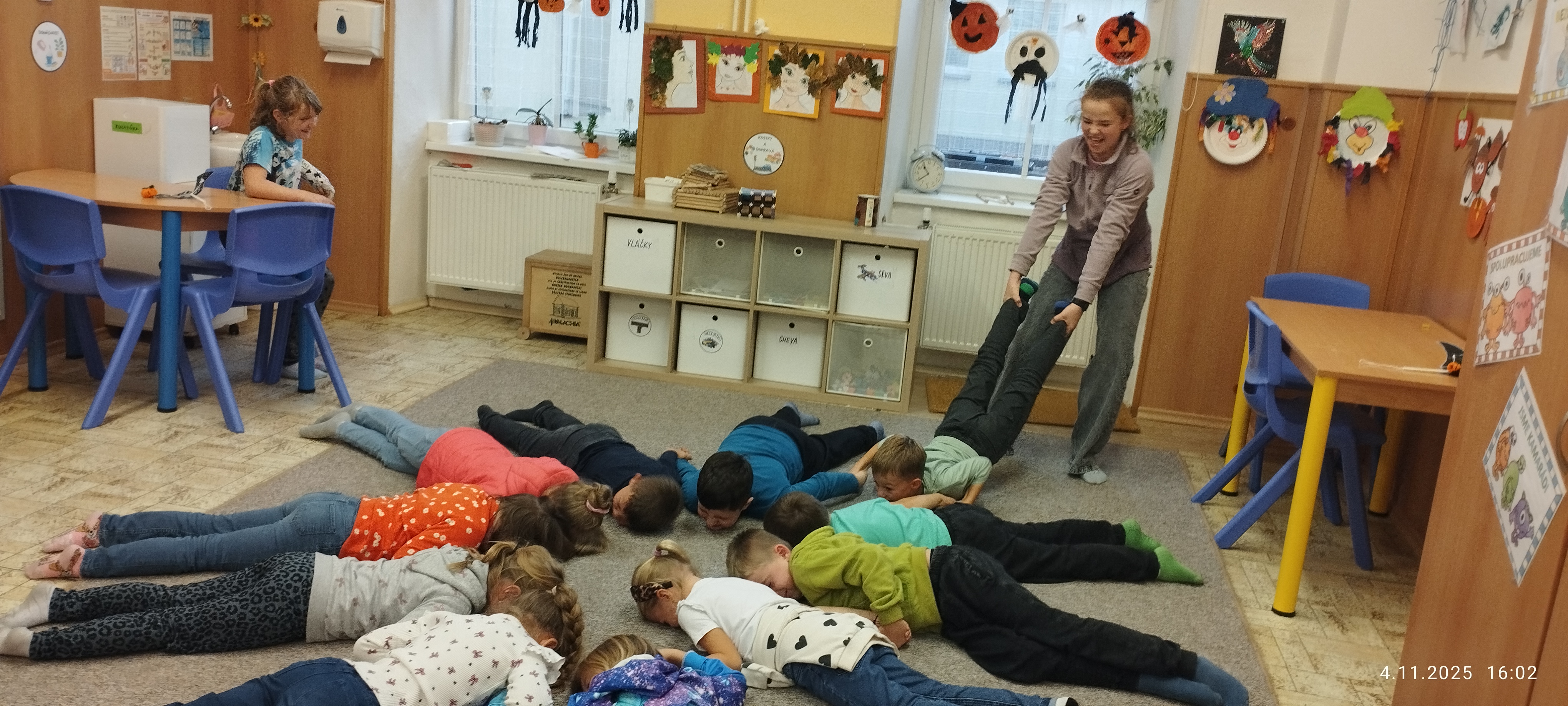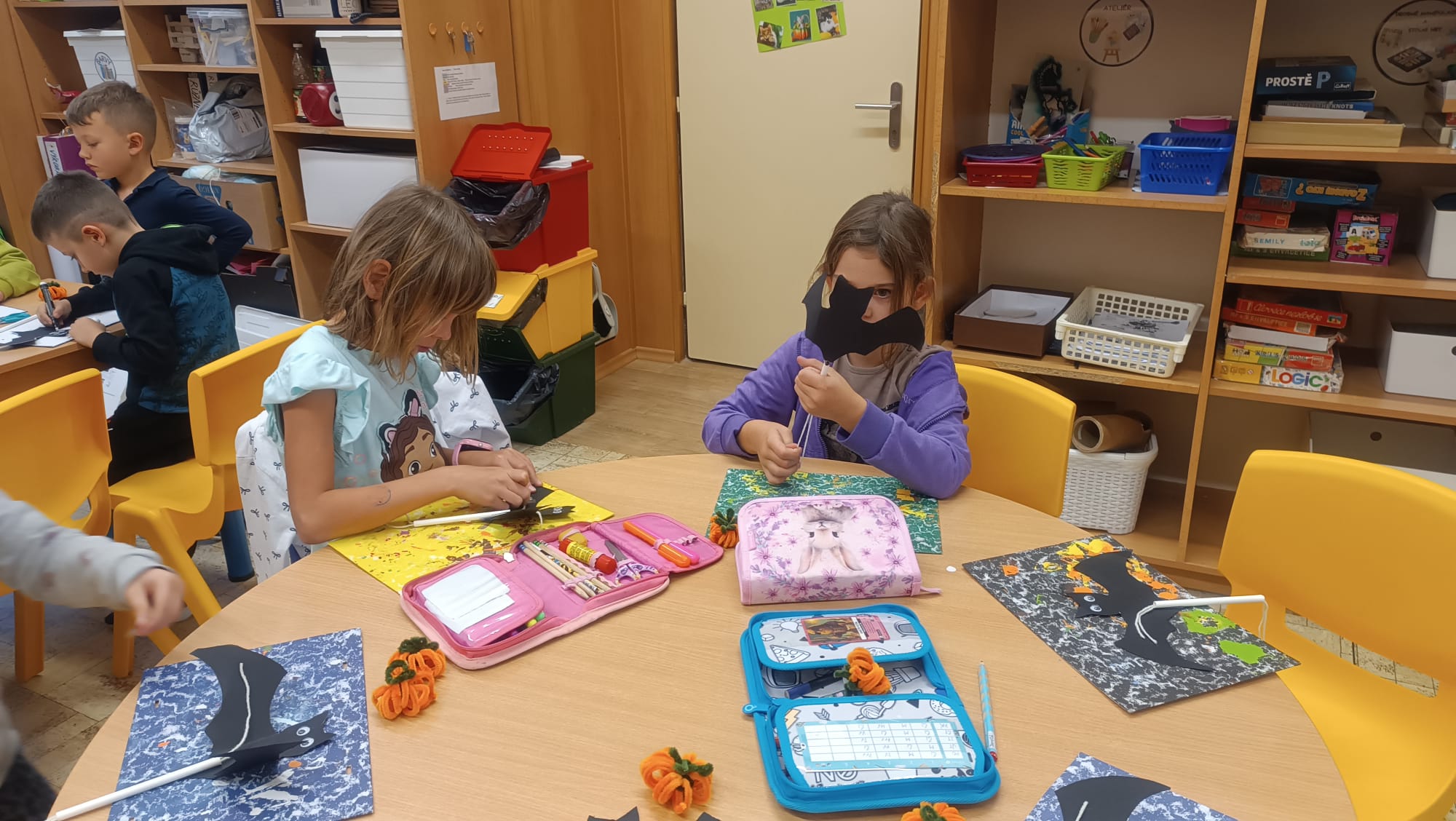 Tentokrát jsme si práci rozdělili do dvou skupin. Nejprve děti pod vedením paní vychovatelky vyráběly dýni z chlupatého drátku. Poté si vzala slovo Ema, která nám chodí pomáhat jako bývalá účastnice kroužku. Společně s ní si děti vytvořily papírového netopýra s pohyblivými křídly. Protože nám na konci kroužku ještě zbyla chvilka, užili jsme si i zábavu pomocí her.