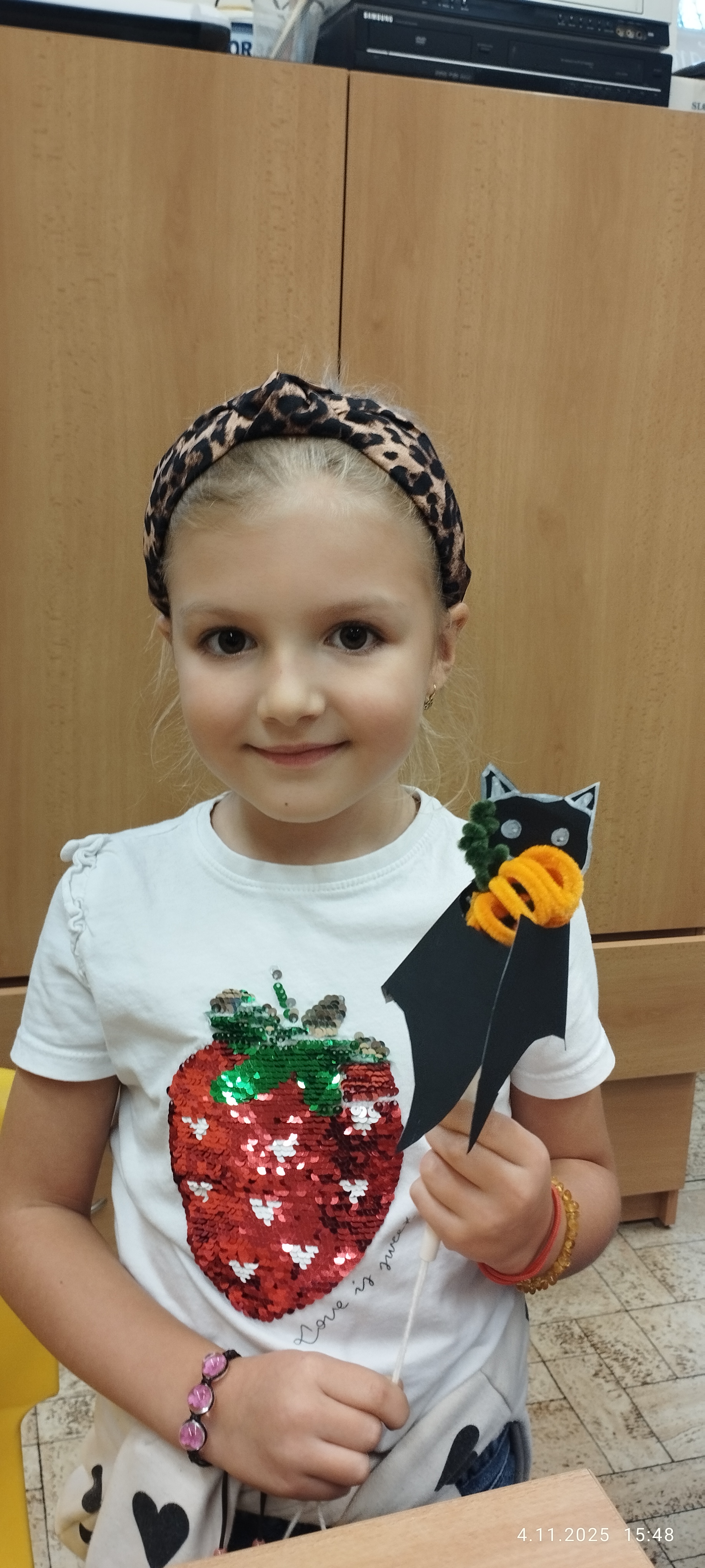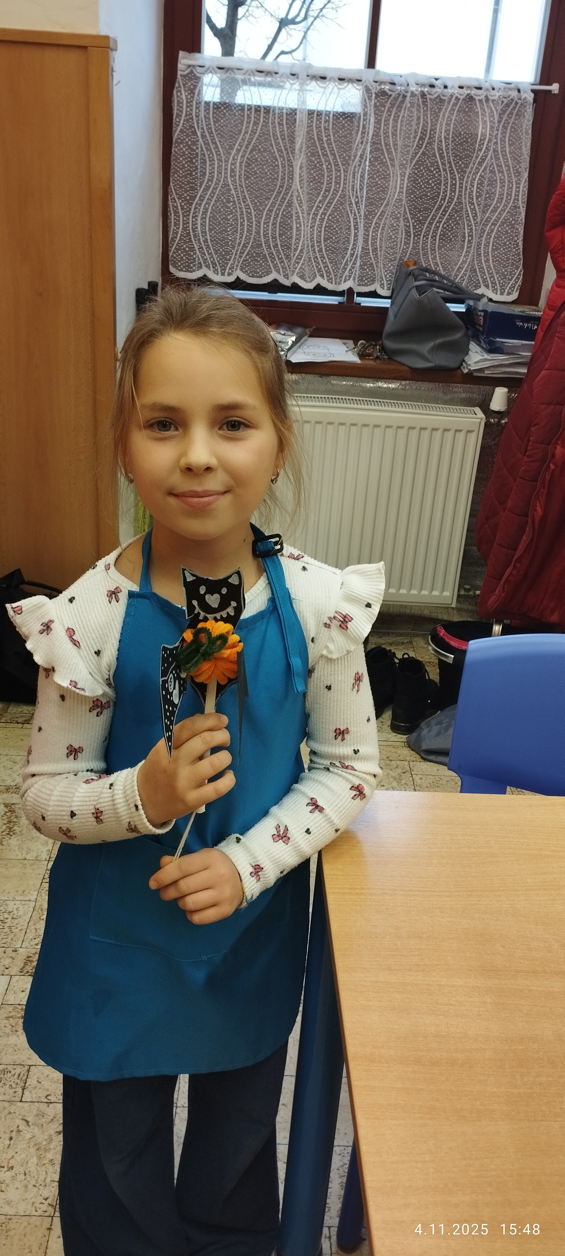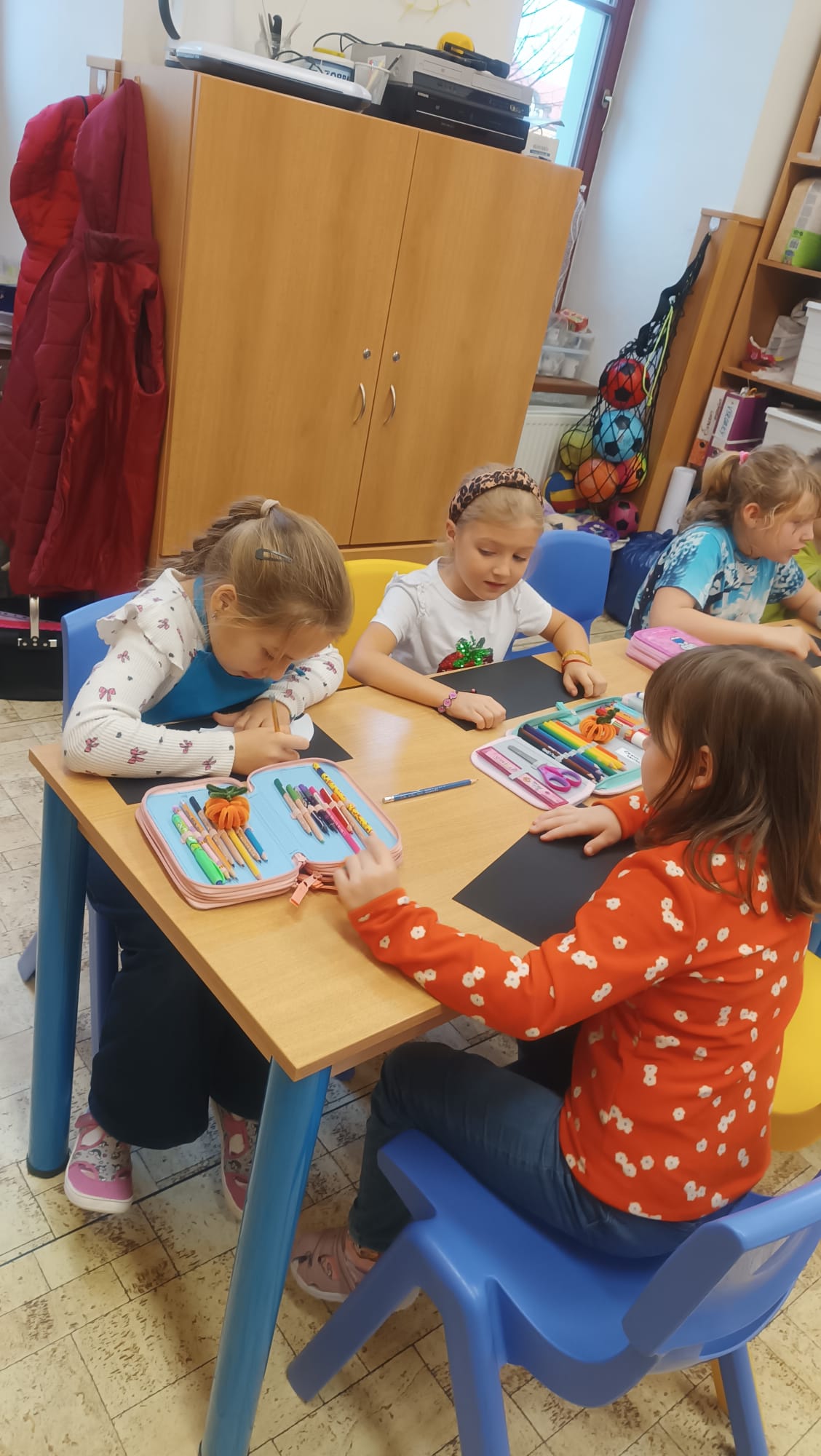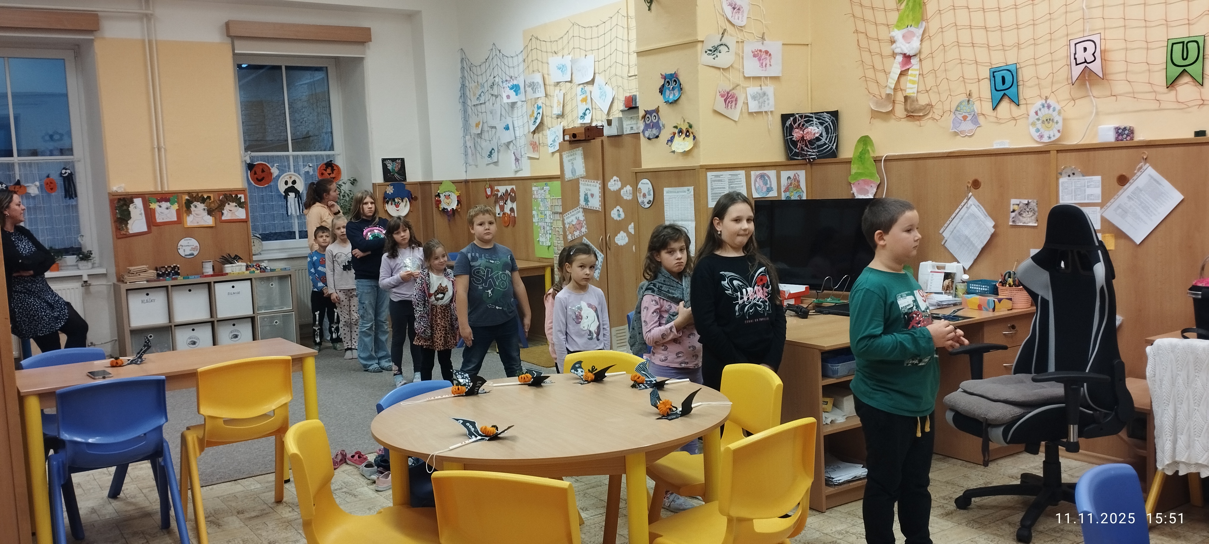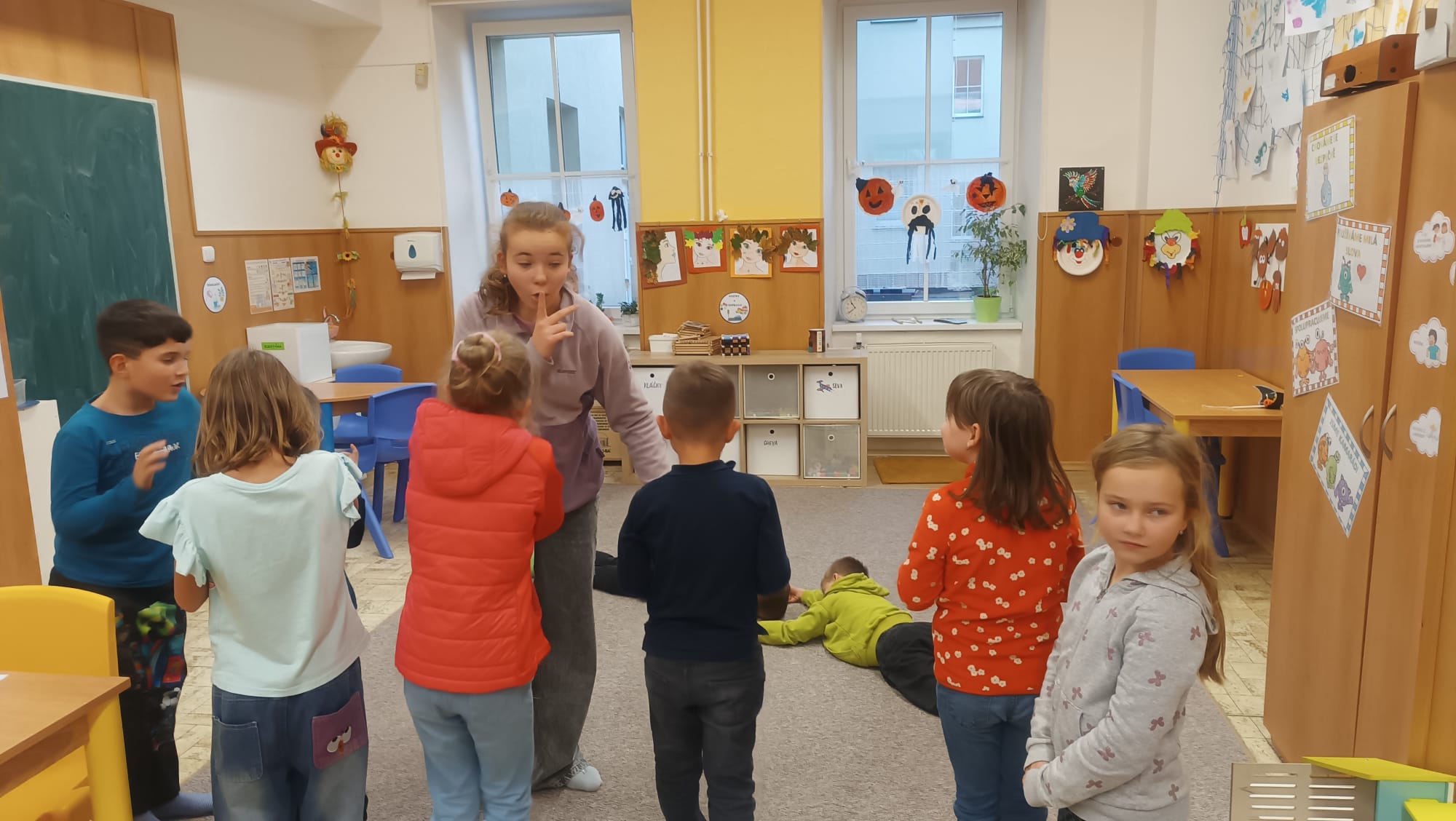 Tentokrát jsme si práci rozdělili do dvou skupin. Nejprve děti pod vedením paní vychovatelky vyráběly dýni z chlupatého drátku. Poté si vzala slovo Ema, která nám chodí pomáhat jako bývalá účastnice kroužku. Společně s ní si děti vytvořily papírového netopýra s pohyblivými křídly. Protože nám na konci kroužku ještě zbyla chvilka, užili jsme si i zábavu pomocí her.
