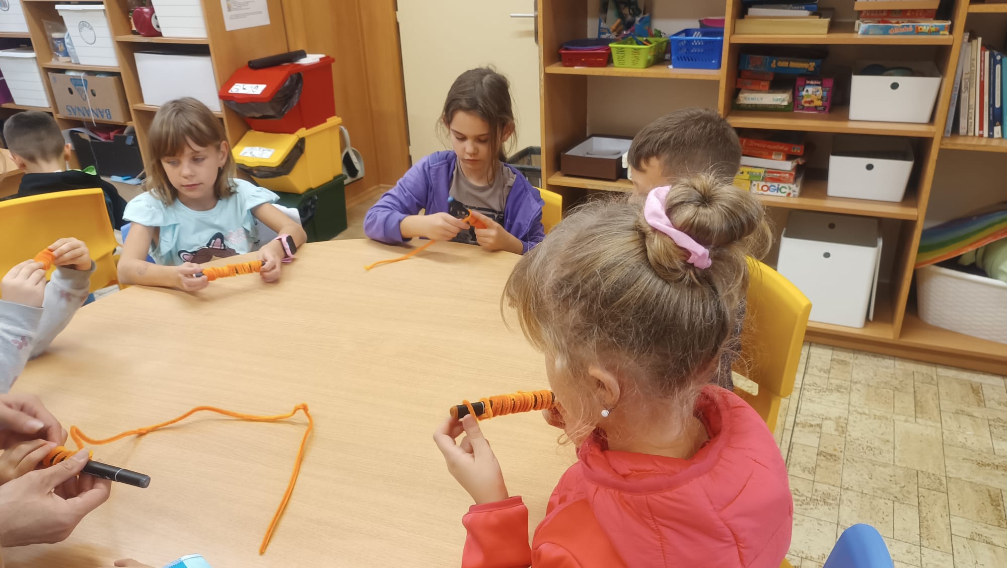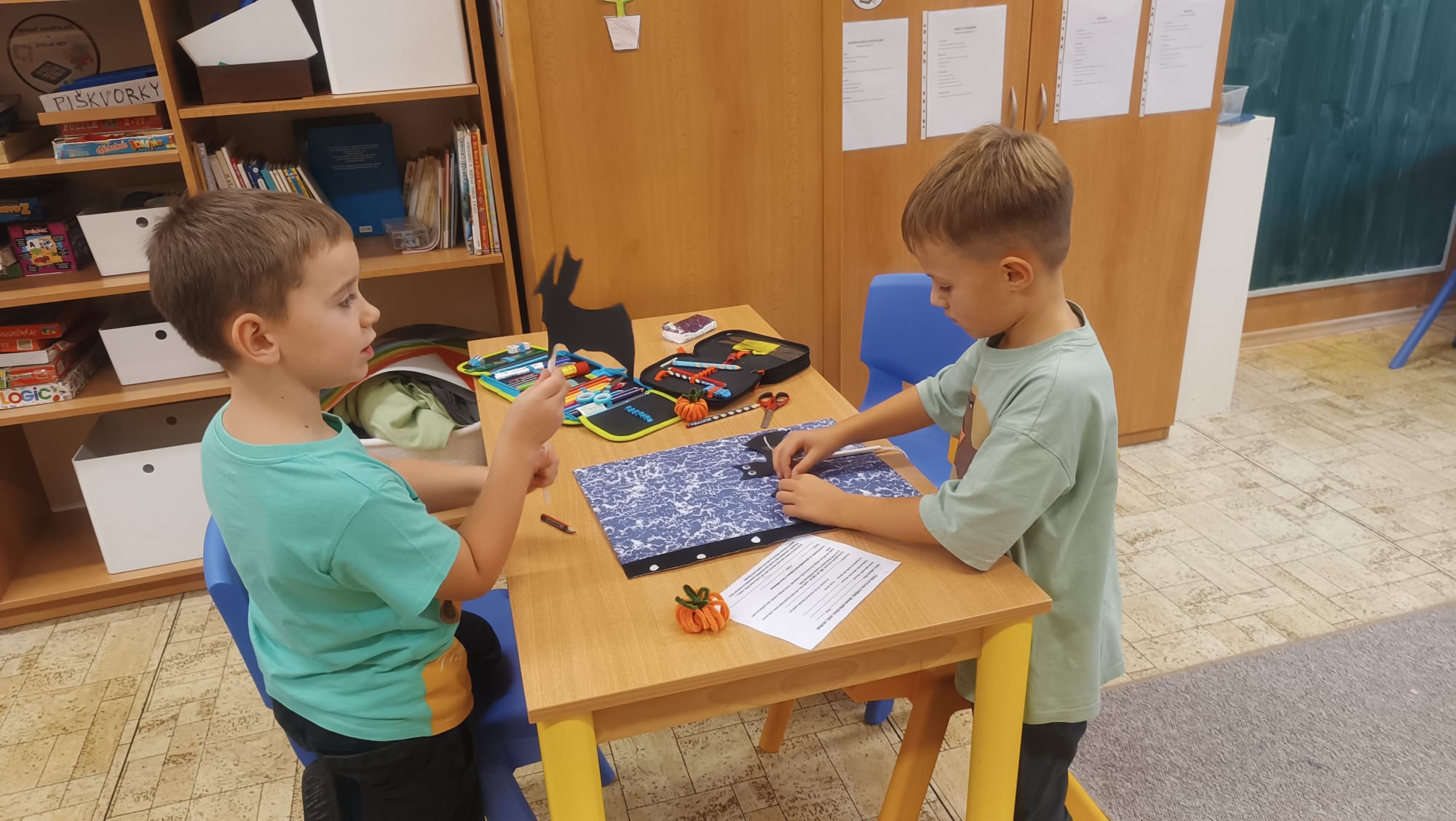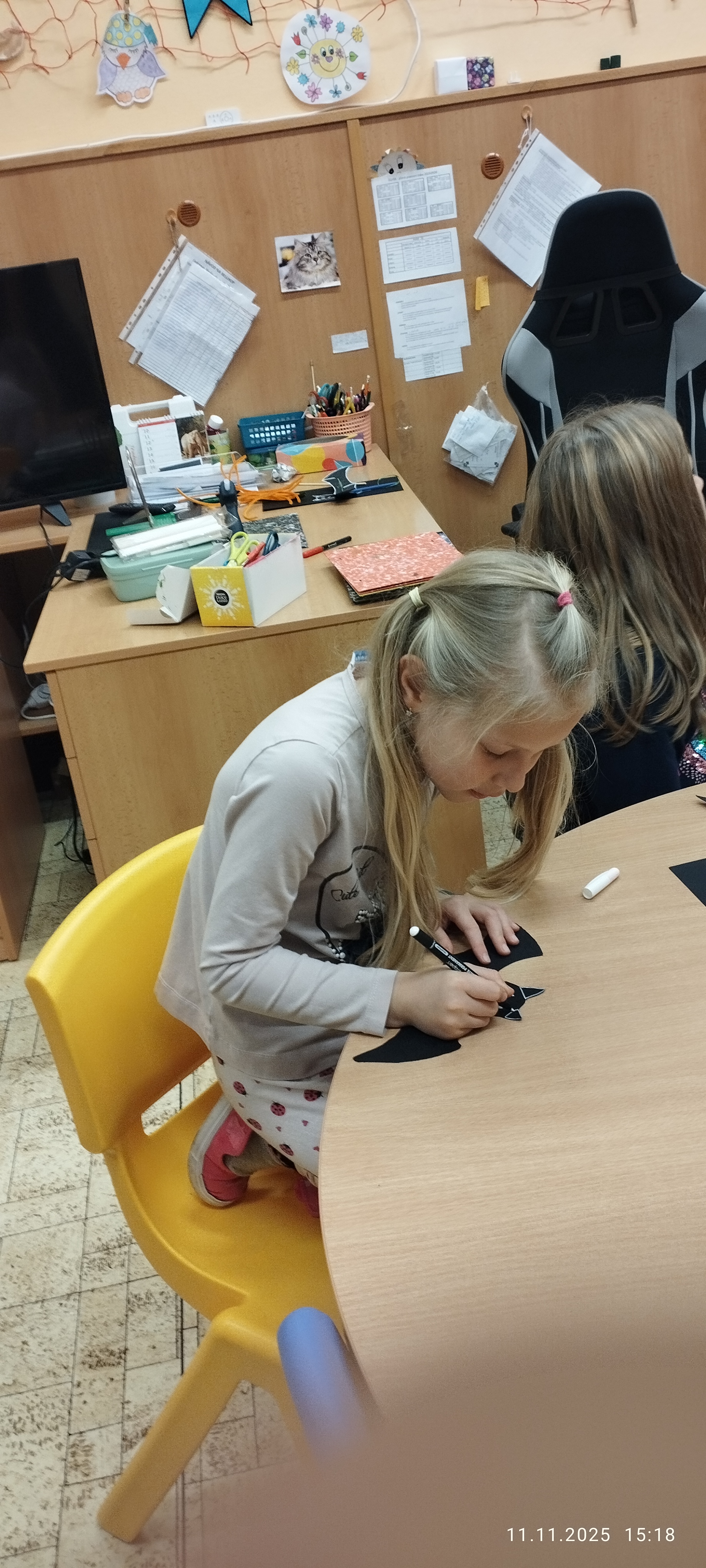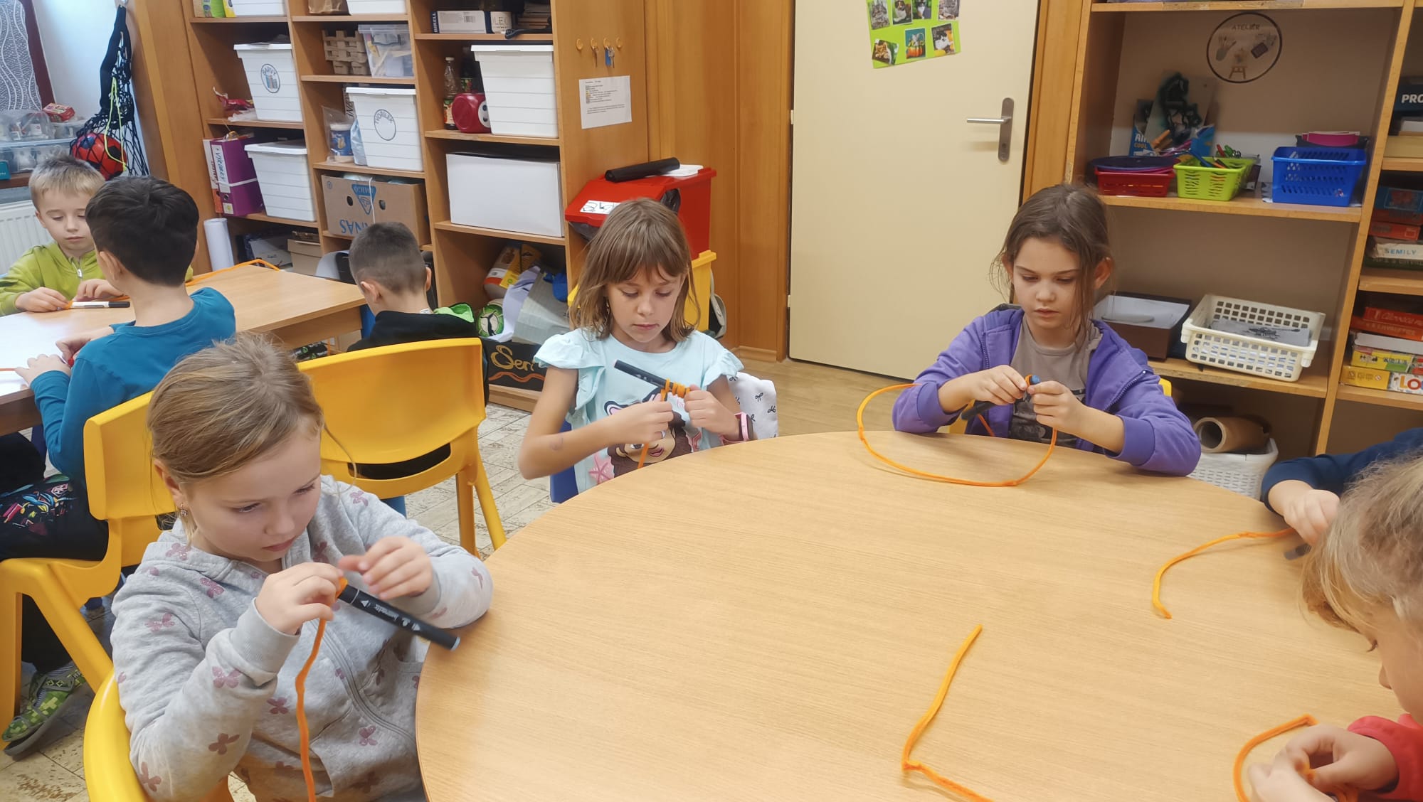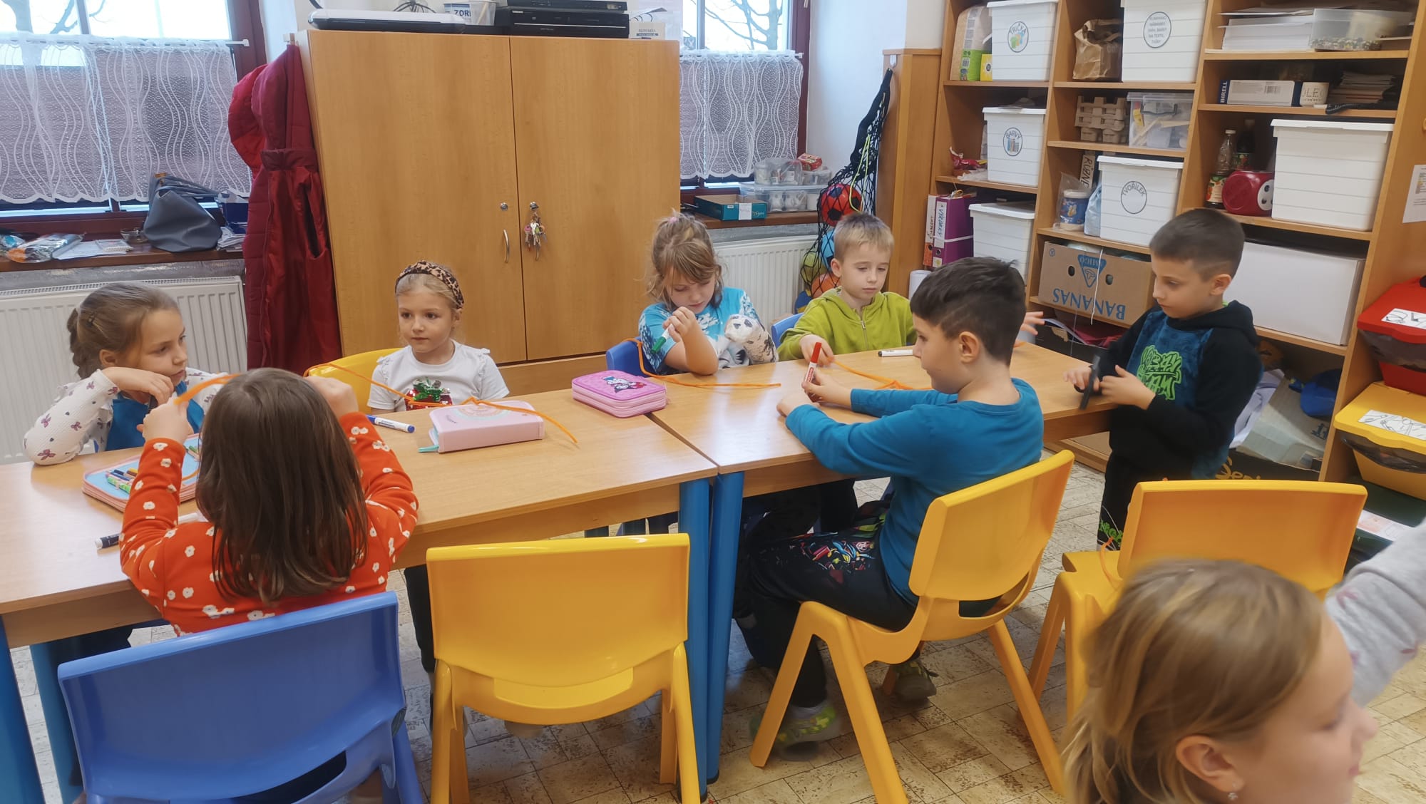 Tentokrát jsme si práci rozdělili do dvou skupin. Nejprve děti pod vedením paní vychovatelky vyráběly dýni z chlupatého drátku. Poté si vzala slovo Ema, která nám chodí pomáhat jako bývalá účastnice kroužku. Společně s ní si děti vytvořily papírového netopýra s pohyblivými křídly. Protože nám na konci kroužku ještě zbyla chvilka, užili jsme si i zábavu pomocí her.