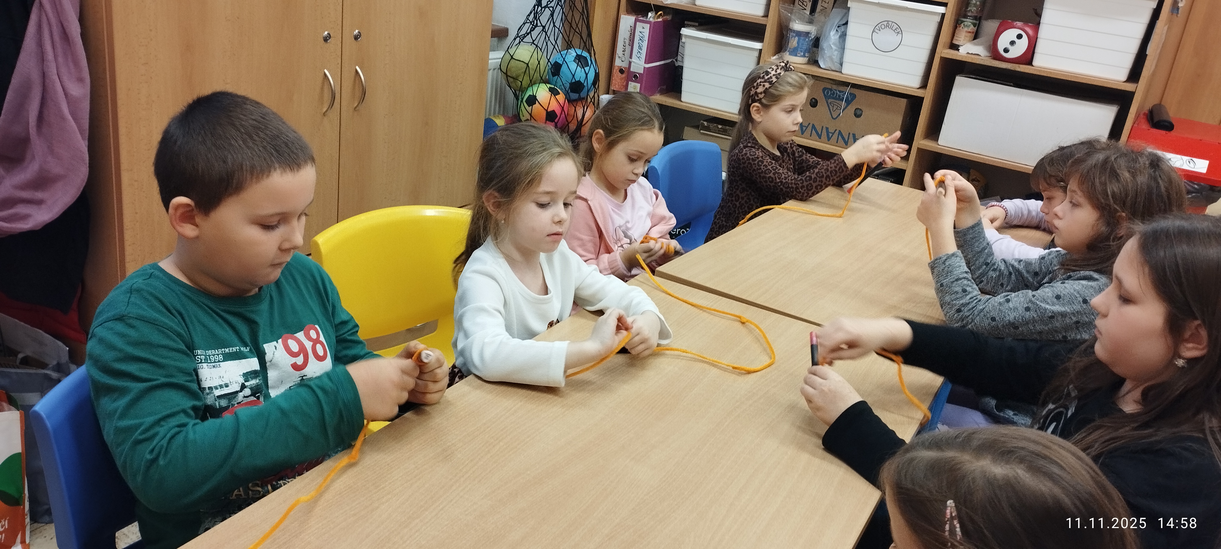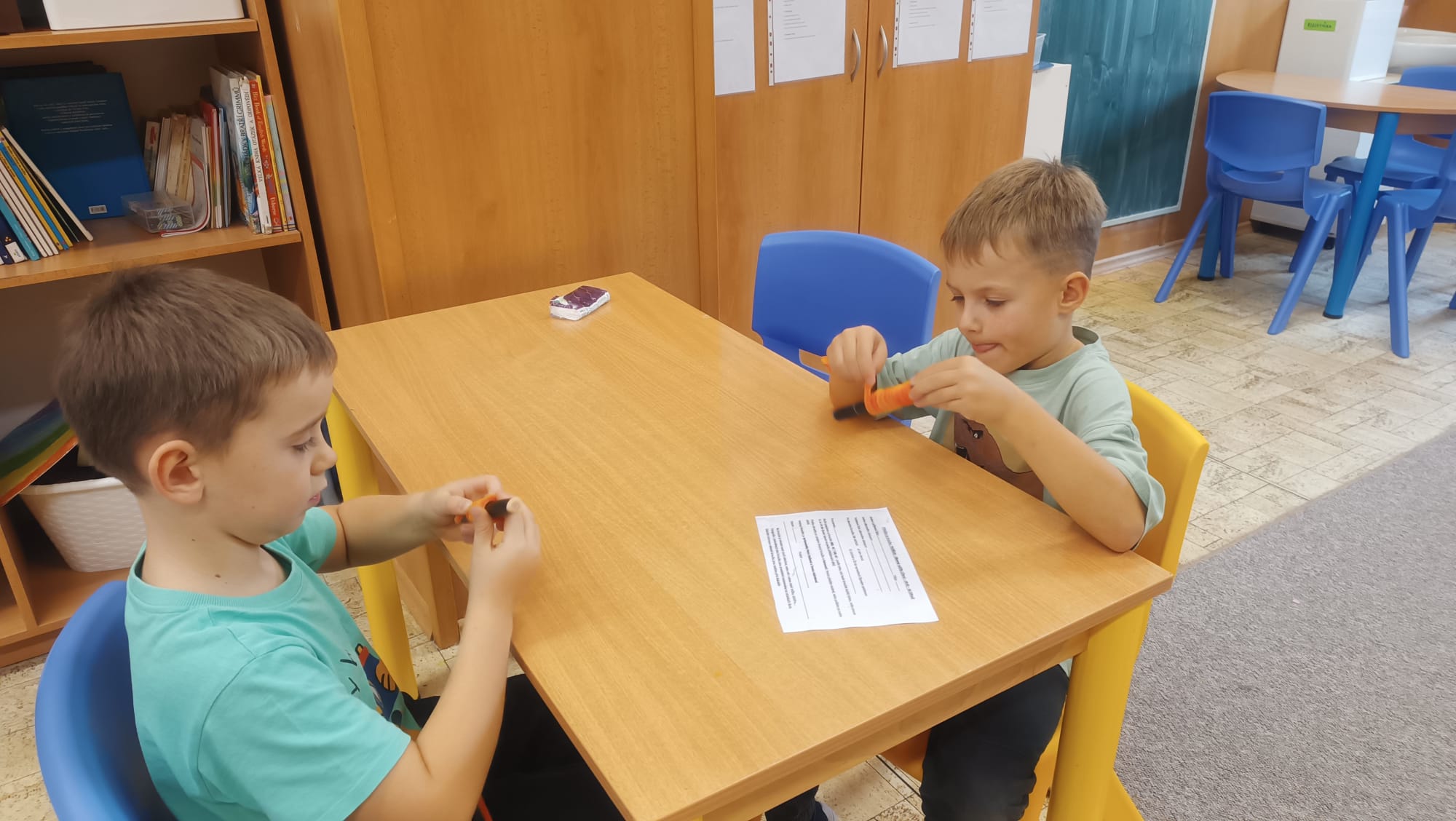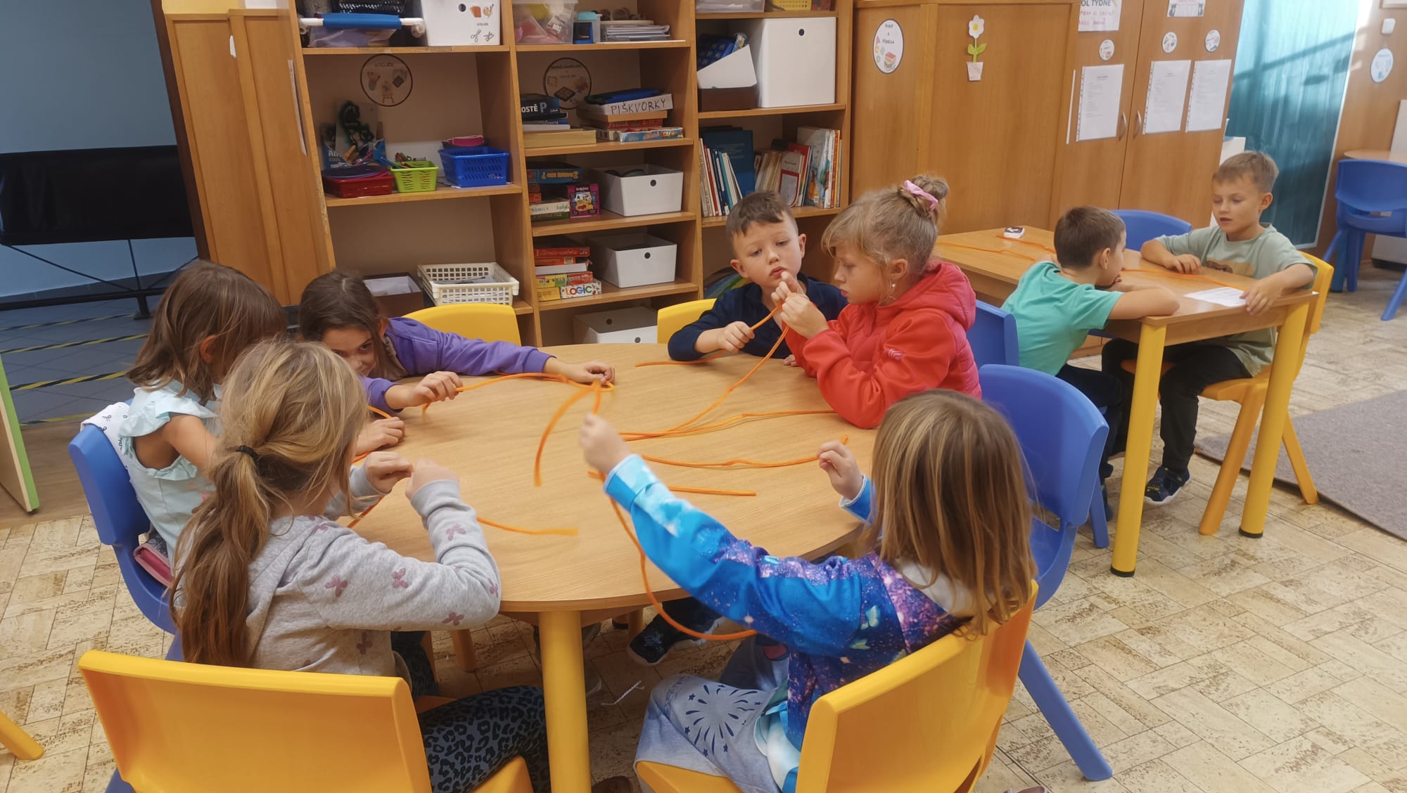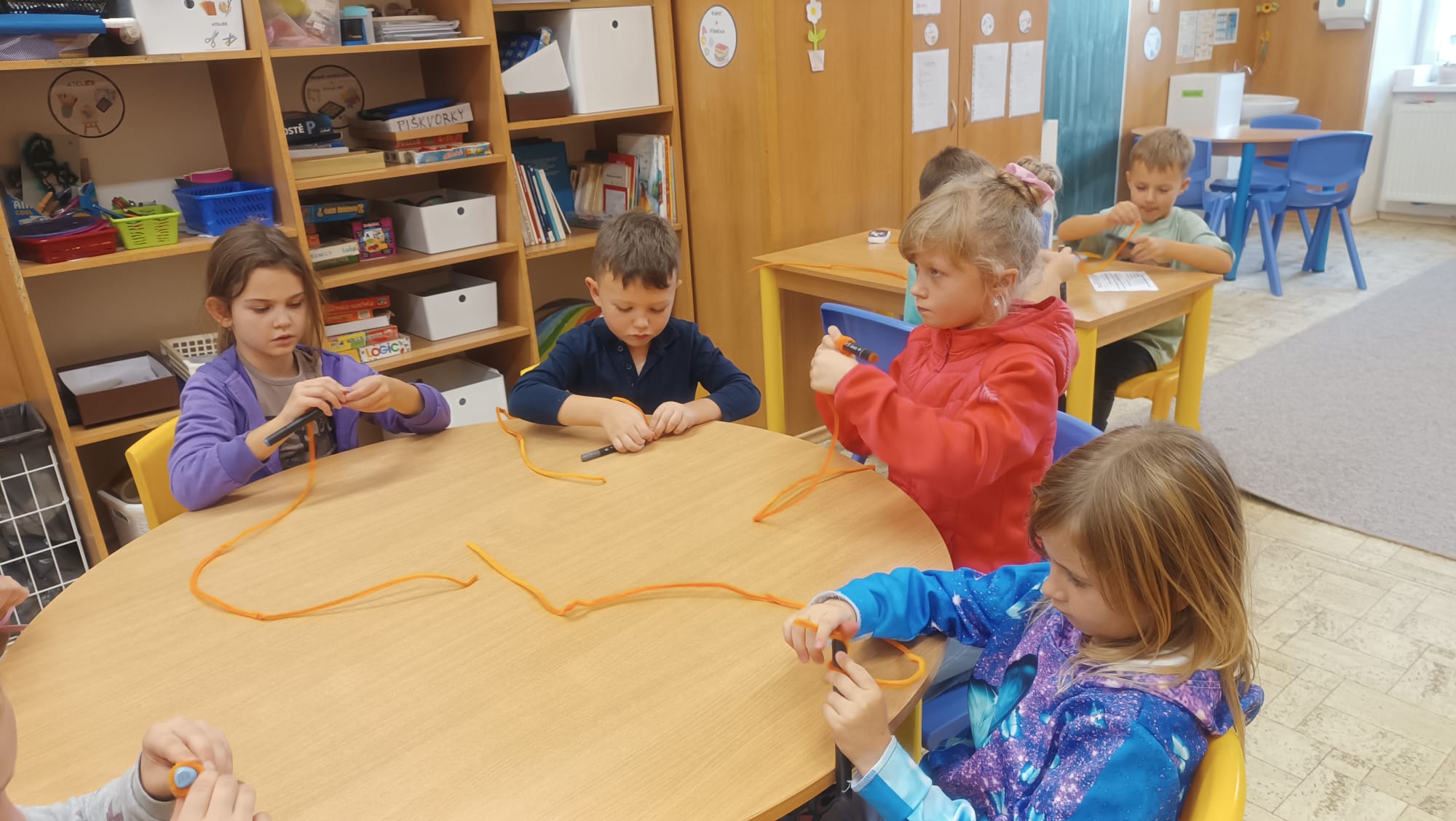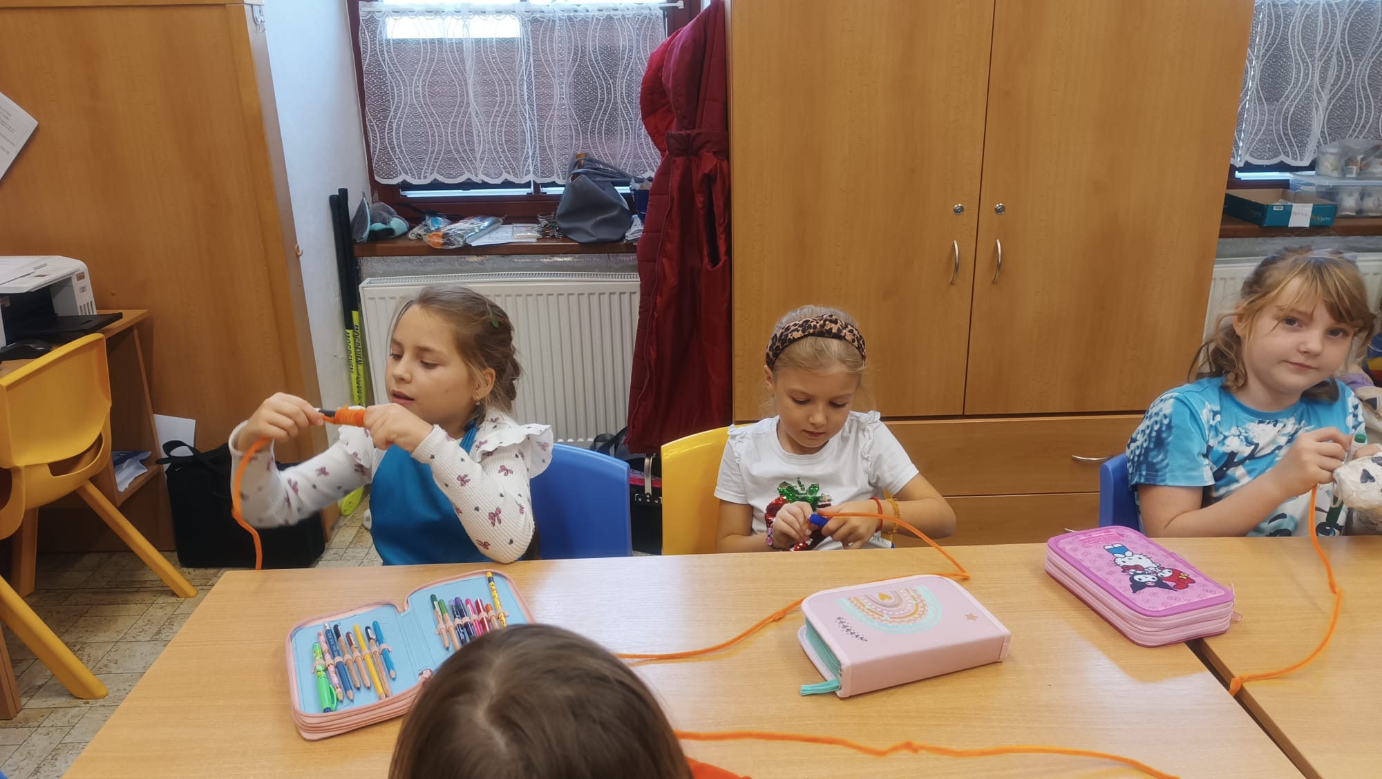Tentokrát jsme si práci rozdělili do dvou skupin. Nejprve děti pod vedením paní vychovatelky vyráběly dýni z chlupatého drátku. Poté si vzala slovo Ema, která nám chodí pomáhat jako bývalá účastnice kroužku. Společně s ní si děti vytvořily papírového netopýra s pohyblivými křídly. Protože nám na konci kroužku ještě zbyla chvilka, užili jsme si i zábavu pomocí her.