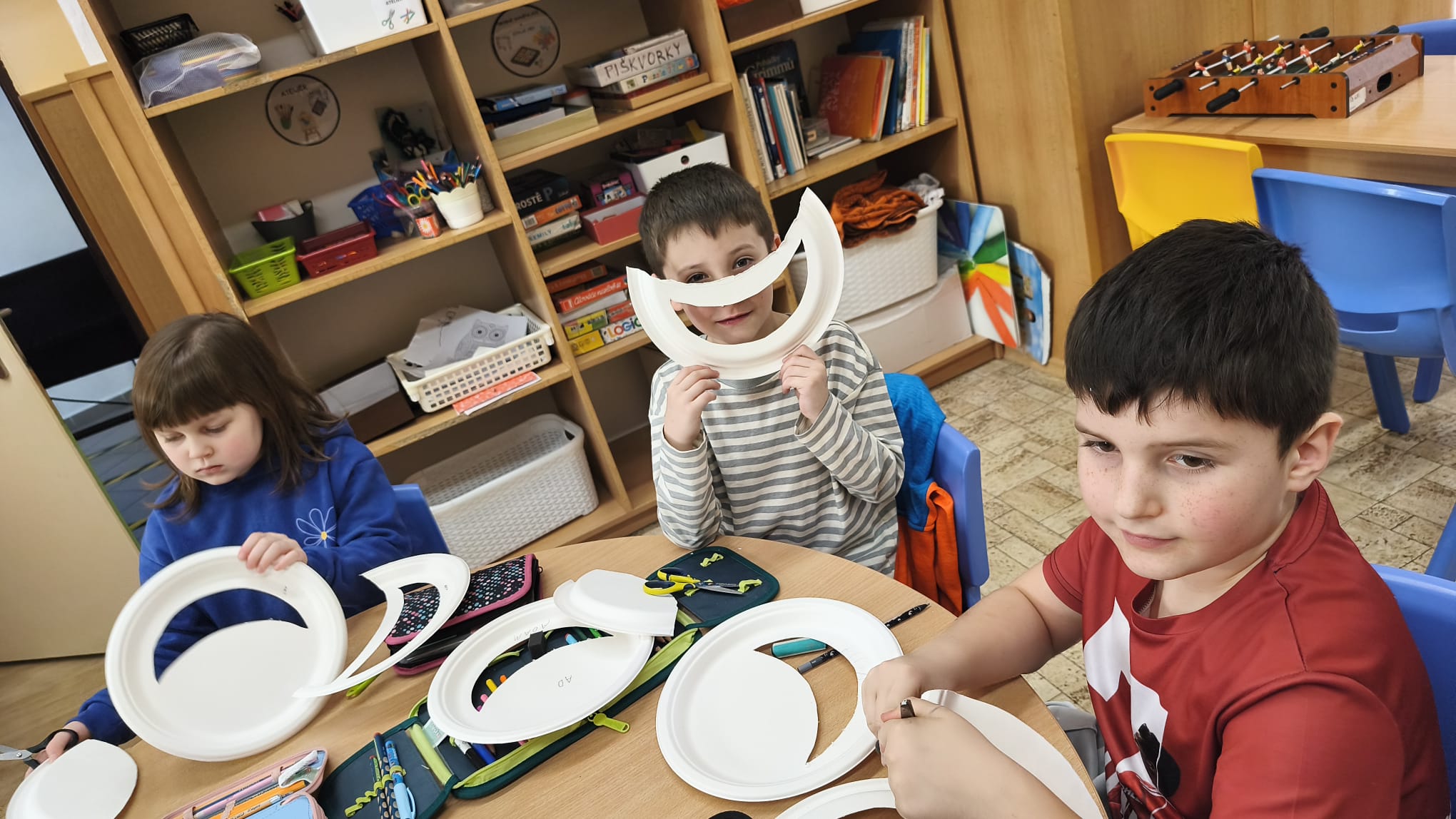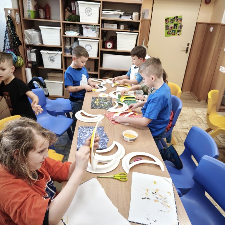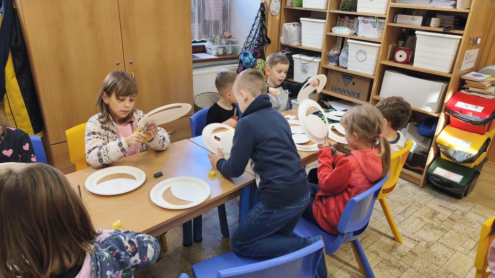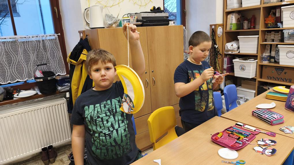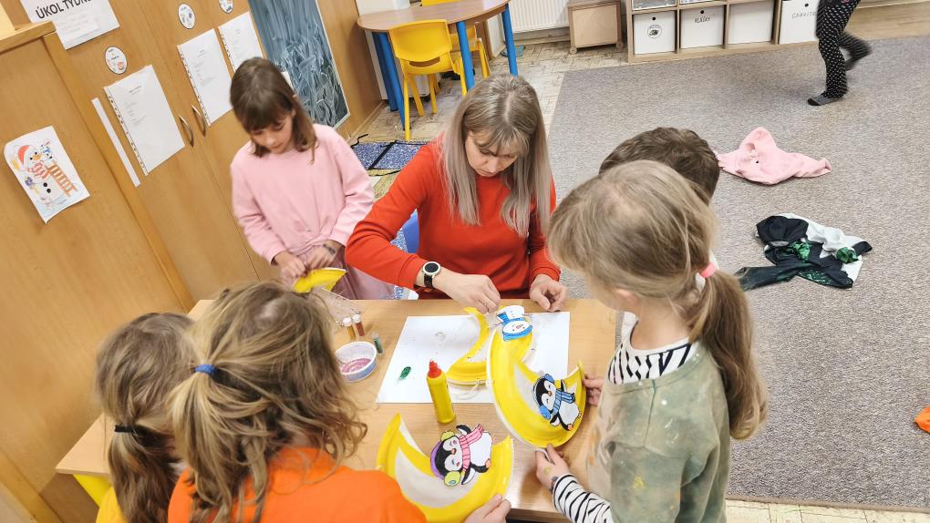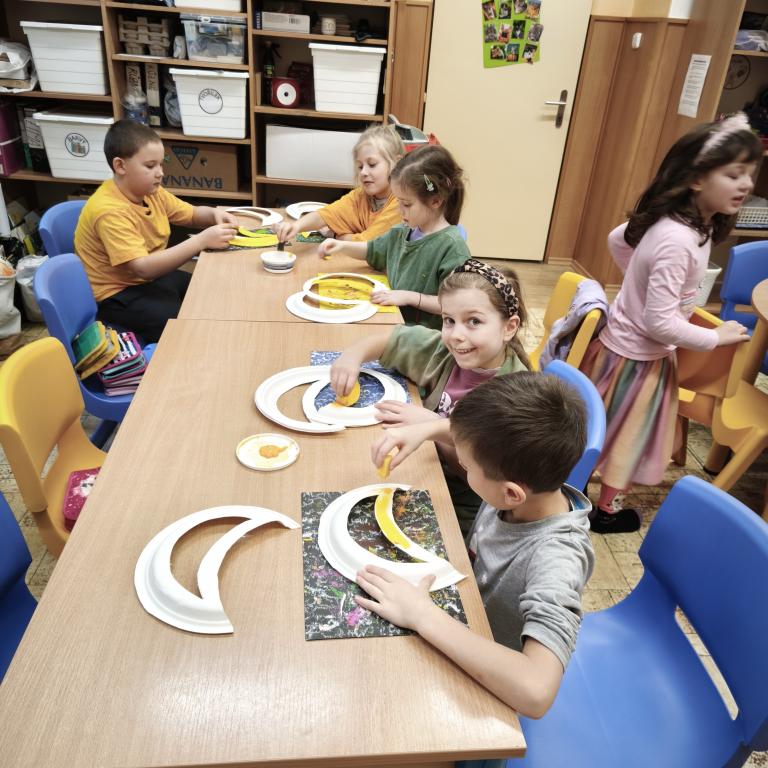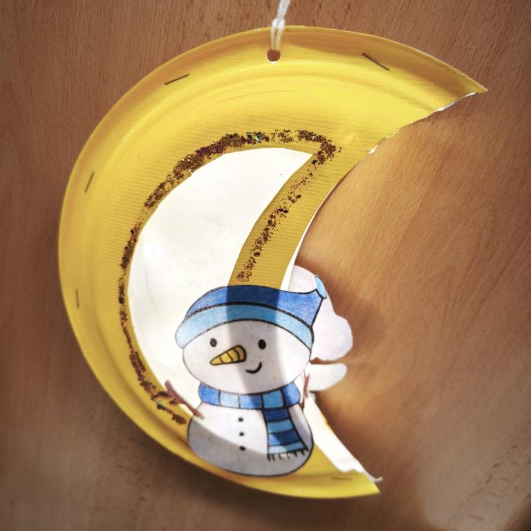A právě měsíc se stal inspirací pro naši další tvořivou činnost na kroužku. Společně jsme si vyrobili originální lampičky ve tvaru měsíce, které jsme ozdobili zimními motivy. A protože správná lampička se musí trochu třpytit, třpytky byly samozřejmě povinnou součástí.