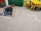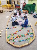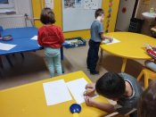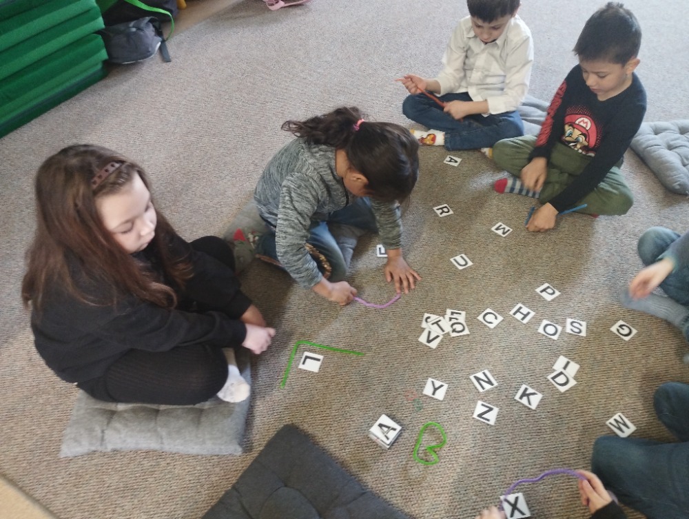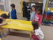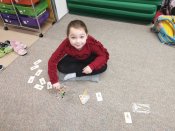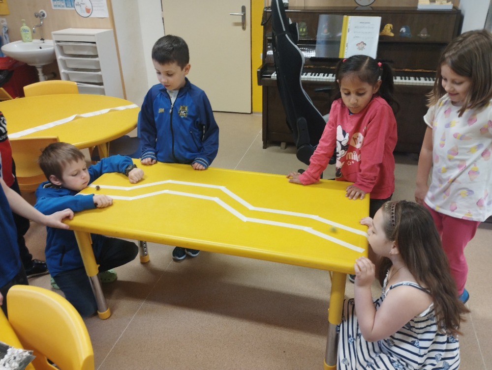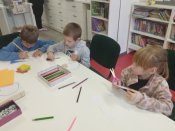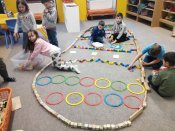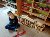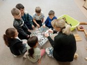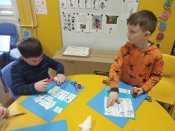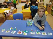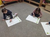 Blíží se nám prázdniny a našimi posledními tématy se stávají "číslice a písmena". Dolaďujeme poslední přípravu na první třídu, takže zkoušíme napsat správně některé číslice, pojmenovat počáteční písmenko na obrázku, počítáme hračky, vyrábíme číslice z papíru a stavíme z kostek. Při vycházce jsme si tentokrát místo sportování vzali destičku a opisovali jsme čísla popisná na domech v blízkosti školy. Využili jsme jeden den většího tepla a nasvačili jsme se venku. Vyrobili jsme si tablo a donesli jsme si ho vystavit do masny na náměstí, poněvadž jsme to měli cestou na pohádku v Městské knihovně, kde jsme byli s prvňáčky, kteří pak ještě pokračovali s pasováním na čtenáře.