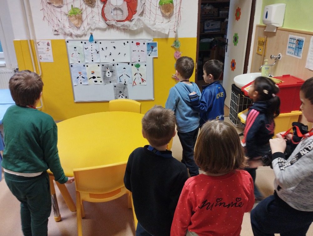 V přípravné třídě jsme byli moc rádi, že nám po prvních vánočních prázdninách napadl sníh a my jsme ho dostatečně využili k hrátkám a stavění sněhuláků. Ve třídě jsme si povídali o zimních sportech, malovali jsme nabarveným roztátým sněhem a vytvořili jsme si i svého sněhuláka. Ale nejdříve jsme si sami museli najít předměty, které bychom obkreslili jako kouli pro sněhuláka. Stříhání a lepení už nám jde na jedničku.