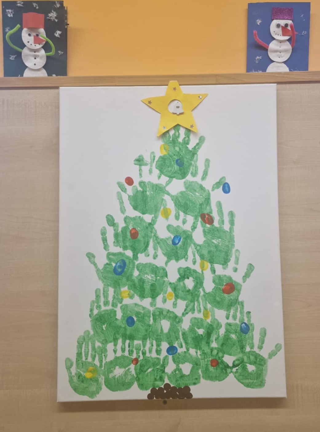 Součástí našeho vánočního období bylo i tvoření. Společně jsme vytvořili originální vánoční stromeček na plátně – vznikl z obtisků ruček všech dětí a stal se krásnou památkou na společnou práci celé třídy.