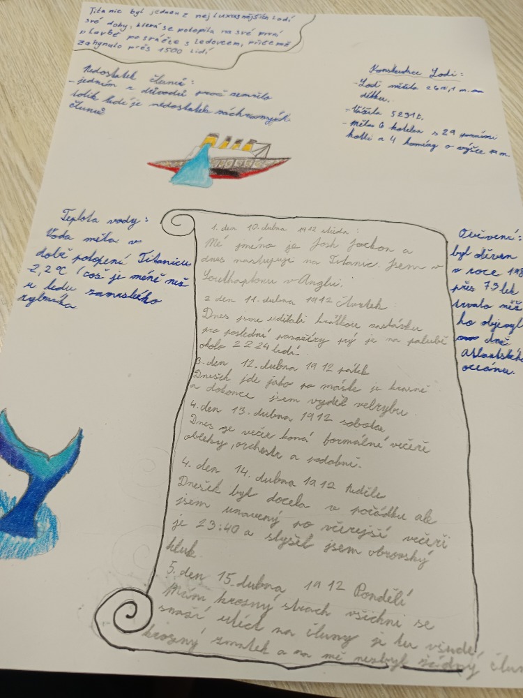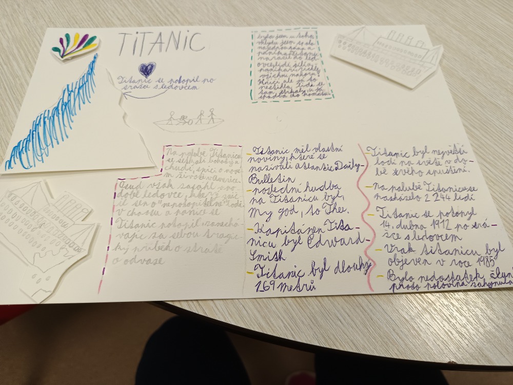 Pochvalu a ocenění si za svůj vlastnoručně vyřezávaný klíč symbolizující nalezený artefakt od osobní skřínky jednoho ze stevardů zaslouží Adam Chramosta. Stejně originálně skvělý je model vraku Titaniku od Tadeáše Bendy a model poničené kajuty od Štěpána Křivského. V rovině písemných mini projektů se dařilo Nicol Humlové a Sabině Sokolové. Z oblasti výtvarného pojetí vyzdvihuji kresby obličejů cestujících od Michaely Horákové a Titanic Petra Klapky. Za ryze dobrovolnou prezentaci o této nejluxusnější lodi své doby chválím Marca Crhu a Štěpána Daleckého... a všechny další z naší třídy za jejich obrázky a invenci.