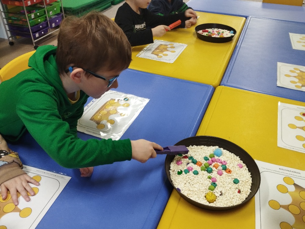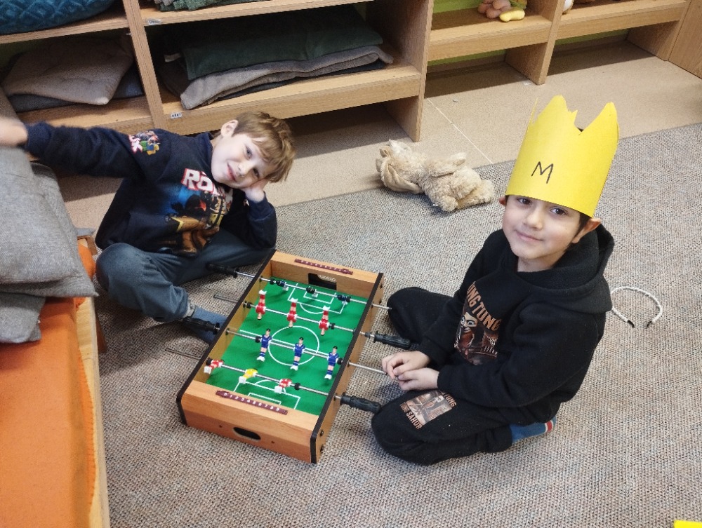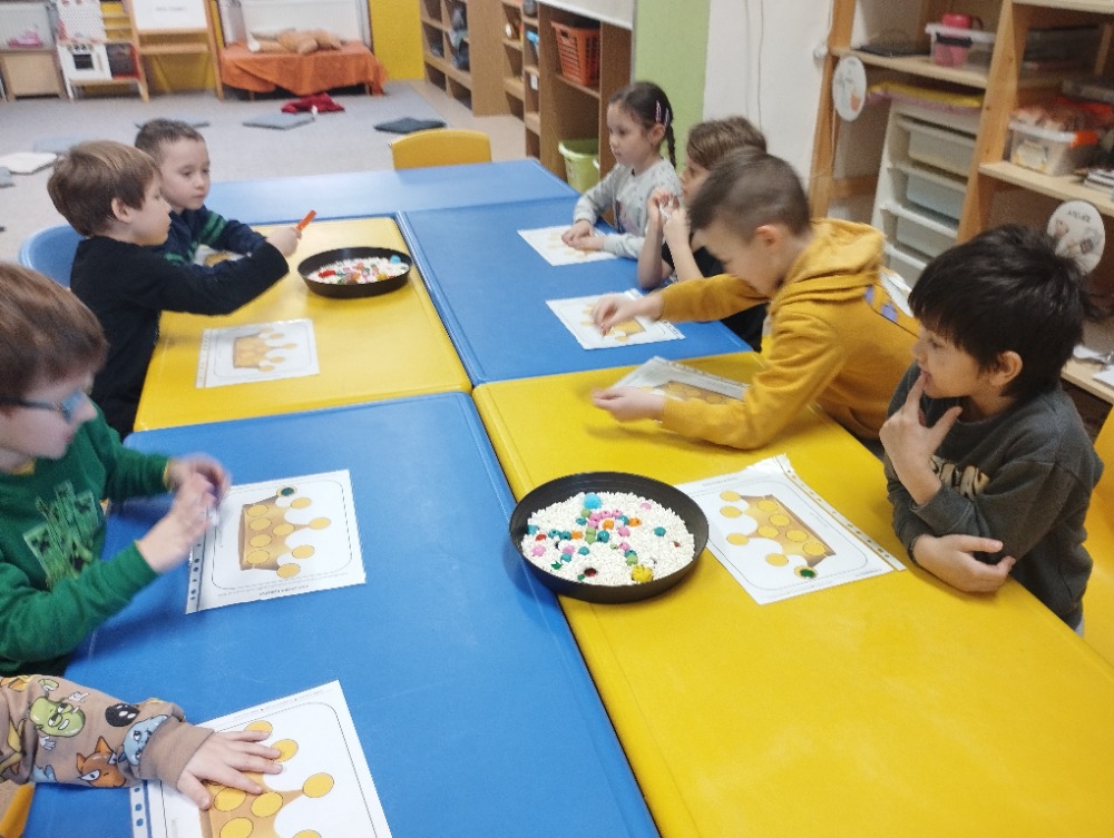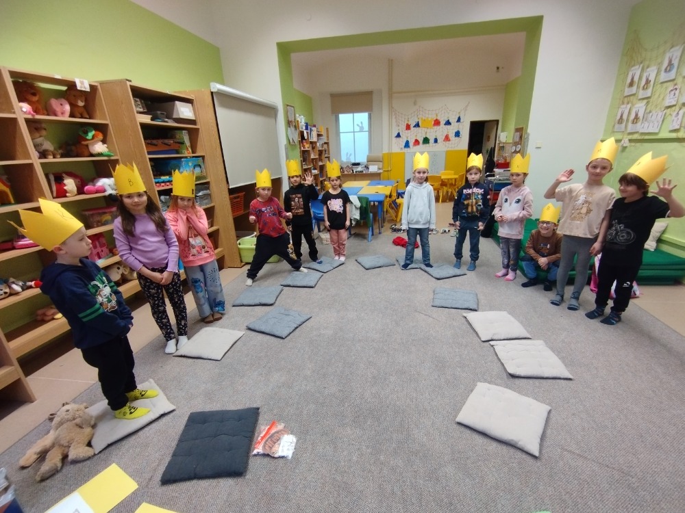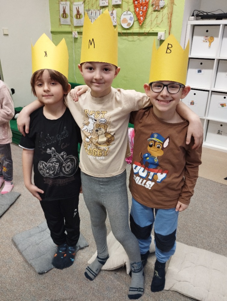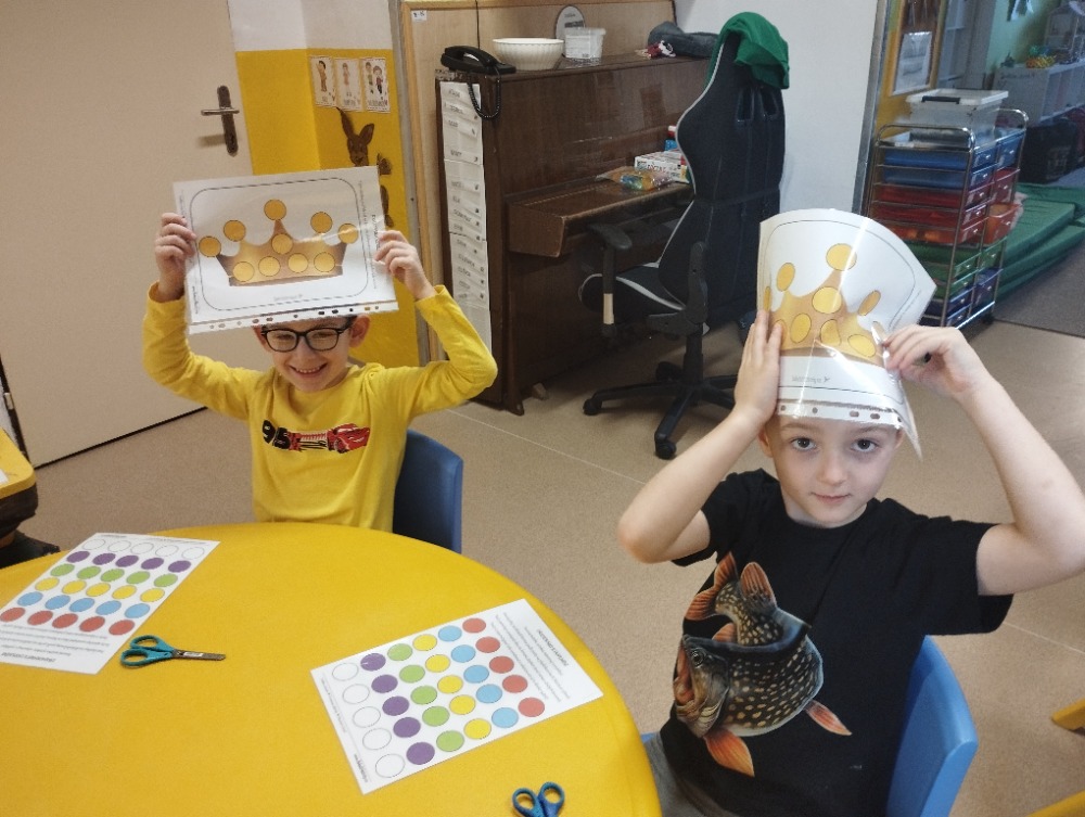 V přípravné třídě jsme se tento týden vydali po stopách Tří králů. Společně jsme si povídali o jejich cestě, symbolech a tradicích, které k tomuto období patří. Děti si s velkou chutí vyráběly královské koruny. Zdobily koruny diamanty, ty ale nebylo snadné získat – byly schované v burizonech a děti je musely pomocí magnetů opatrně vytáhnout. Tato aktivita rozvíjela jemnou motoriku, soustředění i trpělivost. Obtahovali jsme krále jedním tahem a jednoho z králů jsme si namalovali. Nechyběla ani hudba – naučili jsme se část písně „My tři králové“, kterou si děti s radostí zazpívaly a doprovodily pohybem.