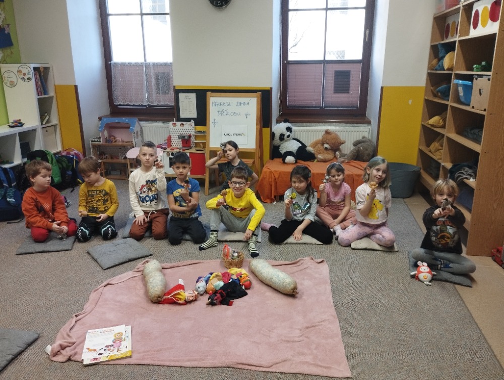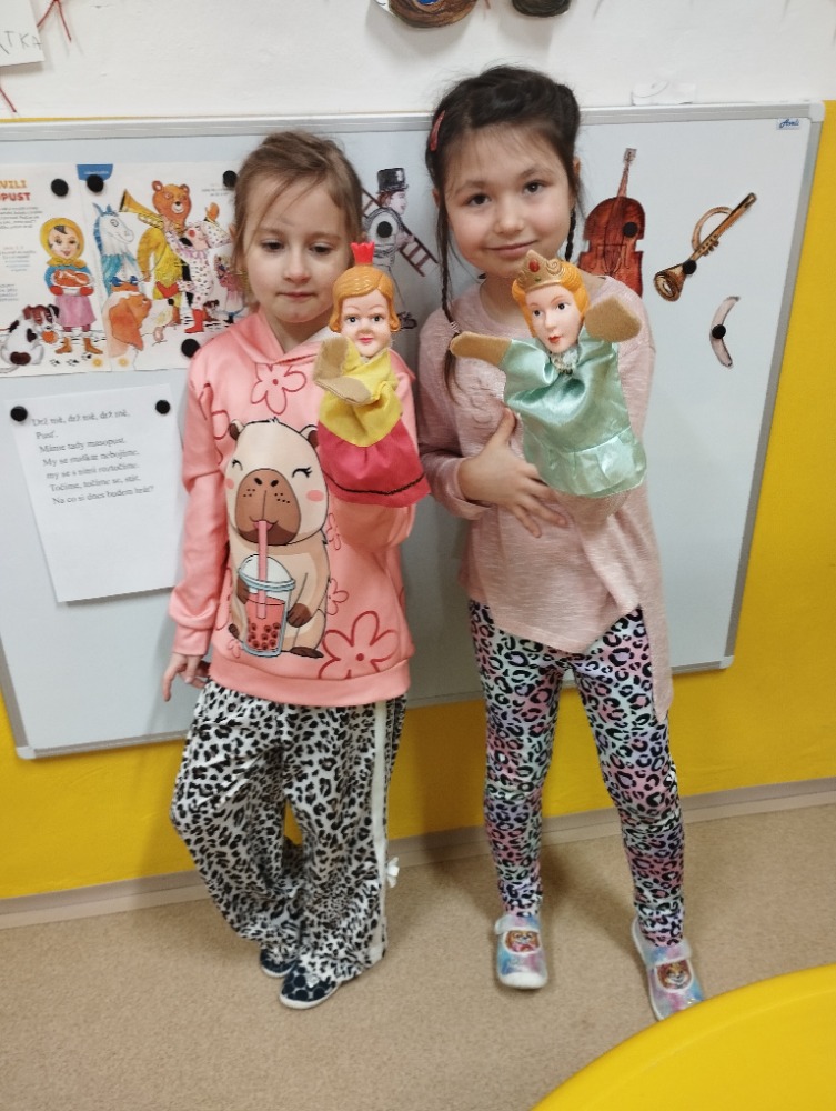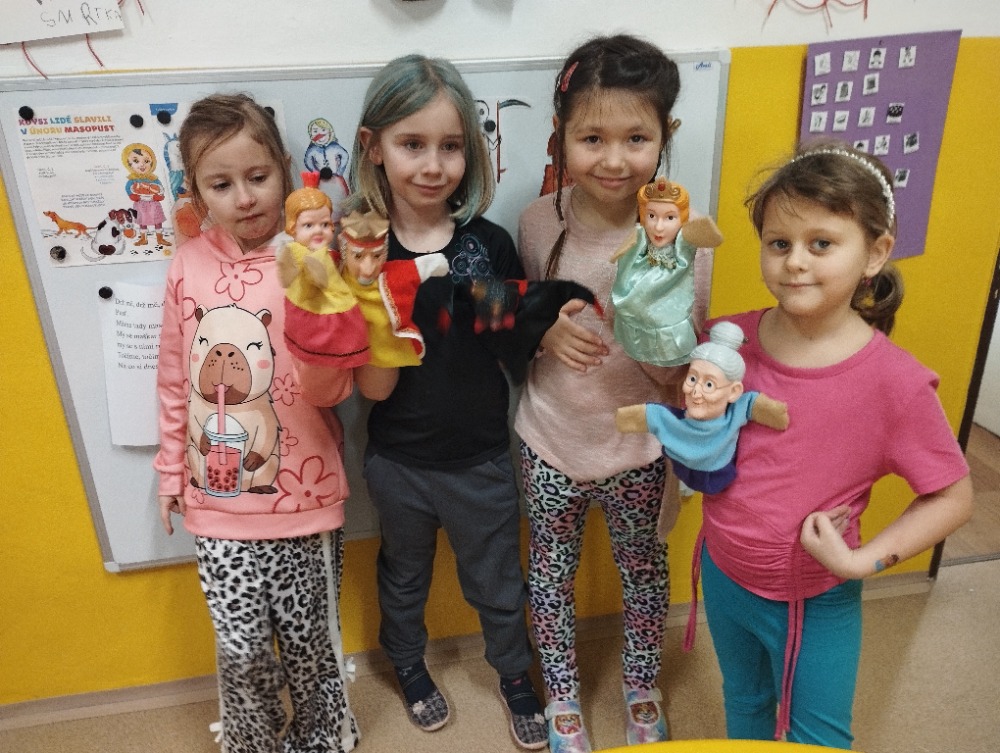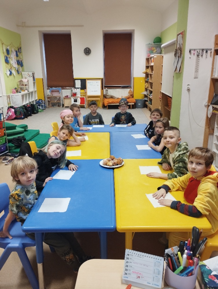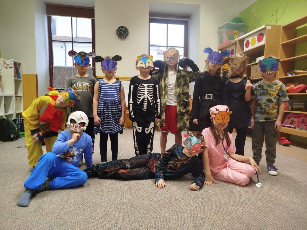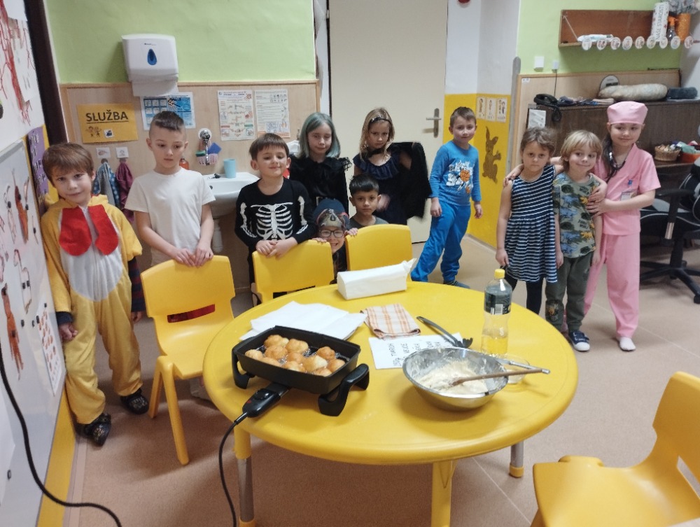 Masopust je čas veselí, masek a dobrého jídla – a přesně v tomto duchu se nesl i masopustní týden v naší přípravné třídě. S dětmi jsme si povídali o tom, co masopust znamená, jak se slavil dříve a jaké tradiční masky k němu patřily. Děti se dozvěděly, proč se lidé převlékali, jakou roli měly jednotlivé masky a proč byl masopust vždy plný smíchu a zábavy. Nezůstali jsme ale jen u povídání. S maňásky jsme si zahráli divadlo. Společně jsme se vydali nakoupit suroviny na smažení koblížků a už samotná příprava byla pro děti velkým zážitkem. V pátek pak přišla ta nejsladší část – smažení koblížků. Vůně se linula celou třídou a děti si pochutnaly na vlastnoručně připravené masopustní dobrotě. Vyvrcholením celého týdne byl masopustní karneval. Každé dítě přišlo v masce a třída se na chvíli proměnila v kouzelné místo plné pohádkových bytostí, zvířat i hrdinů. Kromě toho jsme si vytvořili vlastní škrabošky na obličej a masopustní masky jsme také kreslili, aby si děti mohly vyzkoušet, jaké to je být návrhářem masek. Masopustní týden jsme si všichni moc užili. A jedno je jisté – masopust držíme a nepustíme!