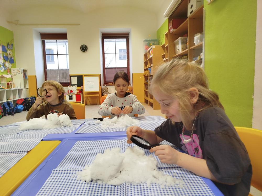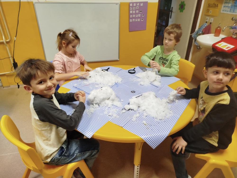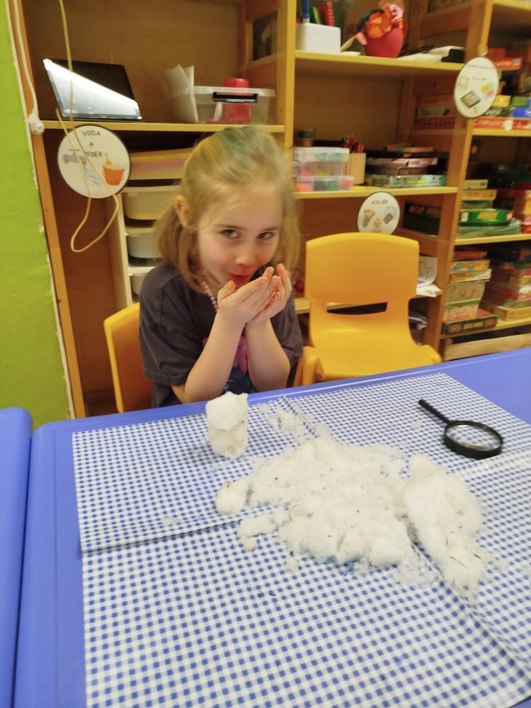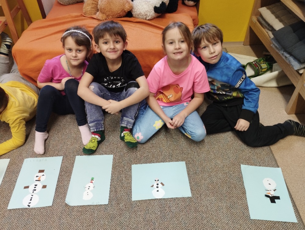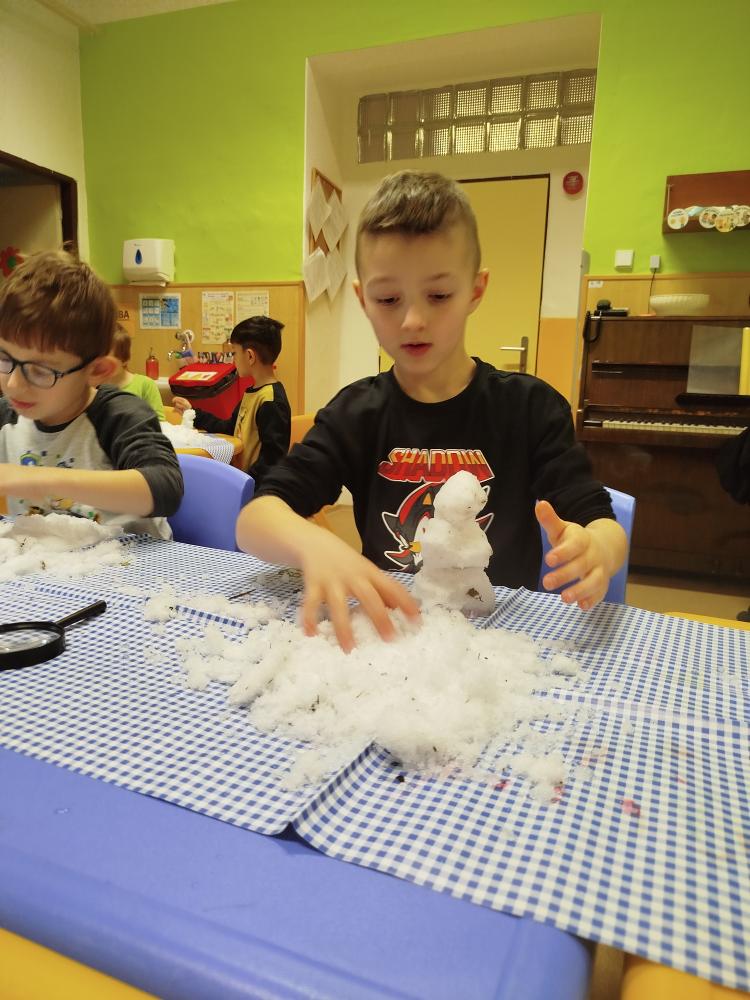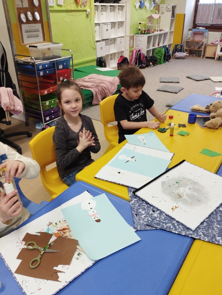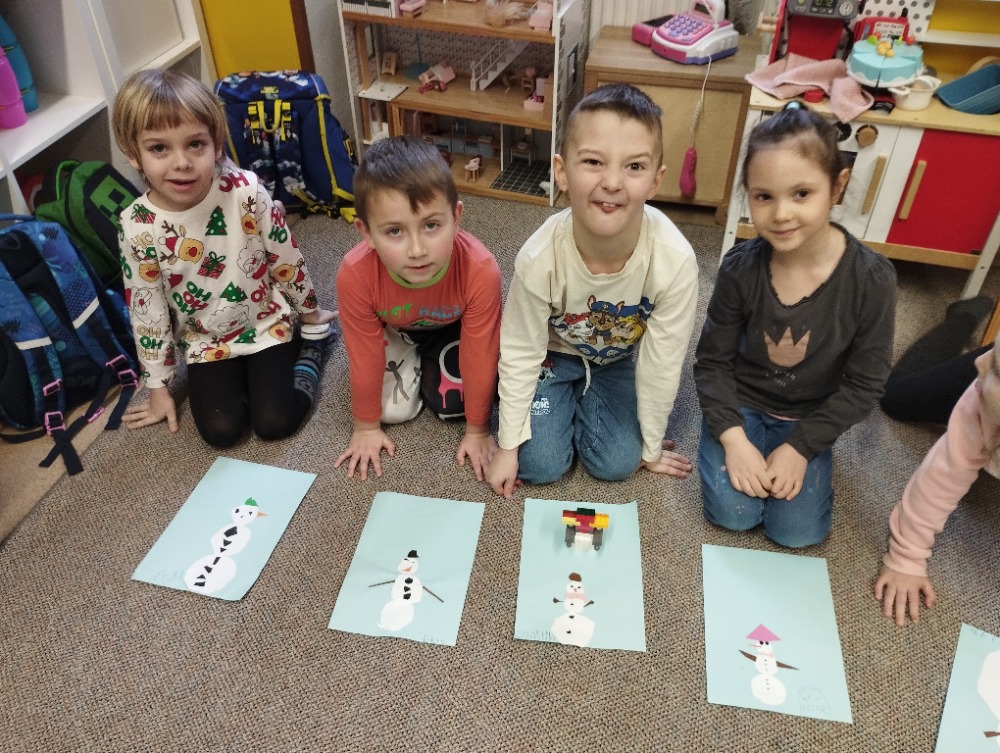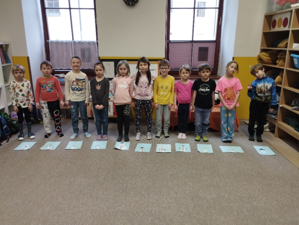 Hned na začátku jsme si povídali o tom, jak se příroda v zimě mění a jak vypadá zimní krajina. Největším zážitkem bylo zkoumání skutečného sněhu. Děti si ho prohlížely lupou, pozorovaly jeho strukturu a sledovaly, jak nám pod rukama pomalu taje. Vyzkoušeli jsme si také, co se stane, když sníh obarvíme barvami. Společně jsme provedli i malý pokus – nechali jsme ve třídě roztát velkou nádobu plnou sněhu a pozorovali jsme, kolik vody z něj vznikne. Zimu jsme si přenesli i do tělocvičny. Cvičili jsme s obručemi, ze kterých jsme skládali „tělo“ sněhuláka – malé, střední a velké kruhy. Procvičili jsme si tak nejen pohyb a spolupráci, ale i orientaci v prostoru a rozlišování velikostí. Ve třídě jsme pokračovali tvořením. Děti měly za úkol najít ve třídě tři kulaté předměty různých velikostí, které by mohly obkreslit. Díky tomu si vytvořily vlastního papírového sněhuláka, kterého následně vystřihly a dozdobily. Velkou radost nám udělaly také papírové koule, které jsme vyráběli z papíru a burizonů – práce byla sice trochu „lepivá“, ale o to zábavnější. Celý týden byl plný objevování, tvoření a radosti z poznávání.