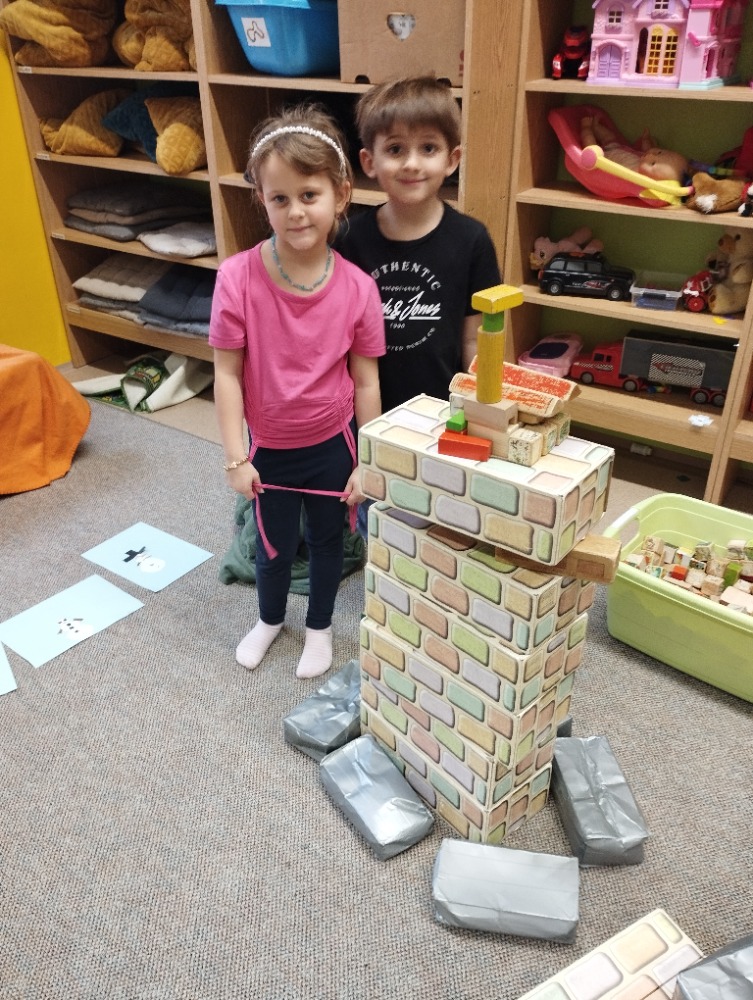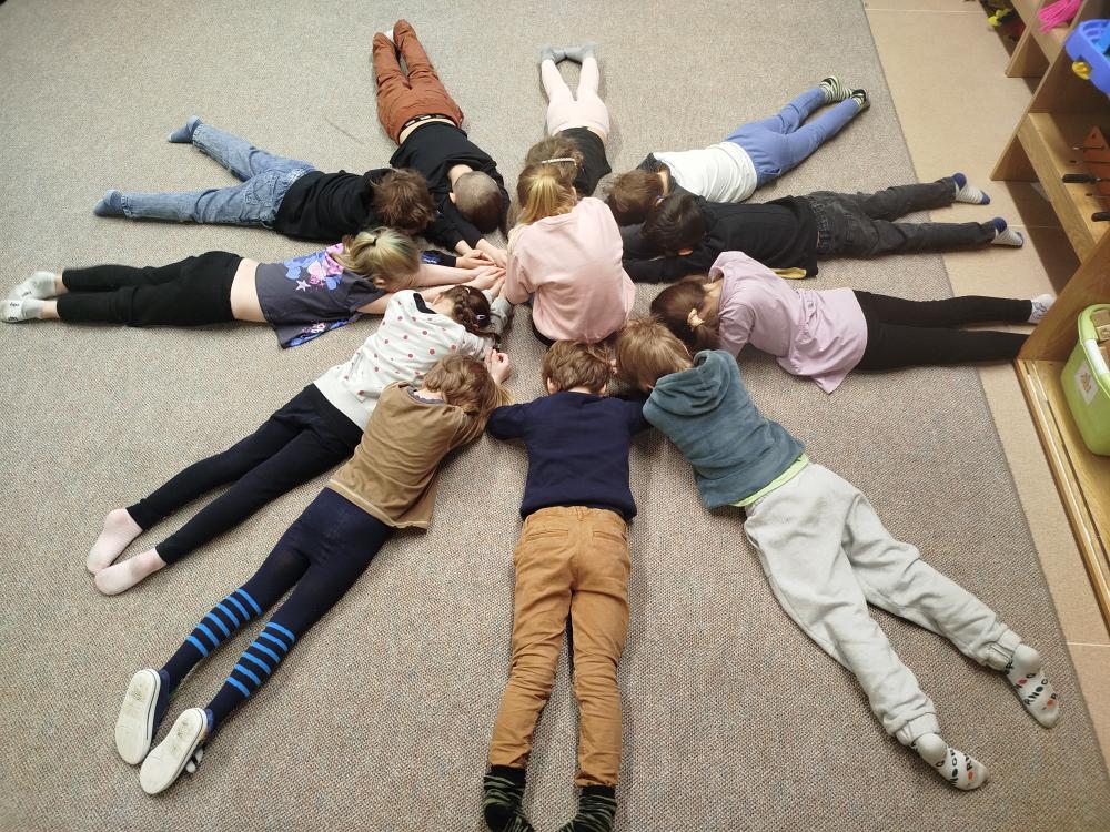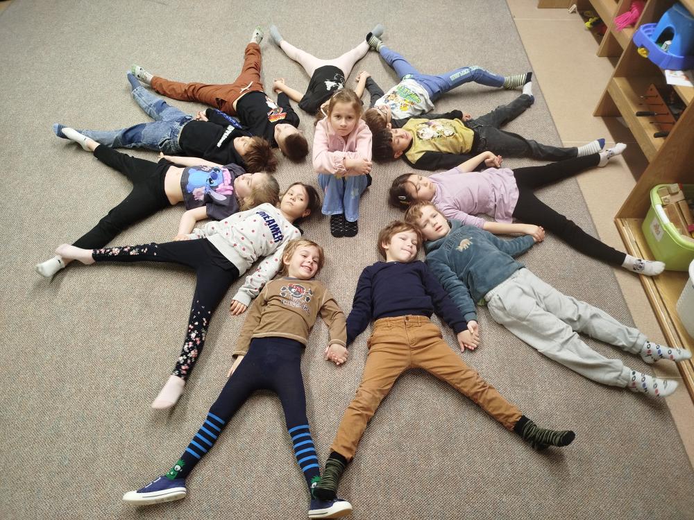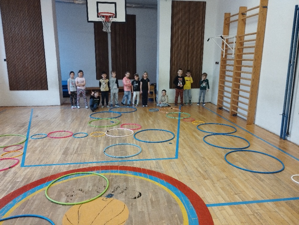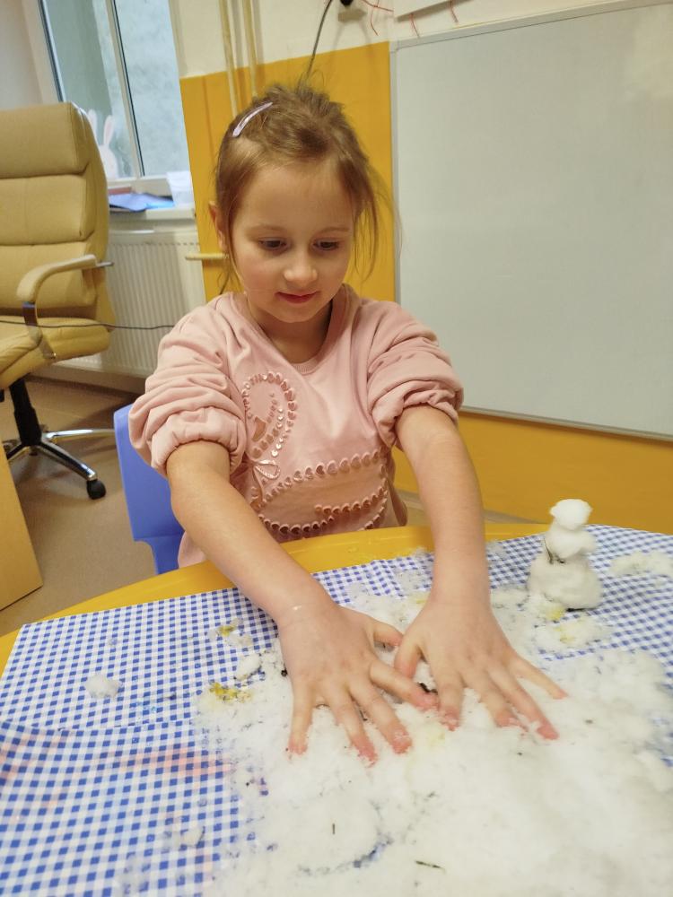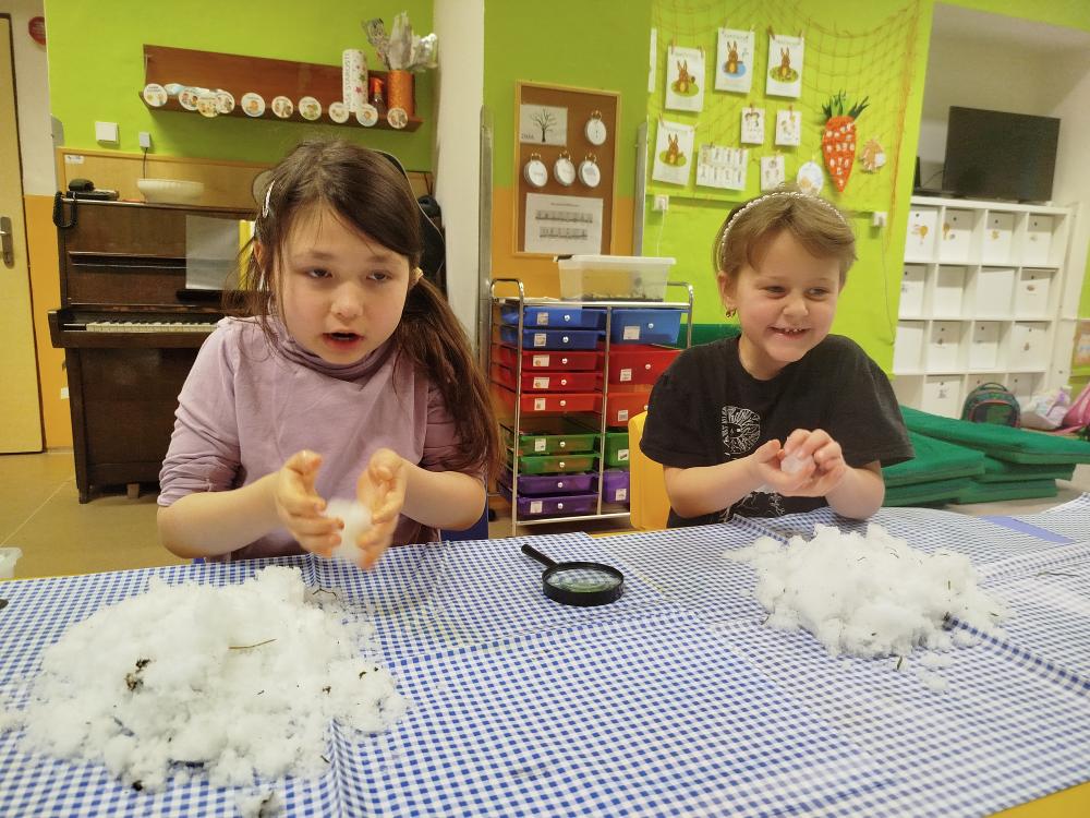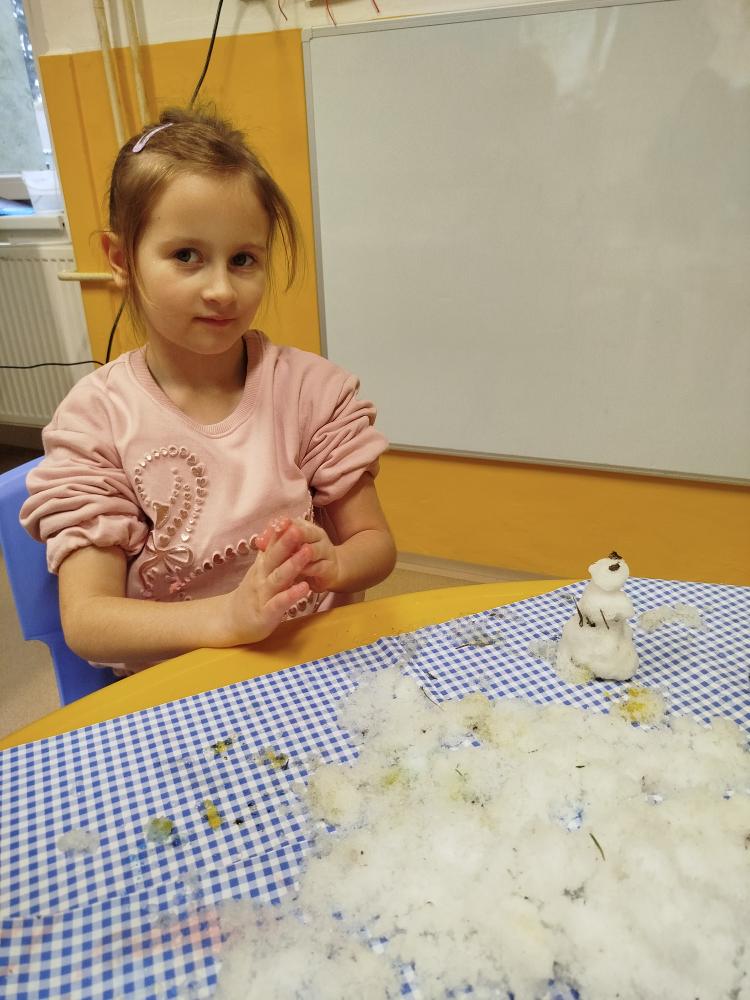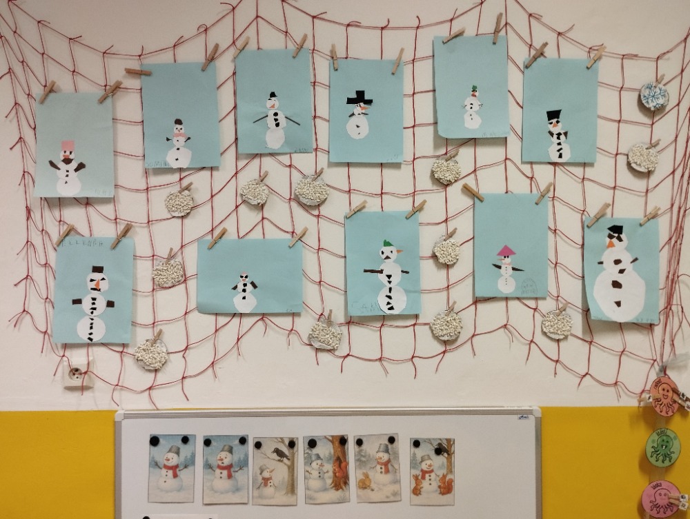 Hned na začátku jsme si povídali o tom, jak se příroda v zimě mění a jak vypadá zimní krajina. Největším zážitkem bylo zkoumání skutečného sněhu. Děti si ho prohlížely lupou, pozorovaly jeho strukturu a sledovaly, jak nám pod rukama pomalu taje. Vyzkoušeli jsme si také, co se stane, když sníh obarvíme barvami. Společně jsme provedli i malý pokus – nechali jsme ve třídě roztát velkou nádobu plnou sněhu a pozorovali jsme, kolik vody z něj vznikne. Zimu jsme si přenesli i do tělocvičny. Cvičili jsme s obručemi, ze kterých jsme skládali „tělo“ sněhuláka – malé, střední a velké kruhy. Procvičili jsme si tak nejen pohyb a spolupráci, ale i orientaci v prostoru a rozlišování velikostí. Ve třídě jsme pokračovali tvořením. Děti měly za úkol najít ve třídě tři kulaté předměty různých velikostí, které by mohly obkreslit. Díky tomu si vytvořily vlastního papírového sněhuláka, kterého následně vystřihly a dozdobily. Velkou radost nám udělaly také papírové koule, které jsme vyráběli z papíru a burizonů – práce byla sice trochu „lepivá“, ale o to zábavnější. Celý týden byl plný objevování, tvoření a radosti z poznávání.