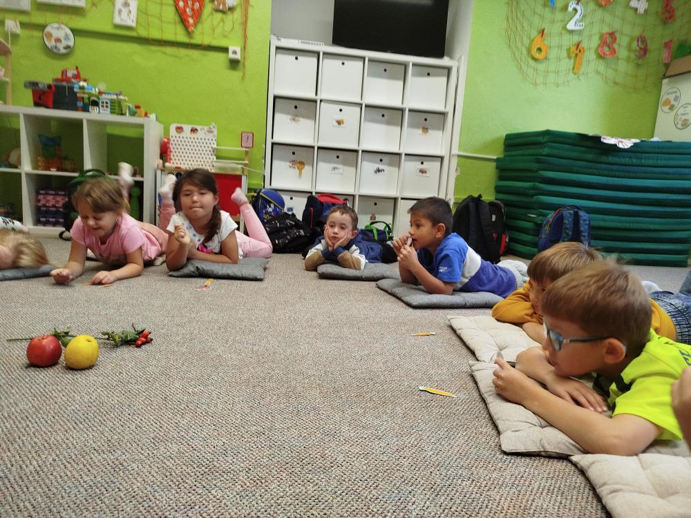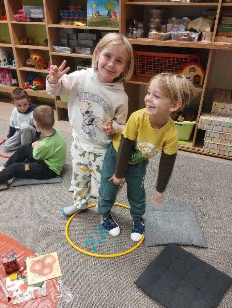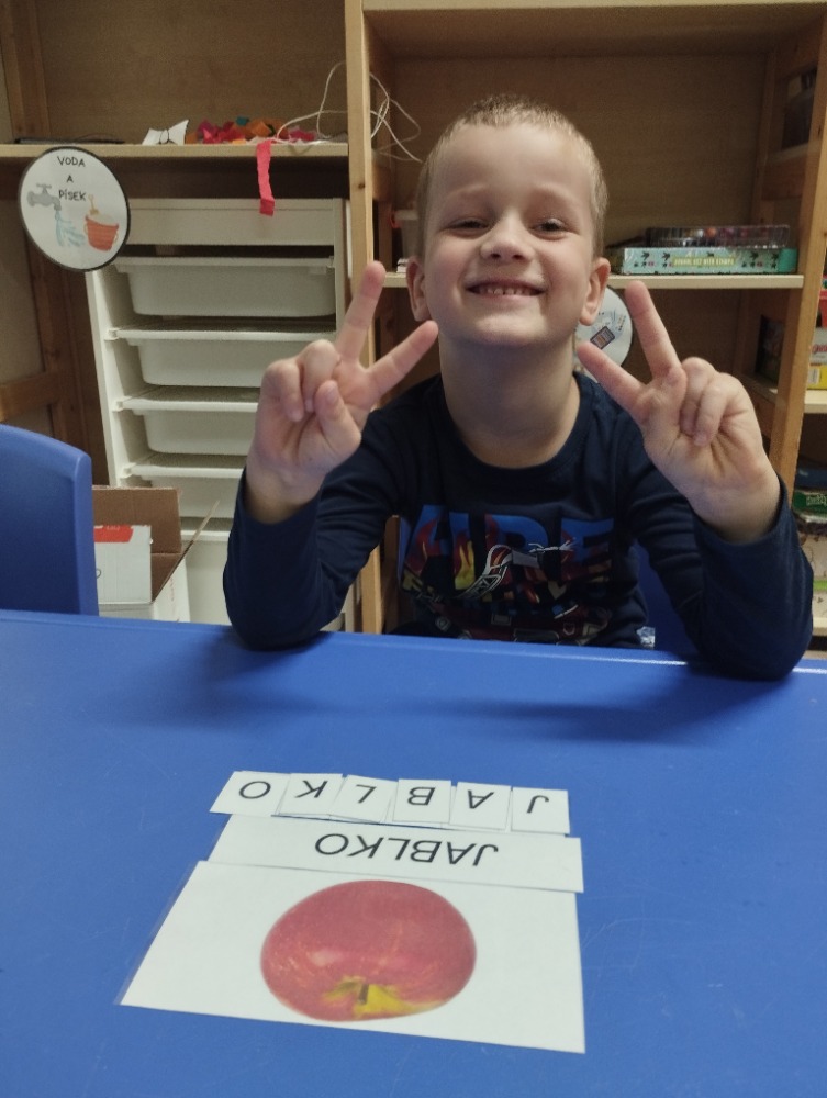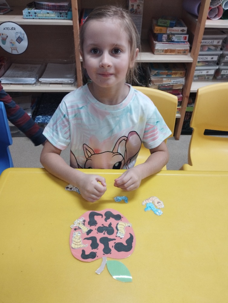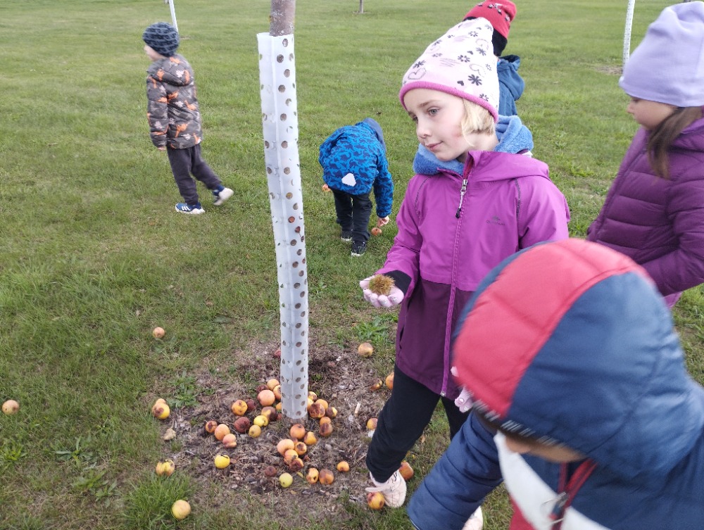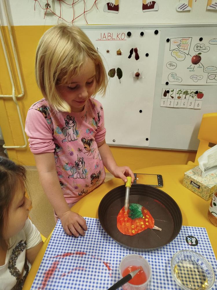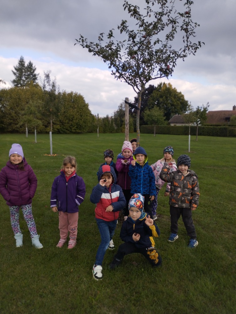 Minulý týden jsme s dětmi začali projektové vyučování "jablíčkobraní". Začali jsme tím, že si děti přinesly dvě jablíčka a ty jsme celý týden zkoumali. Učili jsme se pojmenovávat jeho části, ochutnávali jsme ho. A nyní jsou všechny naše činnosti zaměřené na jablíčka. V tělocvičně jsme cvičili s overbally jako s jablíčky, po žebřinách jsme si vyšplhali pro jablíčko. Z kaštanů, které jsme si sami nasbírali, jsme vytvořili jabloň na koberci. Bylo milé, že jsme se mohli podívat i k jedné babičce na zahradu, kde jsme měli jabloň přímo před sebou. Nezapomněli jsme ani na zámeckou zahradu, kde jsme pozorovali menší jablůňky. Činnosti ve třídě byly zaměřené na počítání s jablíčky, naučili jsme se písničku Koulelo se koulelo, nakreslili jsme si jablíčko temperovými barvami se sodou, jako experiment jsme na něj nakapali ocet a jablíčko nám šumělo. Červík nám prolezl jablíčkem - pomocí provázku, jsme mu udělali cestičky. Byli jsme rádi, že jsme mohli být i na interaktivní tabuli, kde jsme toho mnoho procvičili.