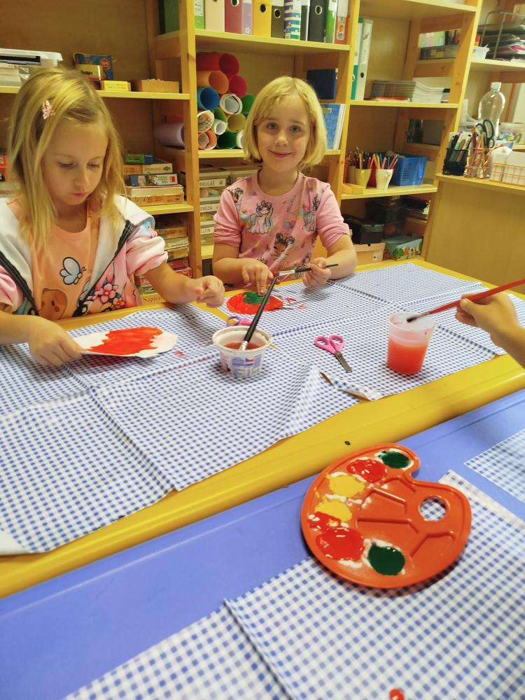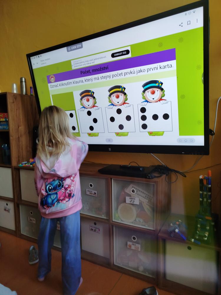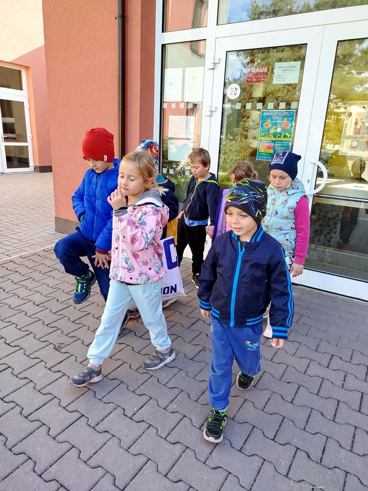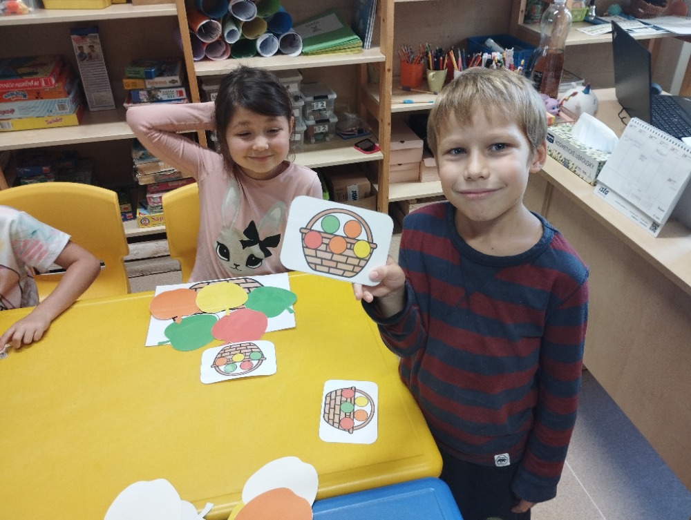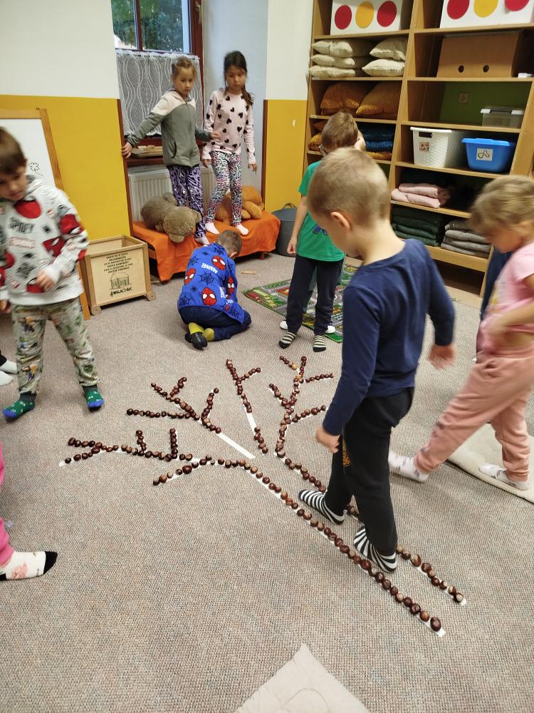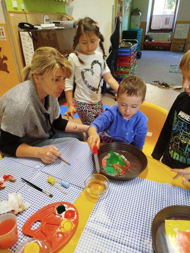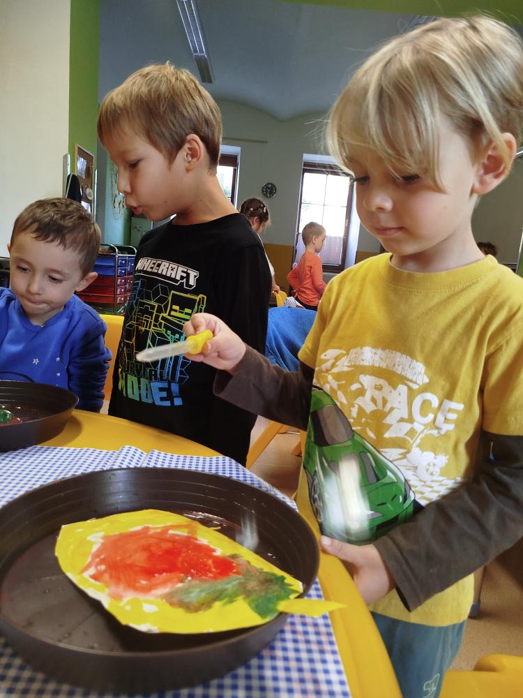 Minulý týden jsme s dětmi začali projektové vyučování "jablíčkobraní". Začali jsme tím, že si děti přinesly dvě jablíčka a ty jsme celý týden zkoumali. Učili jsme se pojmenovávat jeho části, ochutnávali jsme ho. A nyní jsou všechny naše činnosti zaměřené na jablíčka. V tělocvičně jsme cvičili s overbally jako s jablíčky, po žebřinách jsme si vyšplhali pro jablíčko. Z kaštanů, které jsme si sami nasbírali, jsme vytvořili jabloň na koberci. Bylo milé, že jsme se mohli podívat i k jedné babičce na zahradu, kde jsme měli jabloň přímo před sebou. Nezapomněli jsme ani na zámeckou zahradu, kde jsme pozorovali menší jablůňky. Činnosti ve třídě byly zaměřené na počítání s jablíčky, naučili jsme se písničku Koulelo se koulelo, nakreslili jsme si jablíčko temperovými barvami se sodou, jako experiment jsme na něj nakapali ocet a jablíčko nám šumělo. Červík nám prolezl jablíčkem - pomocí provázku, jsme mu udělali cestičky. Byli jsme rádi, že jsme mohli být i na interaktivní tabuli, kde jsme toho mnoho procvičili.