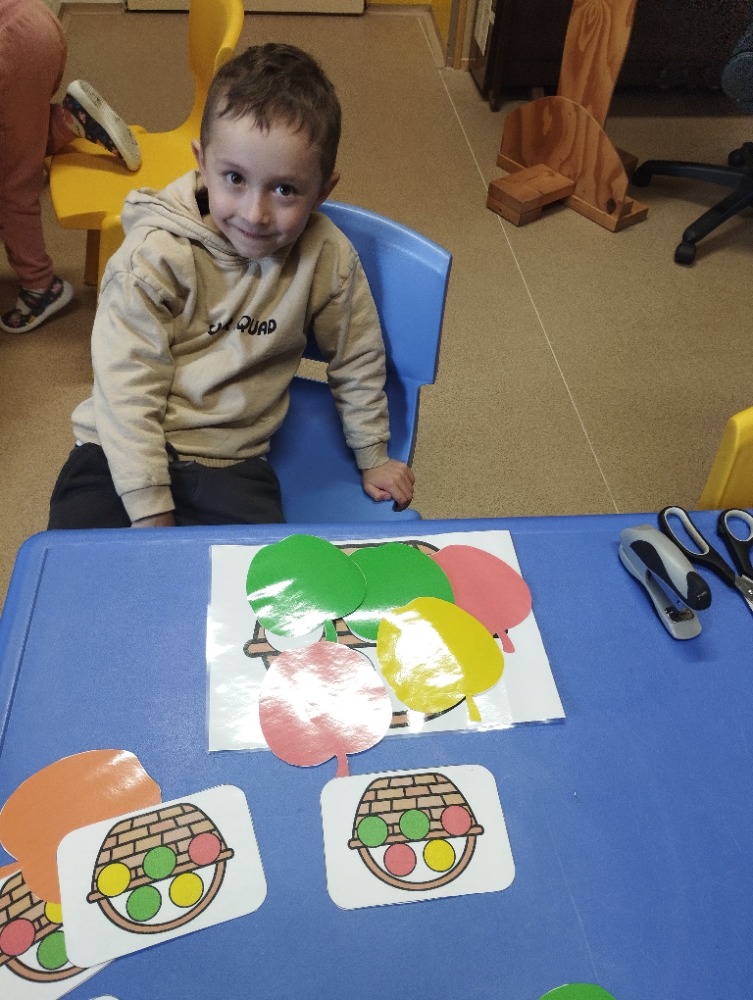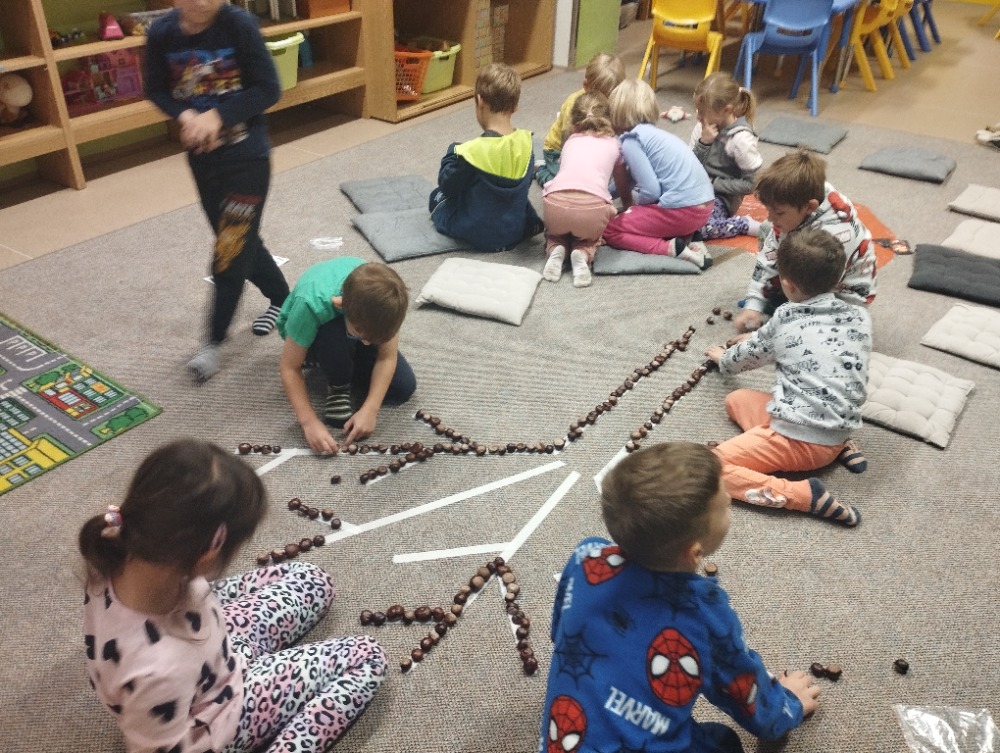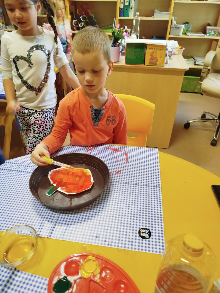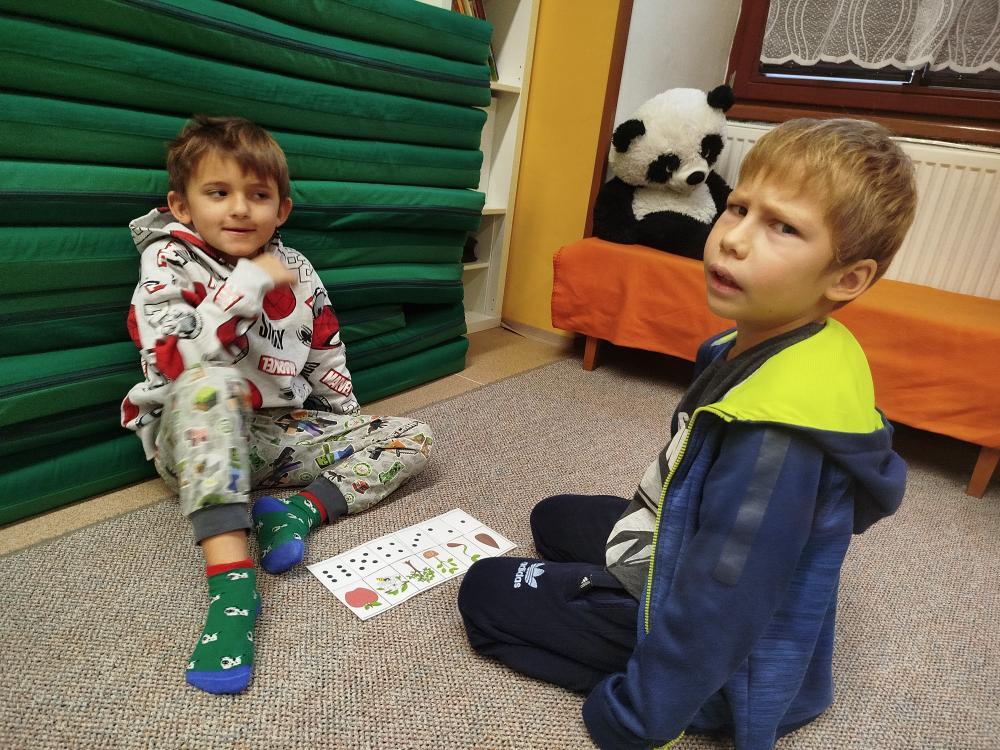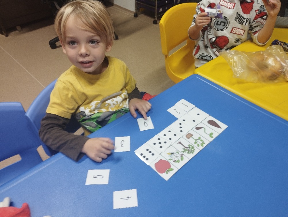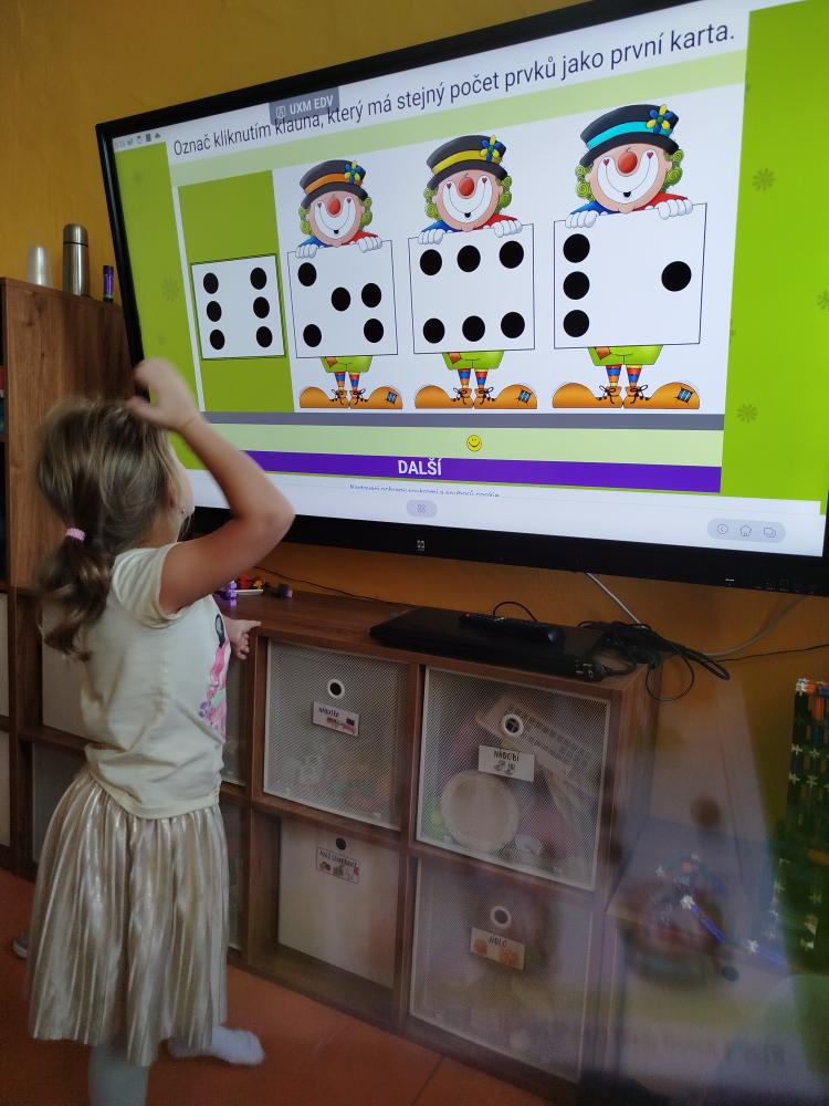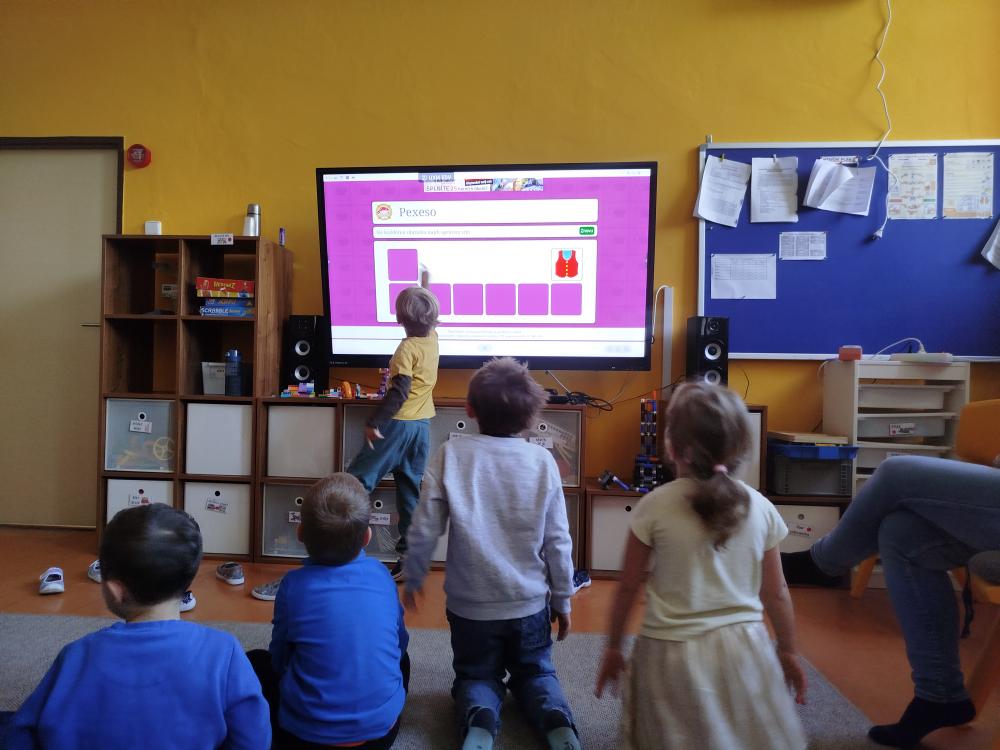 Minulý týden jsme s dětmi začali projektové vyučování "jablíčkobraní". Začali jsme tím, že si děti přinesly dvě jablíčka a ty jsme celý týden zkoumali. Učili jsme se pojmenovávat jeho části, ochutnávali jsme ho. A nyní jsou všechny naše činnosti zaměřené na jablíčka. V tělocvičně jsme cvičili s overbally jako s jablíčky, po žebřinách jsme si vyšplhali pro jablíčko. Z kaštanů, které jsme si sami nasbírali, jsme vytvořili jabloň na koberci. Bylo milé, že jsme se mohli podívat i k jedné babičce na zahradu, kde jsme měli jabloň přímo před sebou. Nezapomněli jsme ani na zámeckou zahradu, kde jsme pozorovali menší jablůňky. Činnosti ve třídě byly zaměřené na počítání s jablíčky, naučili jsme se písničku Koulelo se koulelo, nakreslili jsme si jablíčko temperovými barvami se sodou, jako experiment jsme na něj nakapali ocet a jablíčko nám šumělo. Červík nám prolezl jablíčkem - pomocí provázku, jsme mu udělali cestičky. Byli jsme rádi, že jsme mohli být i na interaktivní tabuli, kde jsme toho mnoho procvičili.