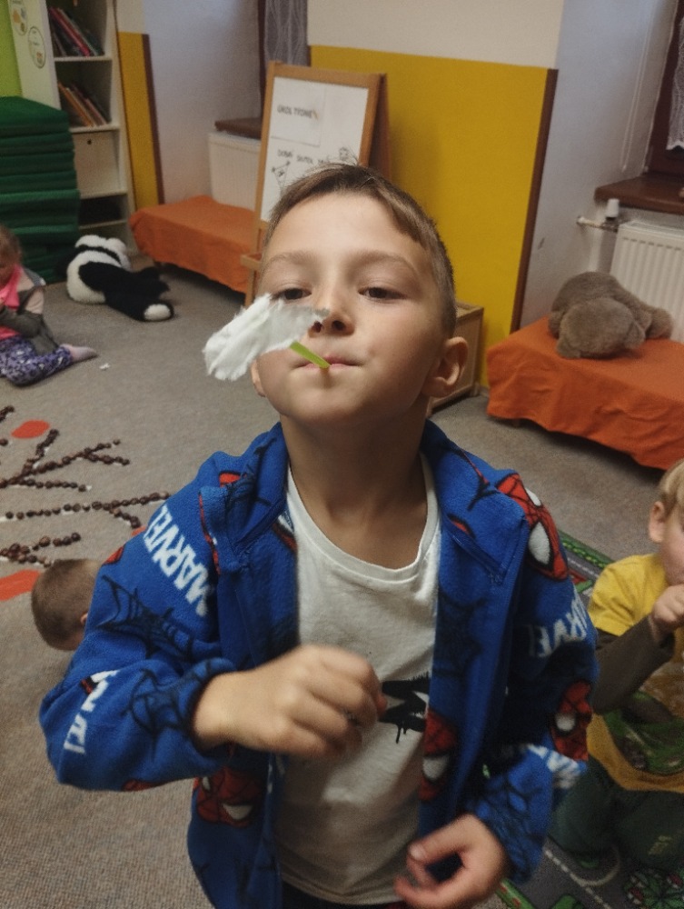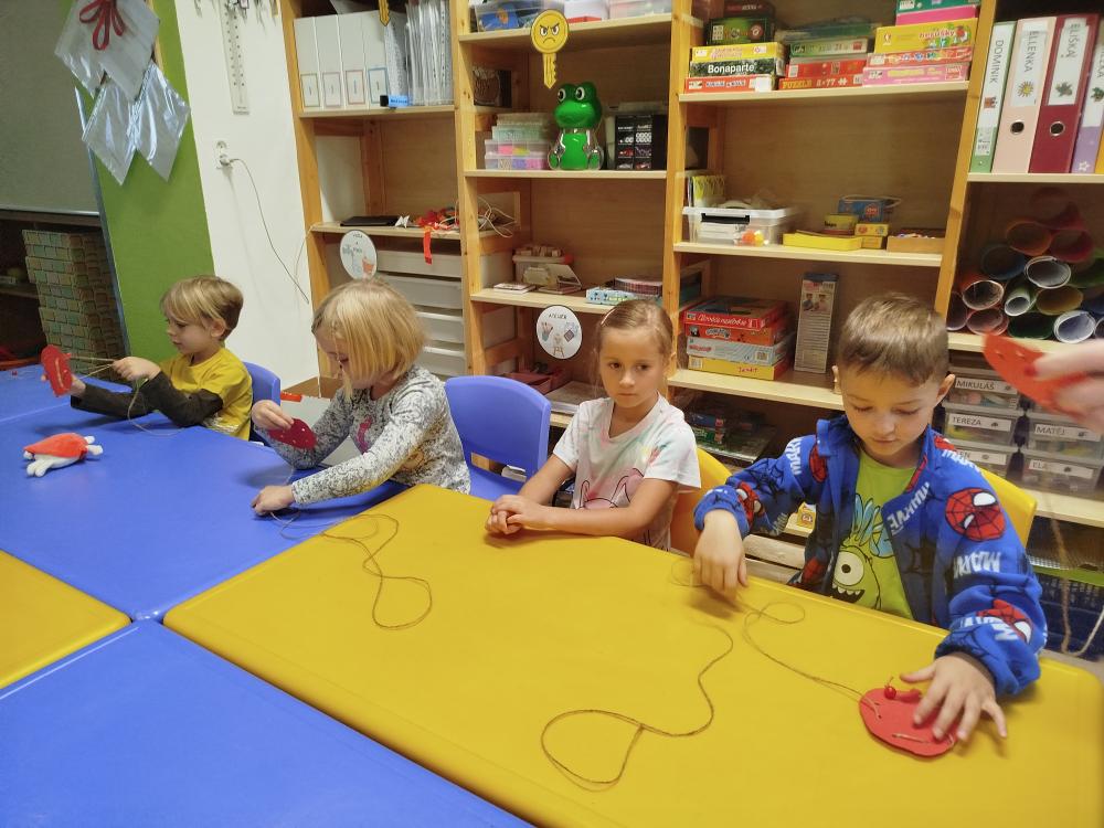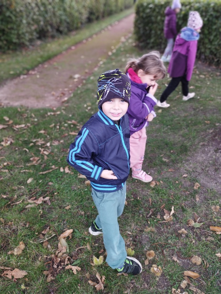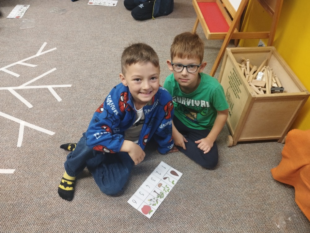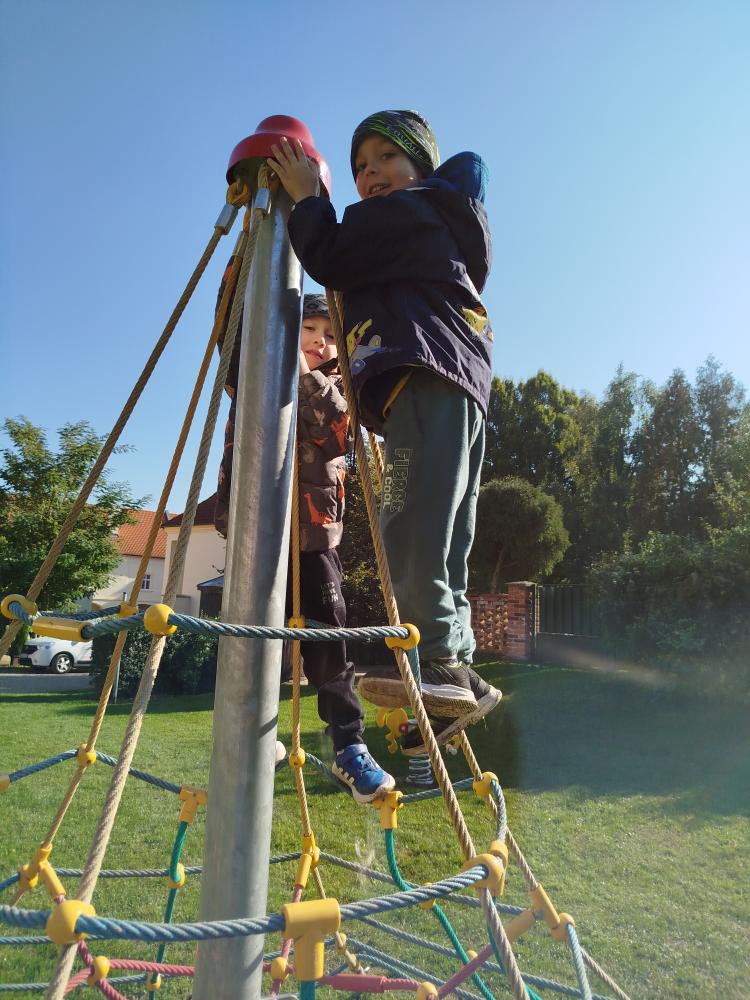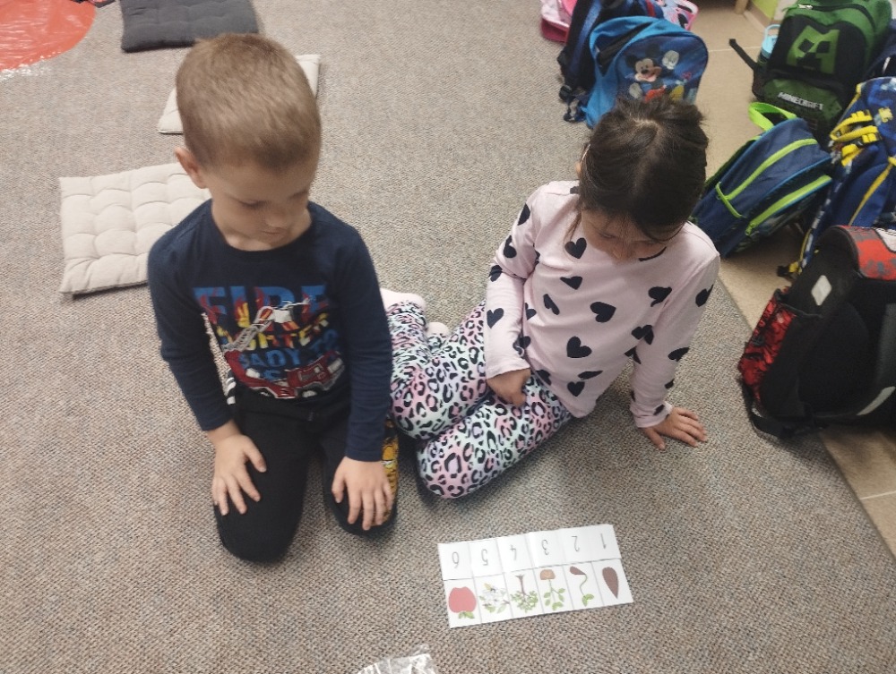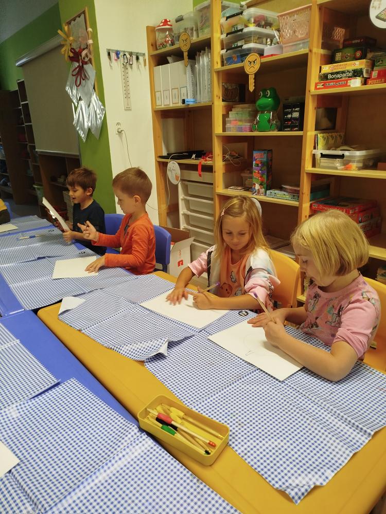 Minulý týden jsme s dětmi začali projektové vyučování "jablíčkobraní". Začali jsme tím, že si děti přinesly dvě jablíčka a ty jsme celý týden zkoumali. Učili jsme se pojmenovávat jeho části, ochutnávali jsme ho. A nyní jsou všechny naše činnosti zaměřené na jablíčka. V tělocvičně jsme cvičili s overbally jako s jablíčky, po žebřinách jsme si vyšplhali pro jablíčko. Z kaštanů, které jsme si sami nasbírali, jsme vytvořili jabloň na koberci. Bylo milé, že jsme se mohli podívat i k jedné babičce na zahradu, kde jsme měli jabloň přímo před sebou. Nezapomněli jsme ani na zámeckou zahradu, kde jsme pozorovali menší jablůňky. Činnosti ve třídě byly zaměřené na počítání s jablíčky, naučili jsme se písničku Koulelo se koulelo, nakreslili jsme si jablíčko temperovými barvami se sodou, jako experiment jsme na něj nakapali ocet a jablíčko nám šumělo. Červík nám prolezl jablíčkem - pomocí provázku, jsme mu udělali cestičky. Byli jsme rádi, že jsme mohli být i na interaktivní tabuli, kde jsme toho mnoho procvičili.